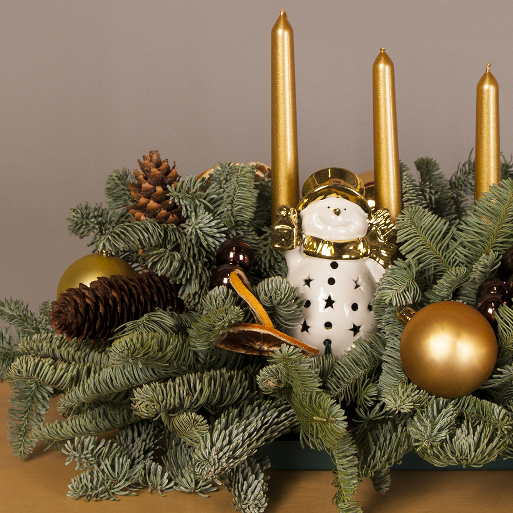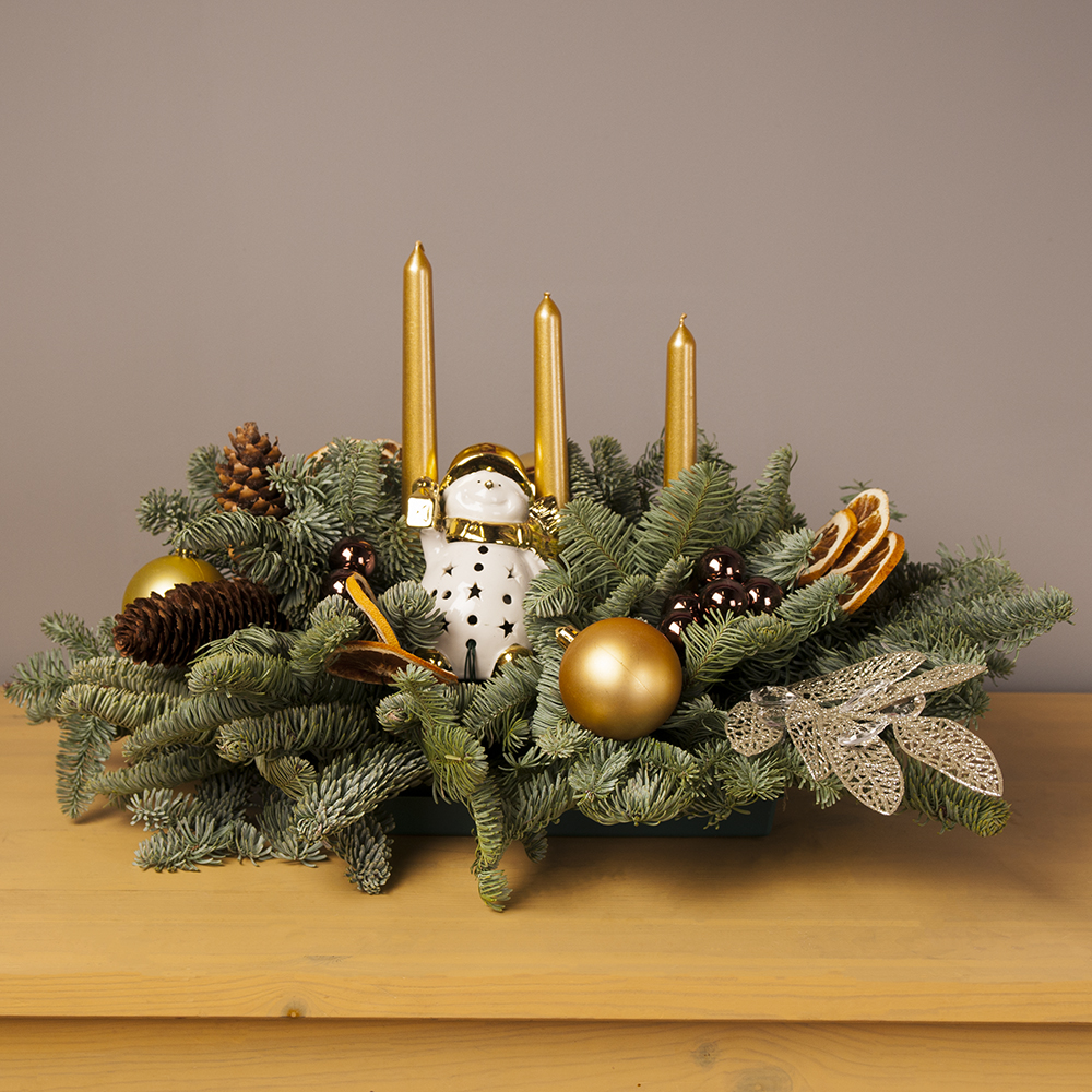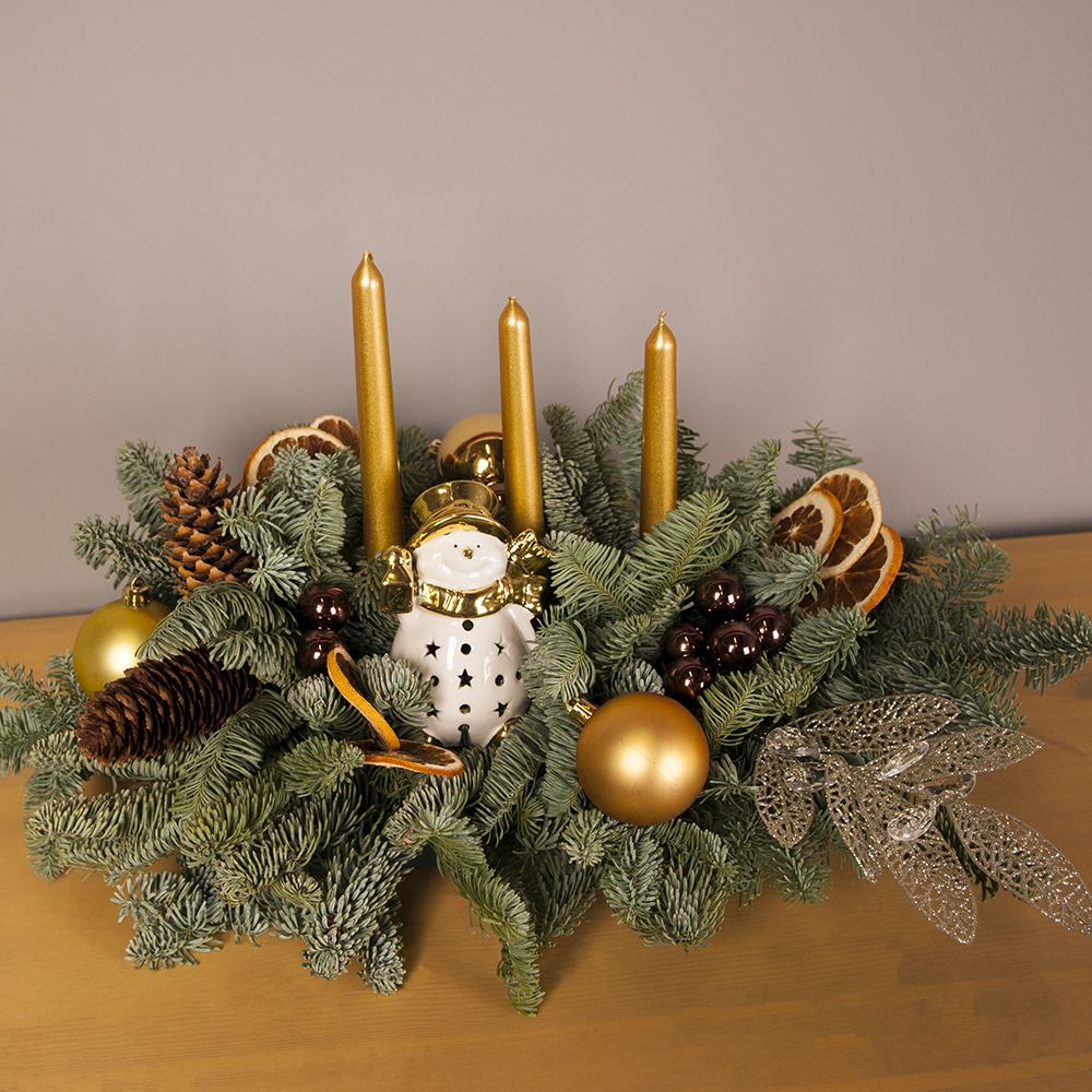 Состав композиции: нобилис 1.5, поддон, апельсин сушеный 7, шишка длинная 2, шар пластик 60мм 4, шар стекло 20мм 10, ветка на крючке 1, подсвечник Снеговик 1