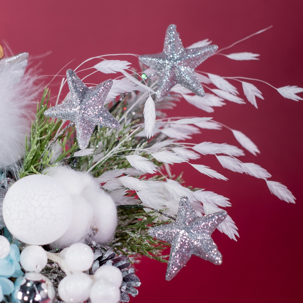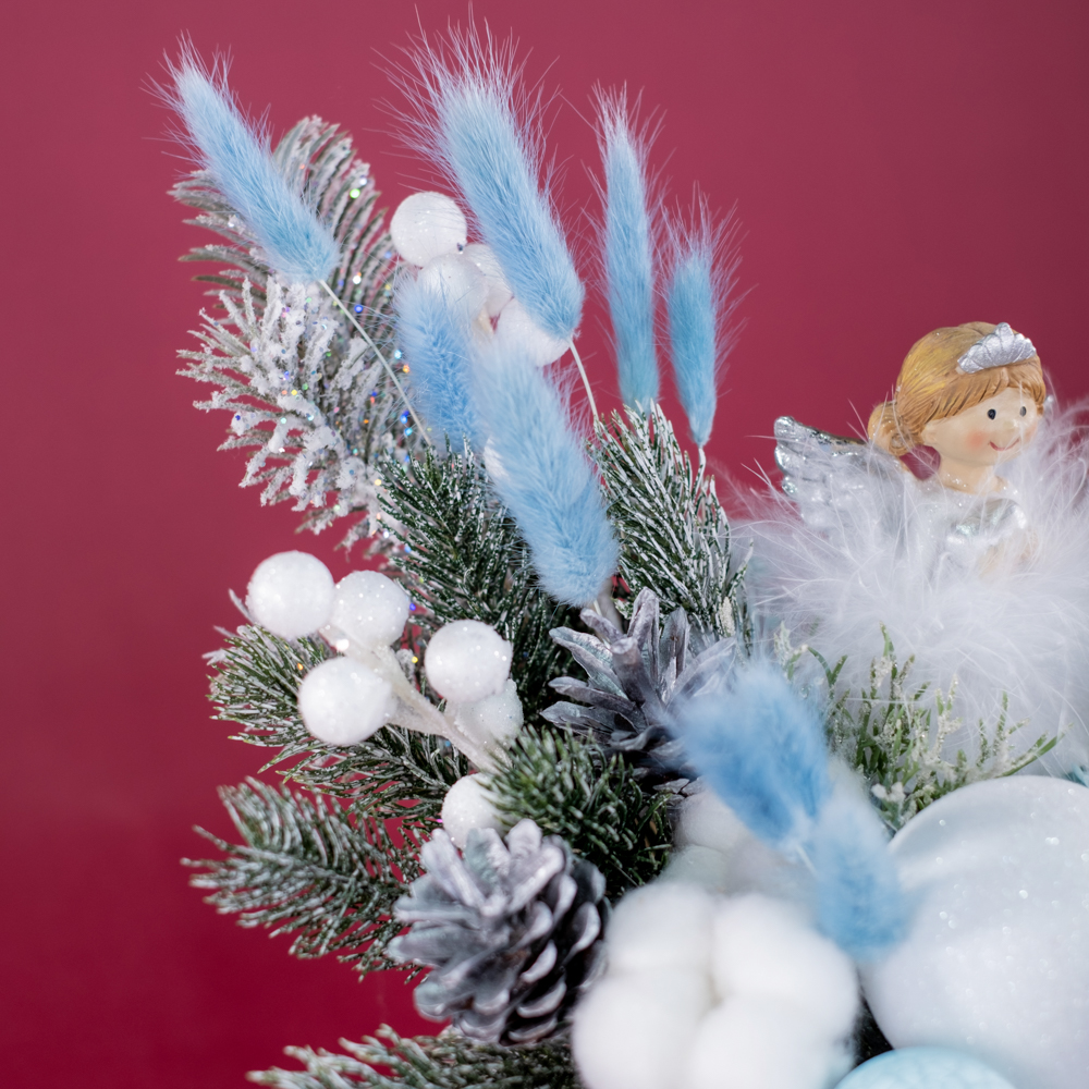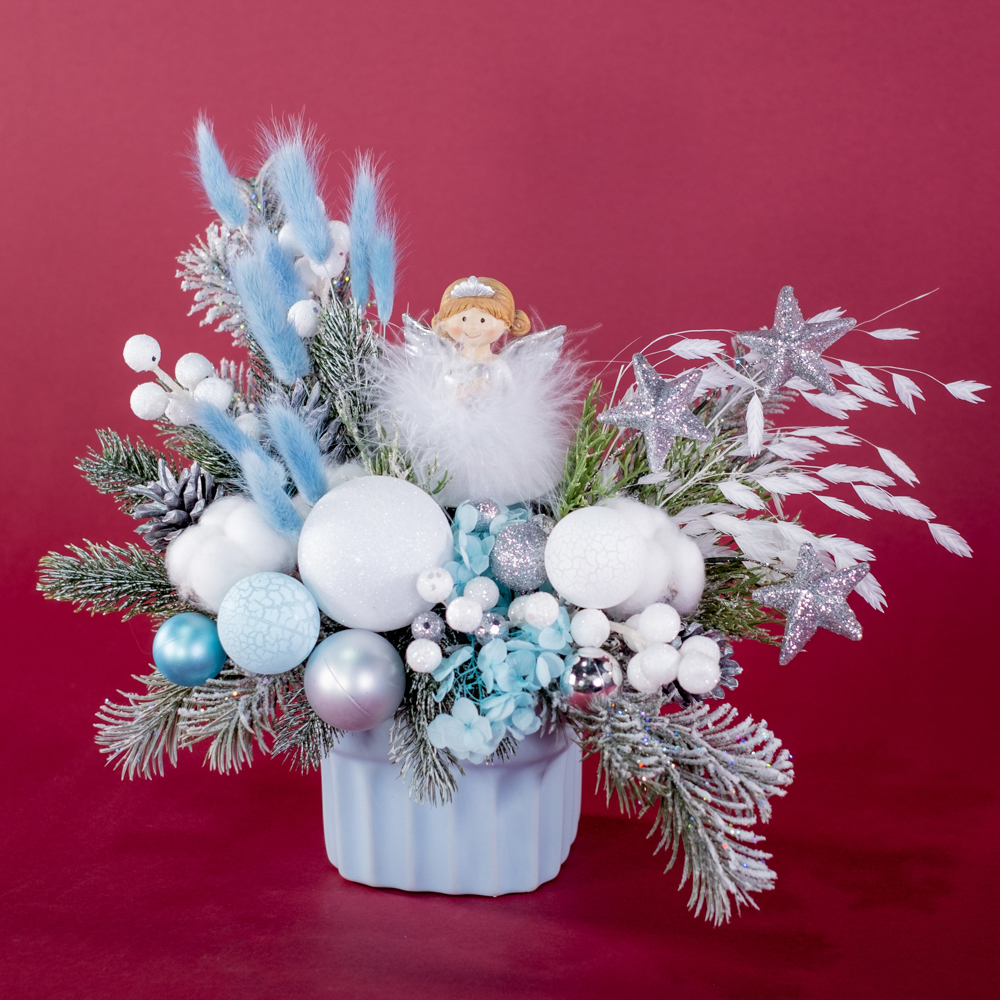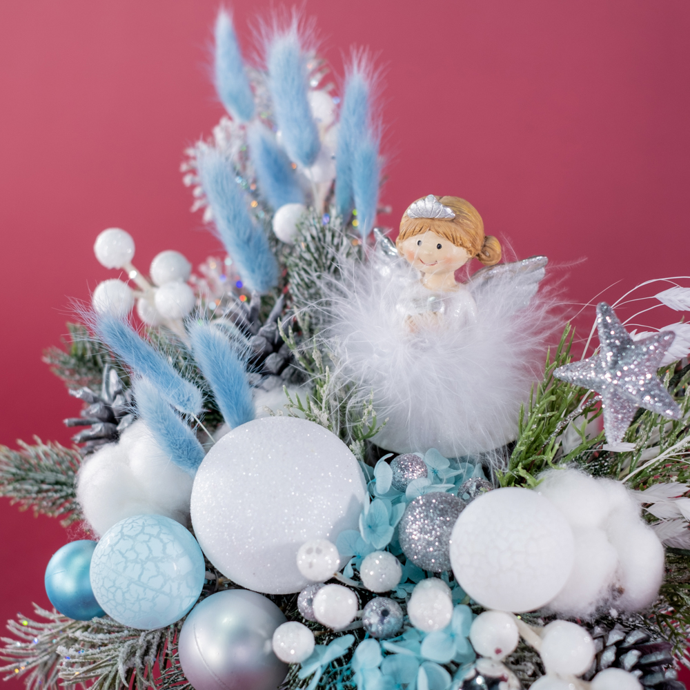 Состав композиции: нобилис, ёлочные украшения, сухоцветы, фигурка Ангел, оазис