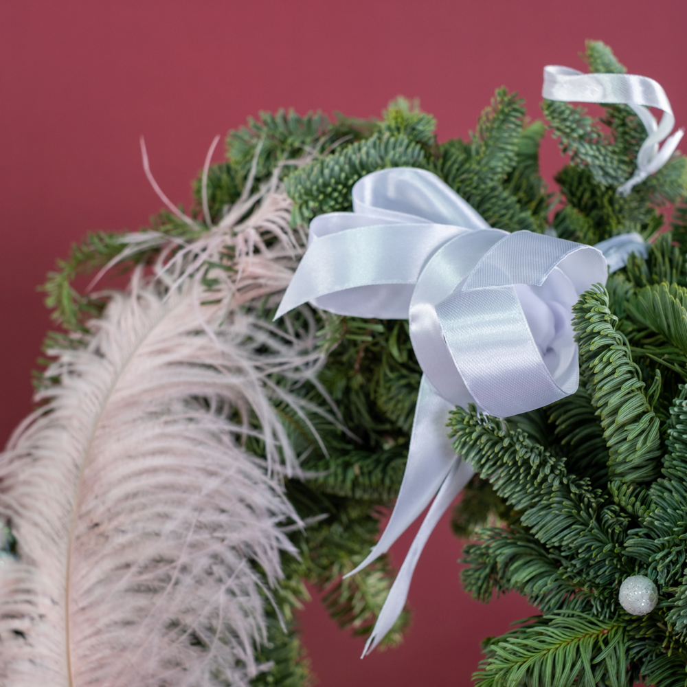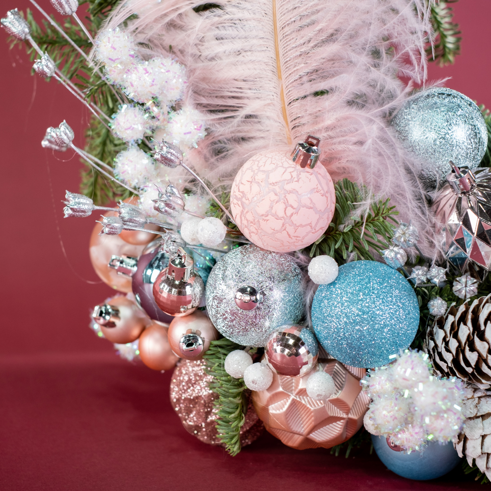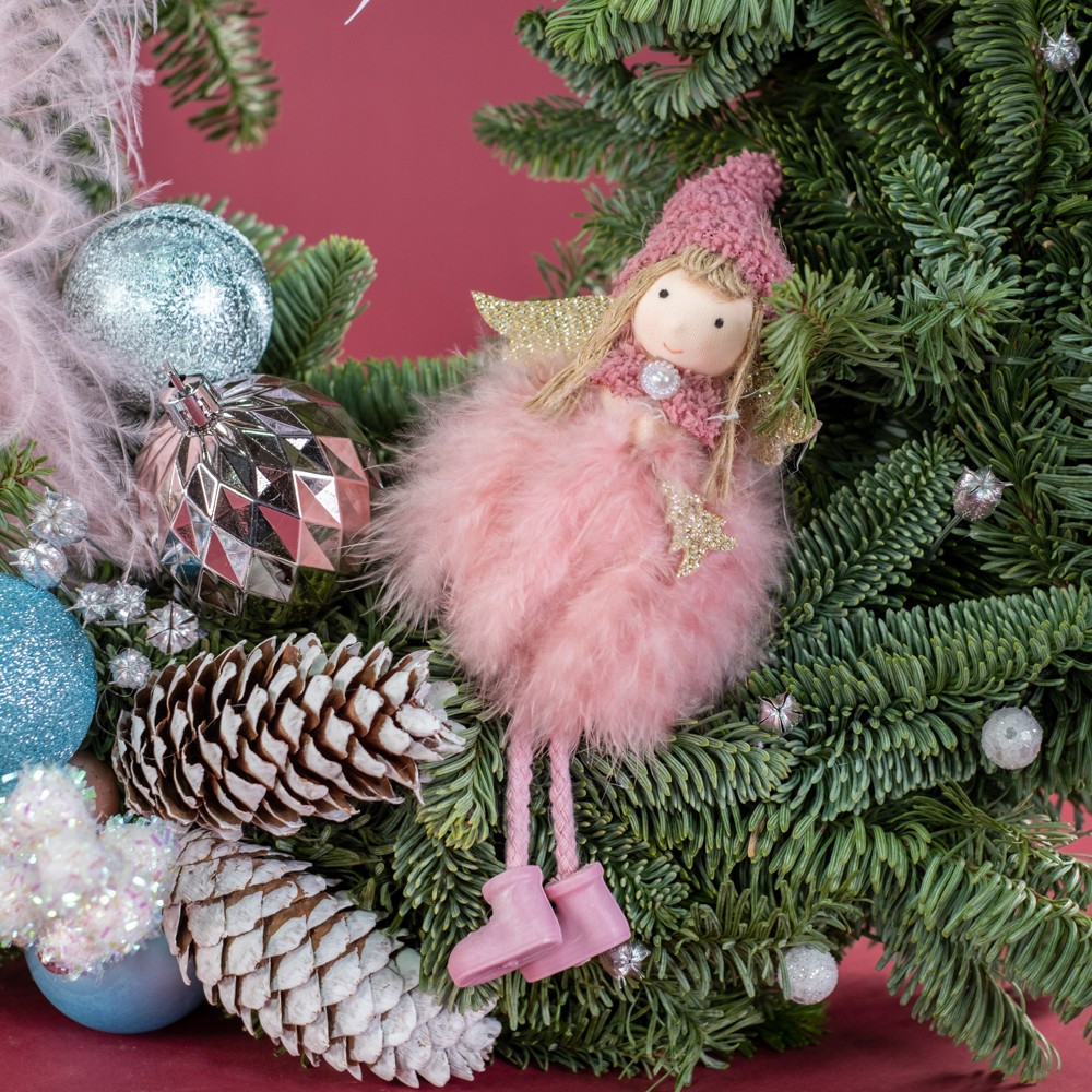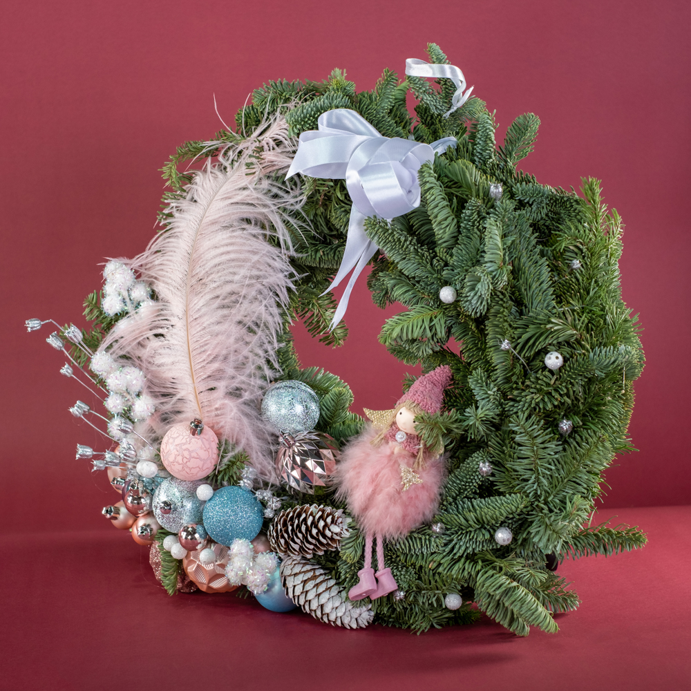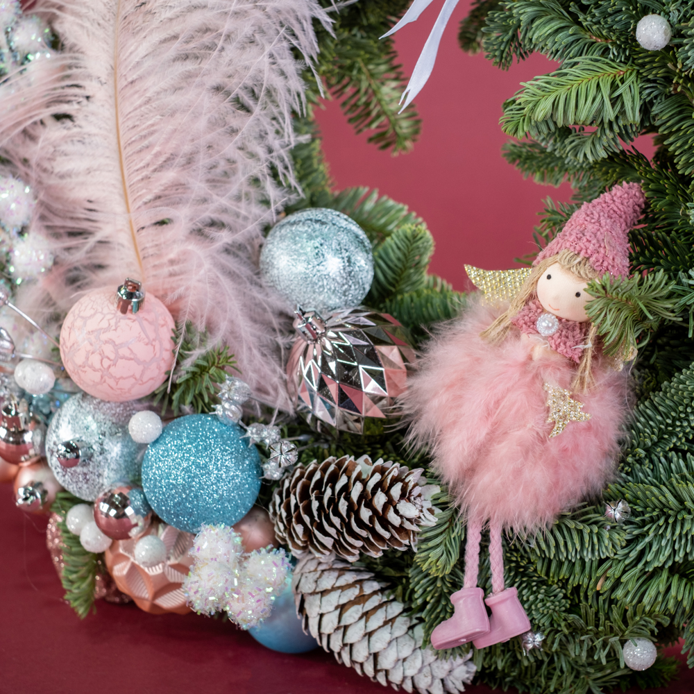 Состав композиции: нобилис, ёлочные украшения, игрушки, фигурка Ангелочка, перья, ленты
