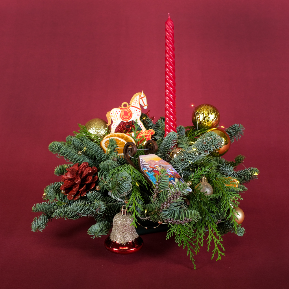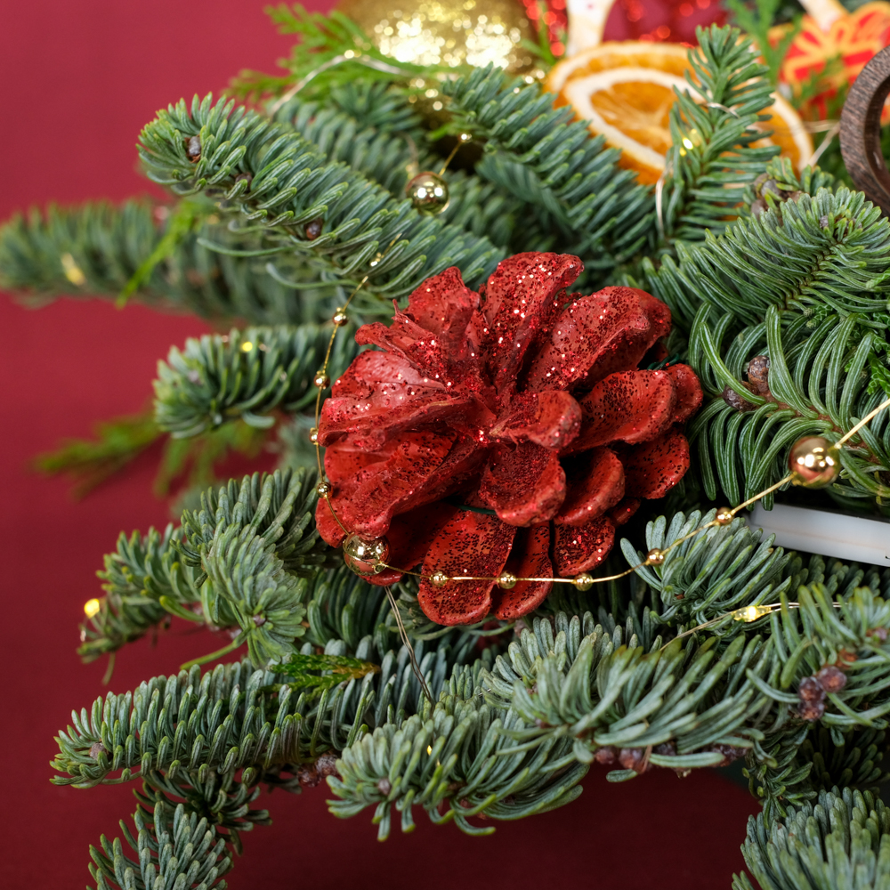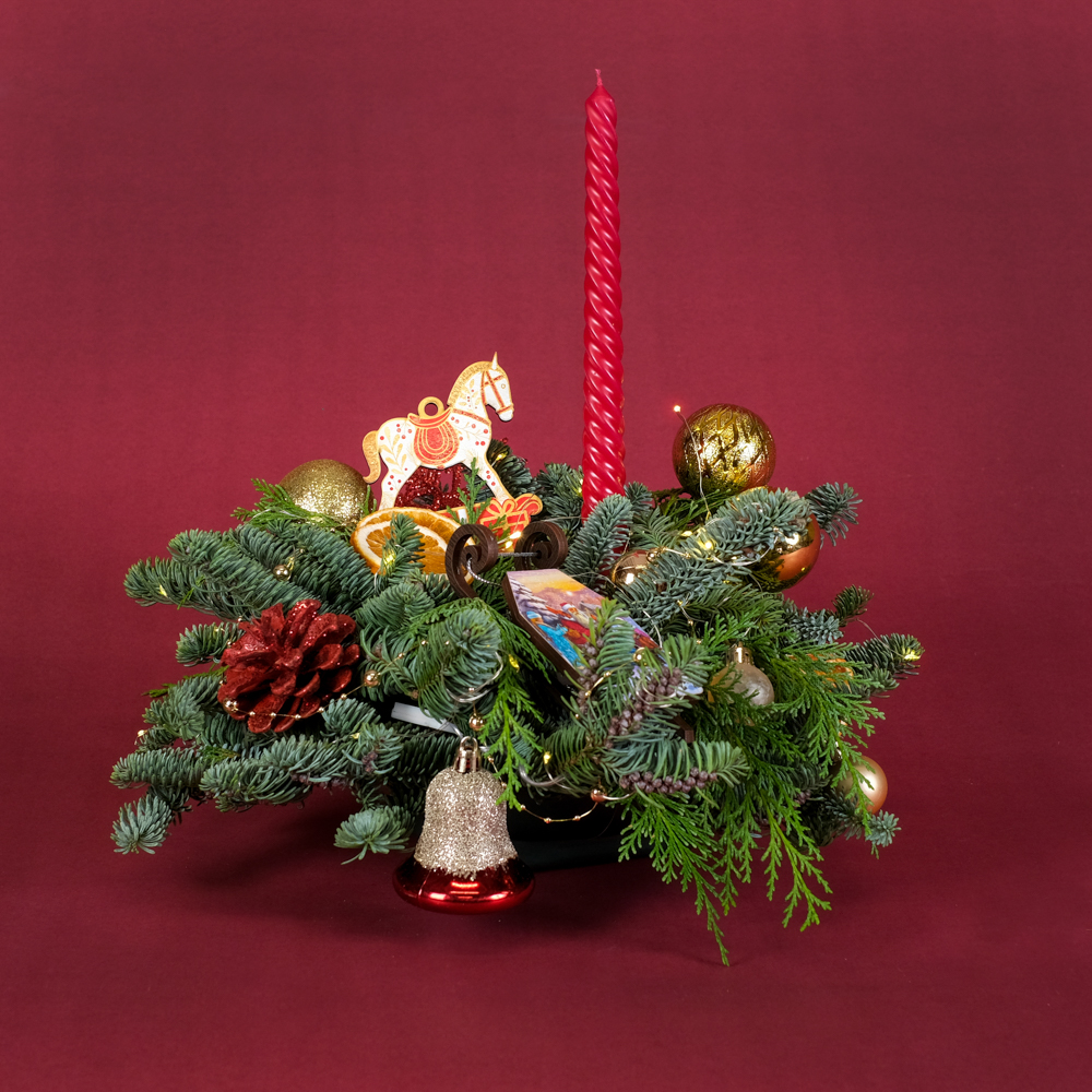 нобилис 1, туя 0,5, свеча витая 1, шар d2 3, шар d5 3, гирлянда роса 5 м 1, подвеска саночки 1, шишка в глиттере 1, бусы жемчужные 0,1, подвеска конь 1, колокольчик 1, апельсин сушеный 4, снежинка 1, оазис, коробка, тишью