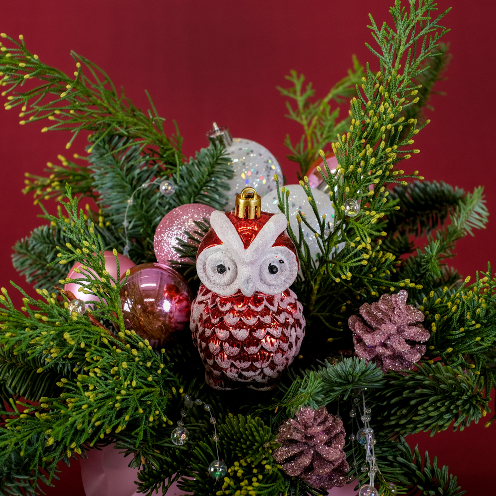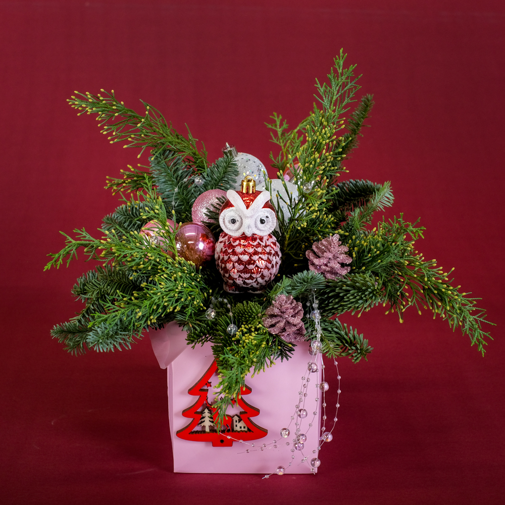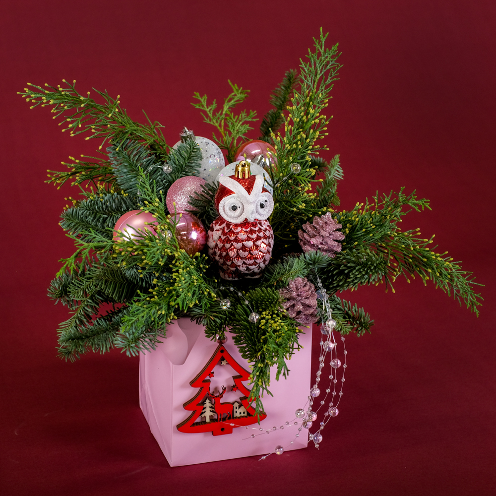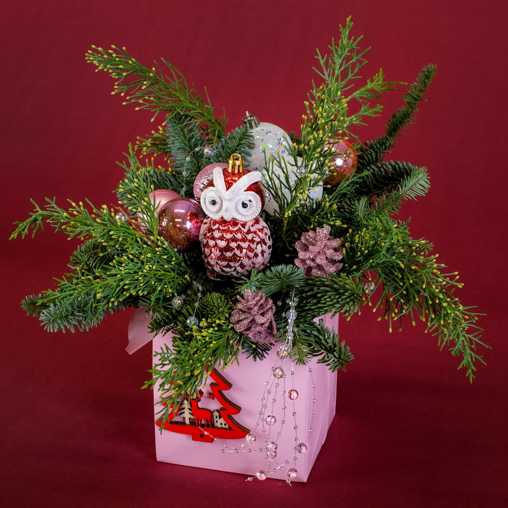 украшение сова 1, шар 2, подвеска 1, ветка с глиттером 2, бусы 0,2 шар 4, можжевельник 0,5, нобилис 0,5, сумочка, оазис 1