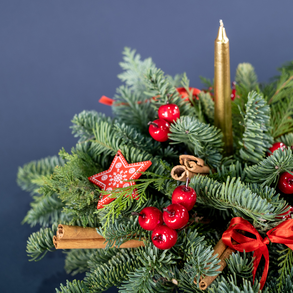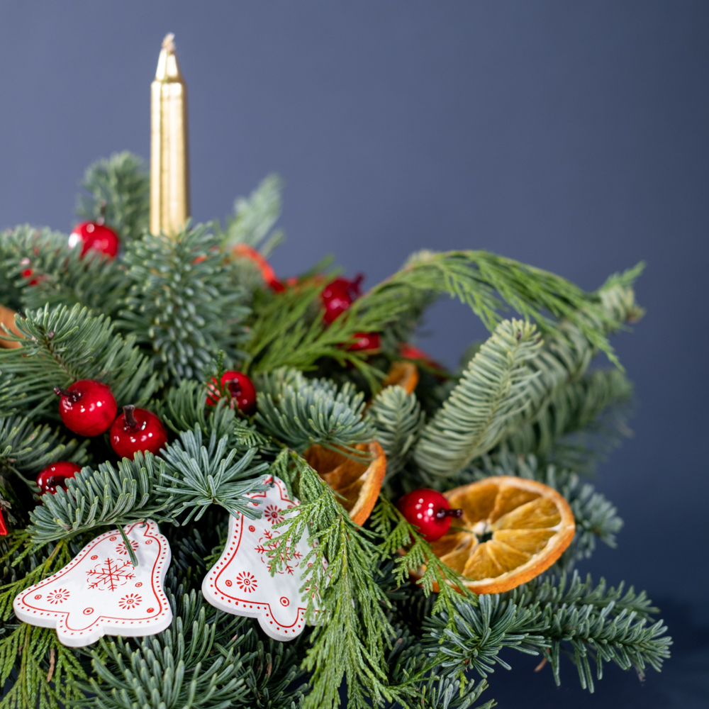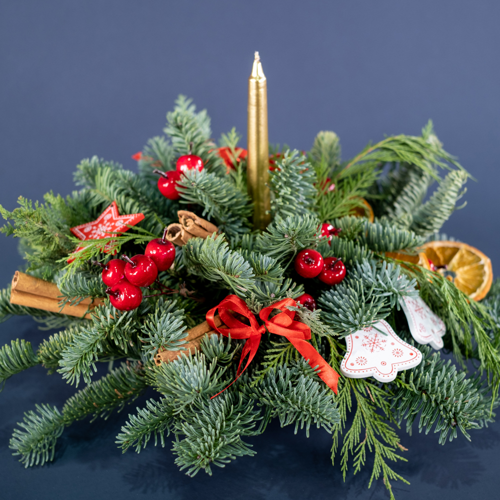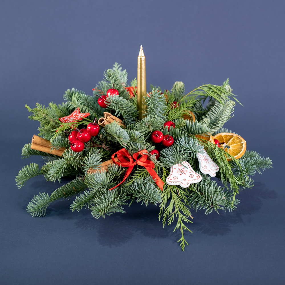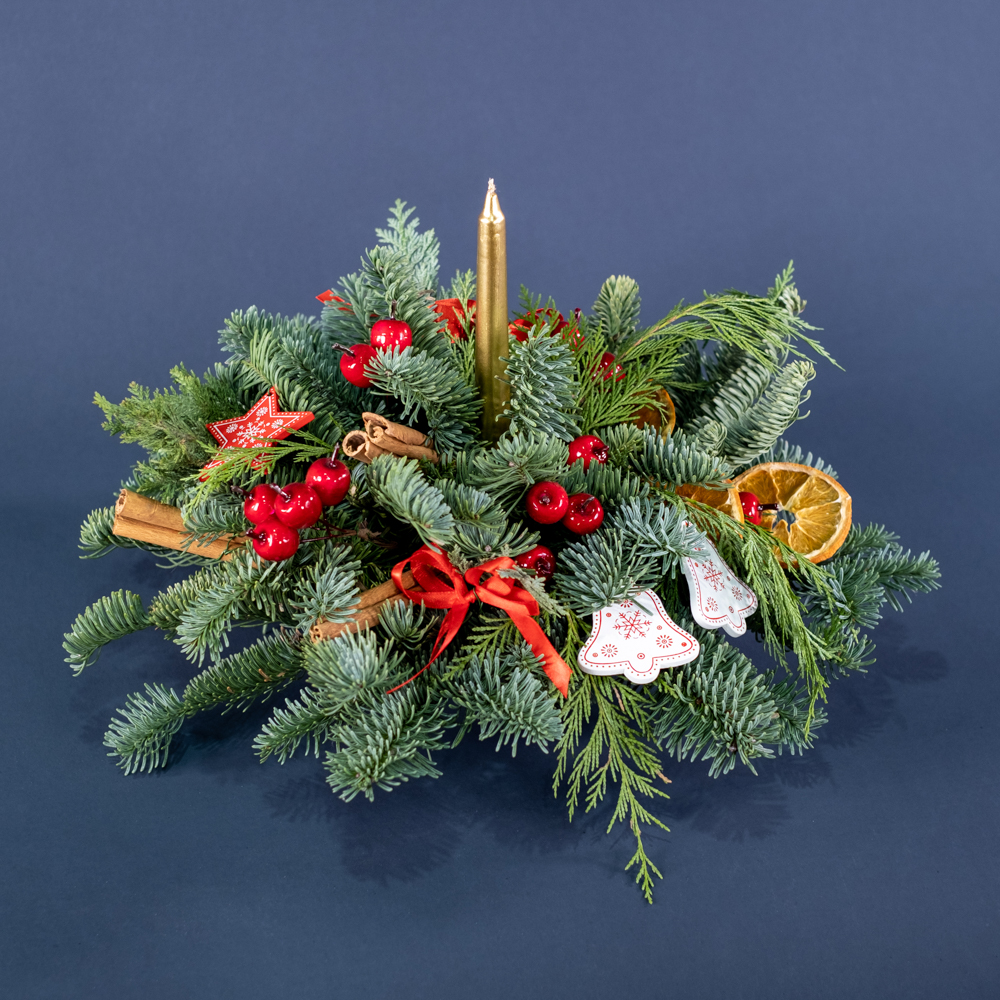 Состав композиции: свеча, сушеный апельсин, палочки корицы, нобилис, туя, оазис, горшок, украшения