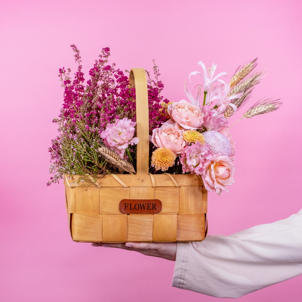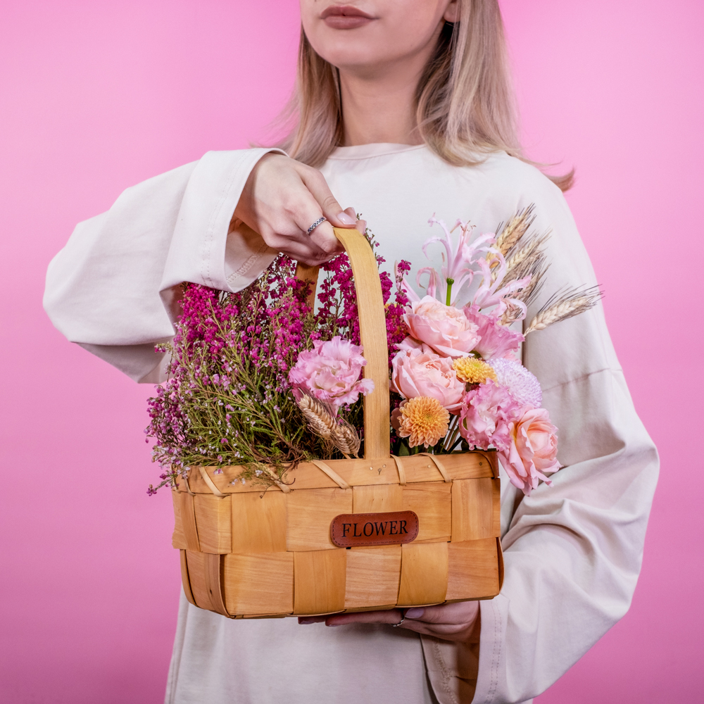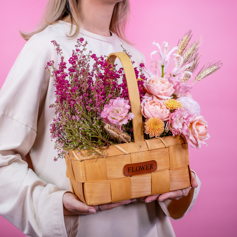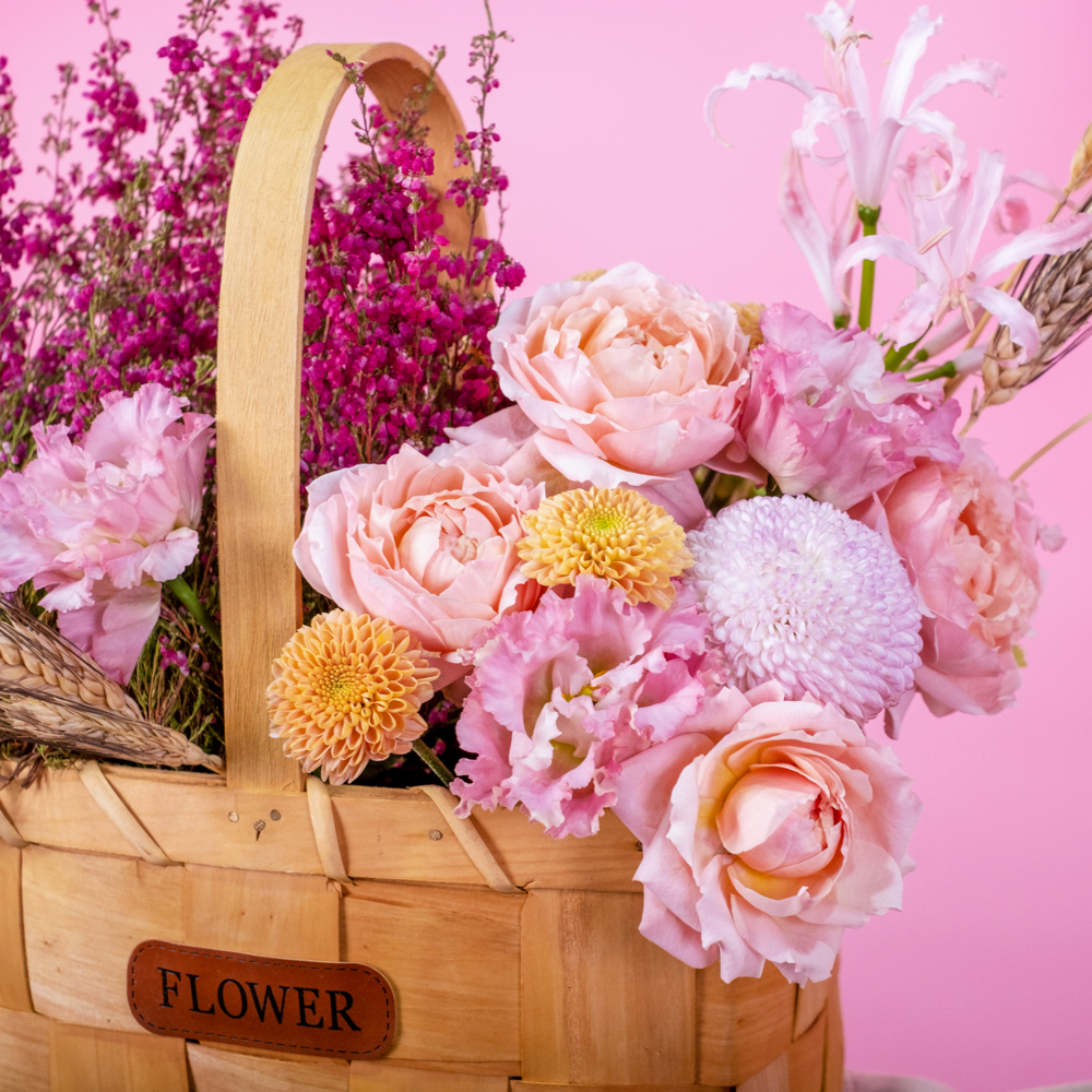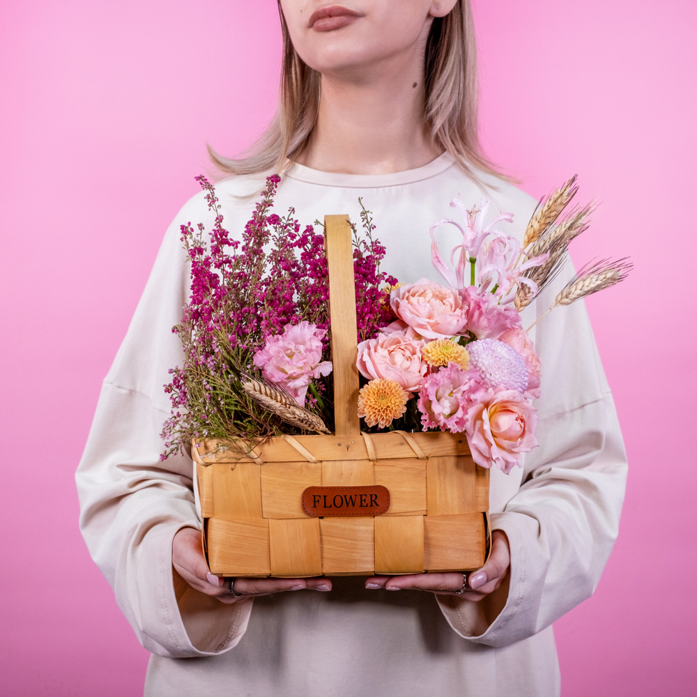 Состав композиции: роза кустовая 1, нерине 1, рускус 1, оазис 1, эрика 1, лагурус 6, хризантема сантини 2, эустома 1, хризантема стандартная 1, оазис 1, корзина