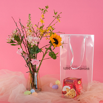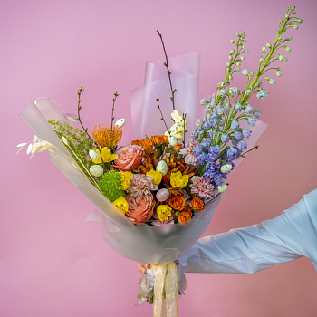 аспарагус - 1, лагурус - 9, нарцисс - 11, ранункулюс - 3, ветка персика - 1, цыплята в гнезде - 1, Яйцо набо 12шт - 5, оазис - 2, корзина