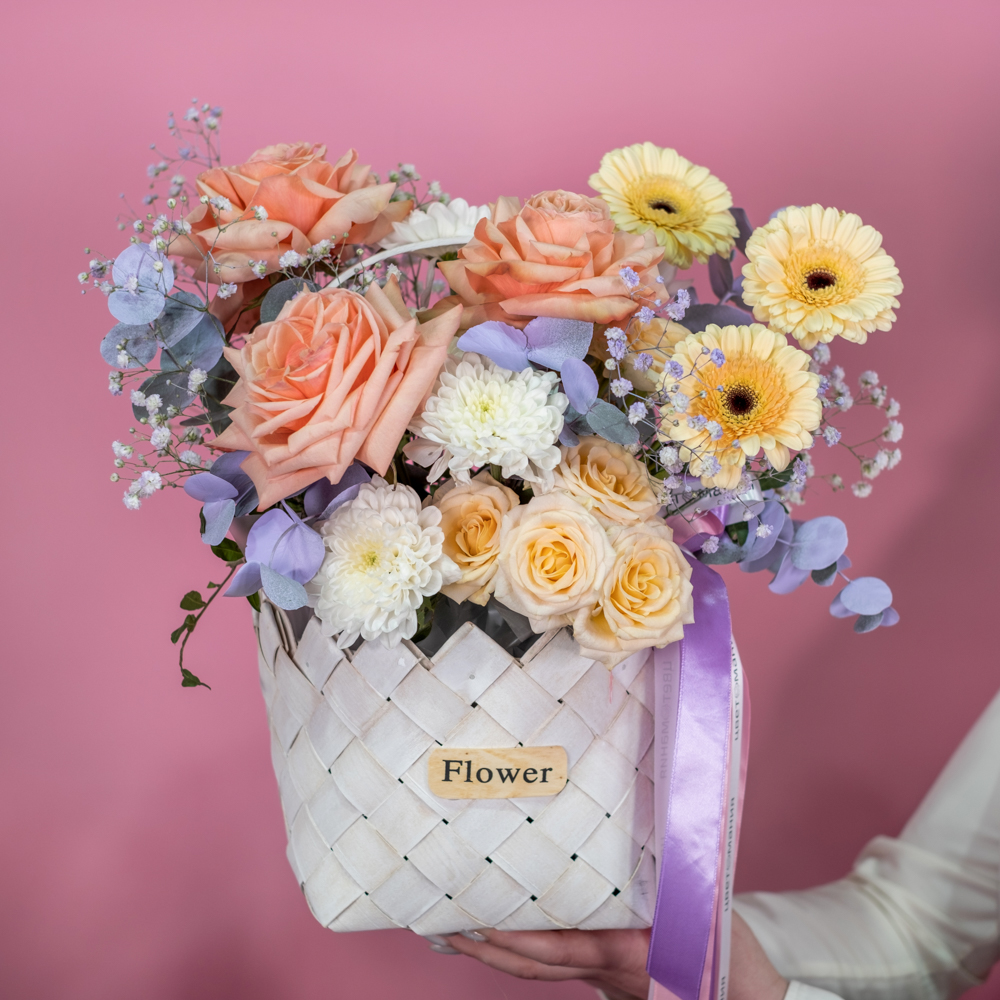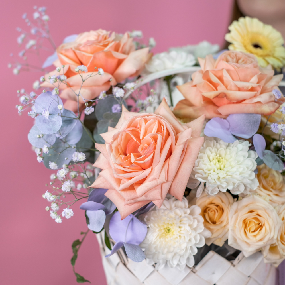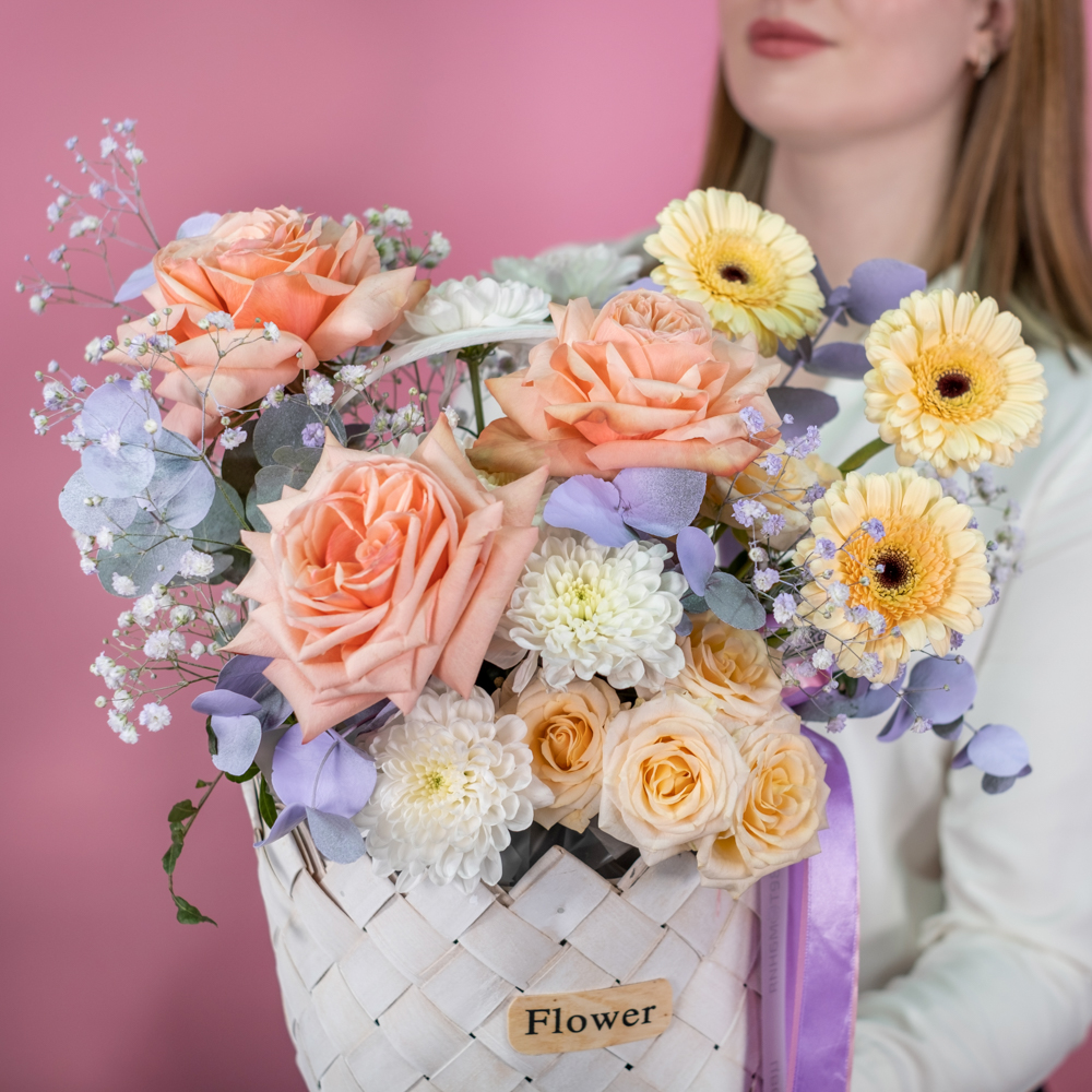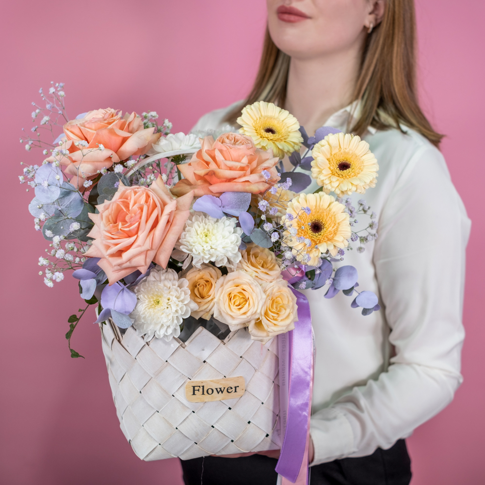 французская роза 3, гербера мини 3, хризантема кустовая 1, роза кустовая 2, гипсофила 1, эвкалипт 1, пистач 2, краска 0,3, корзина, лента, оазис