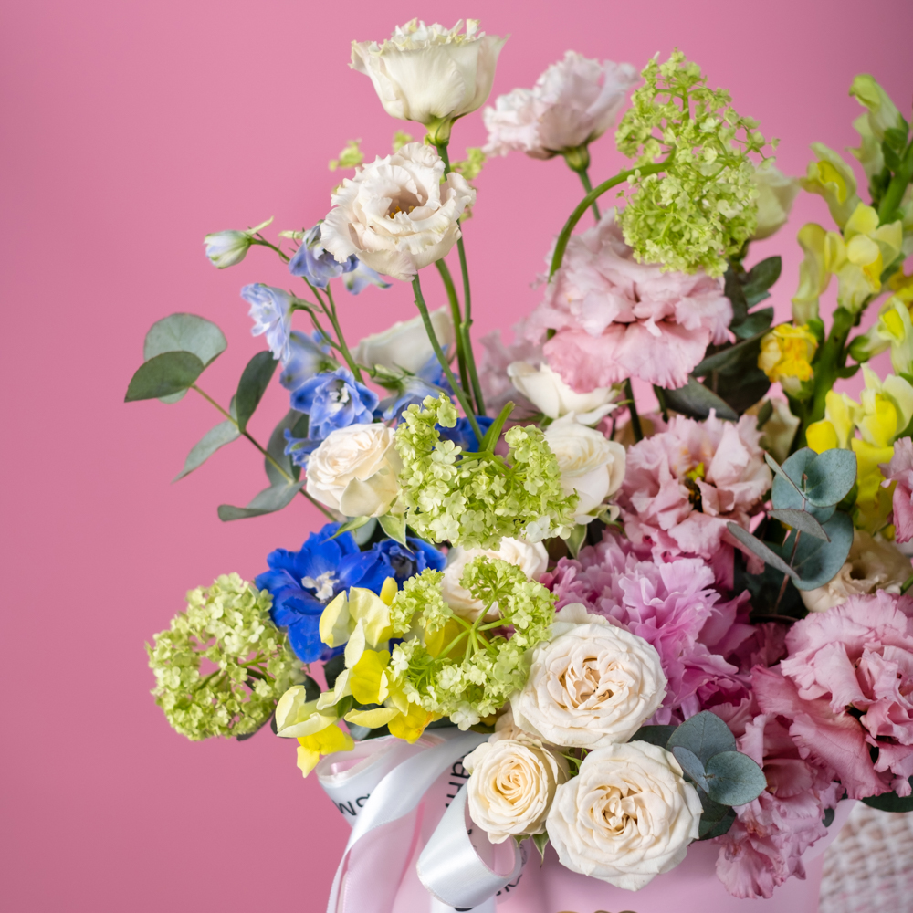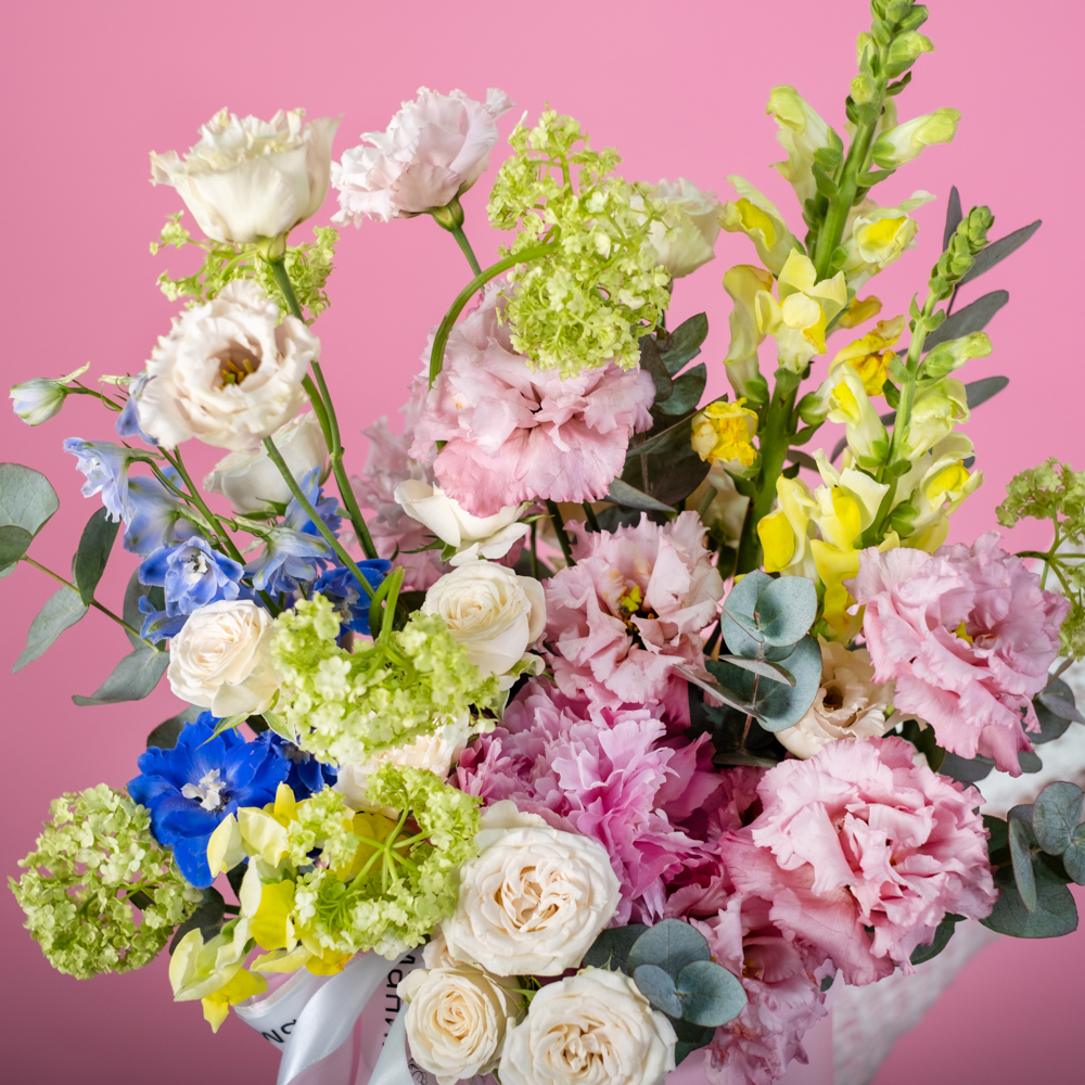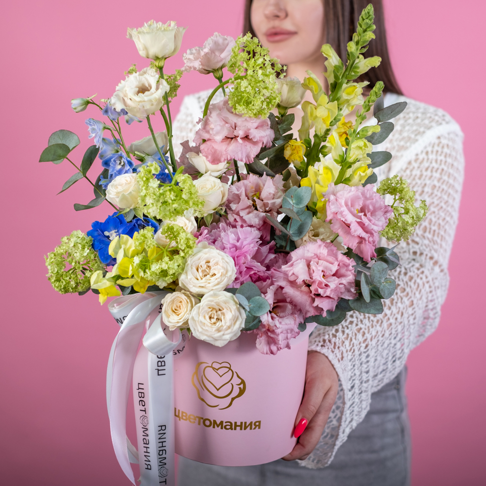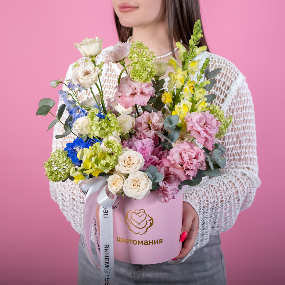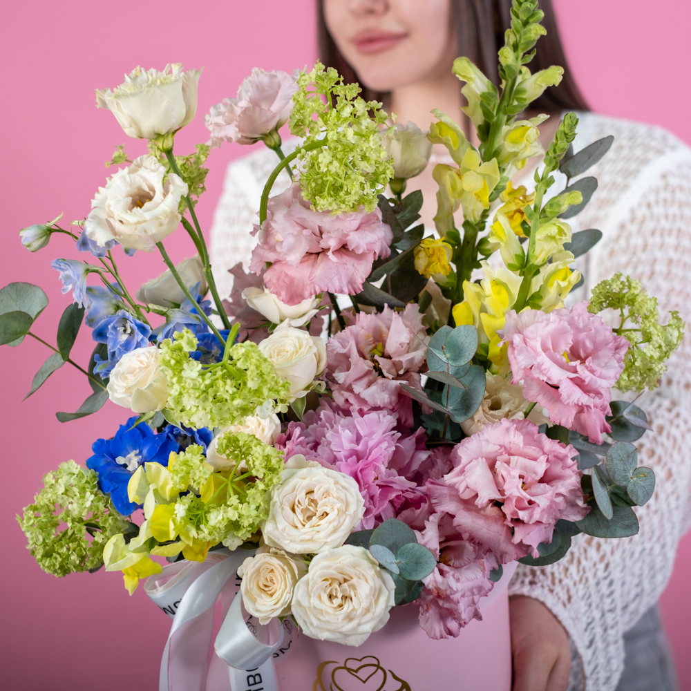 пион 1, дельфиниум 1, роза кустовая 2, антирринум 3, эустома 3, вибурнум 1, эвкалипт цинерея 0,5, шляпная коробка, оазис, лента