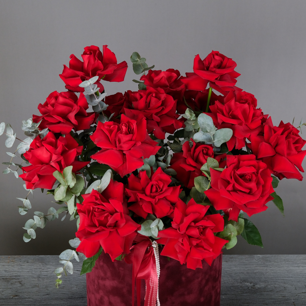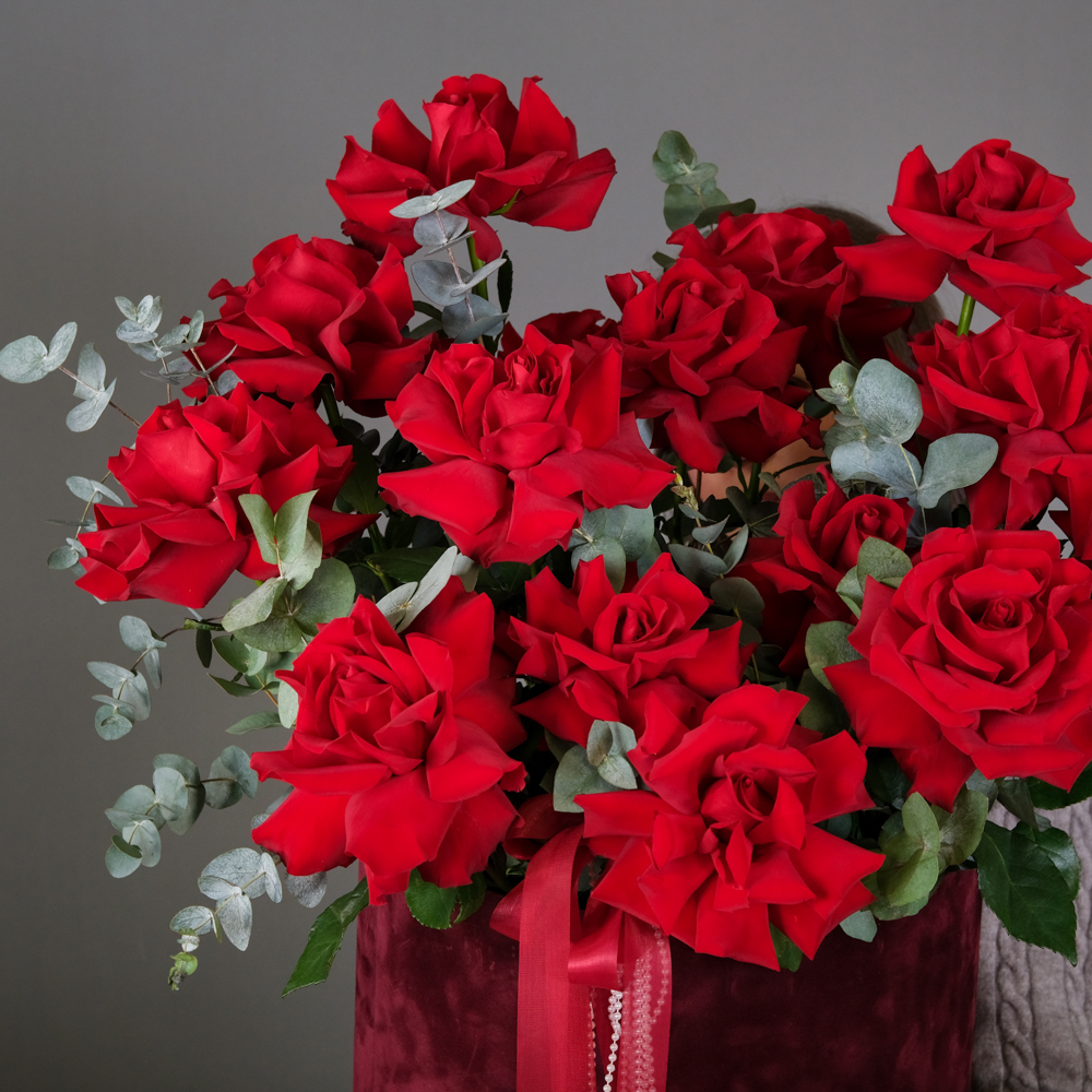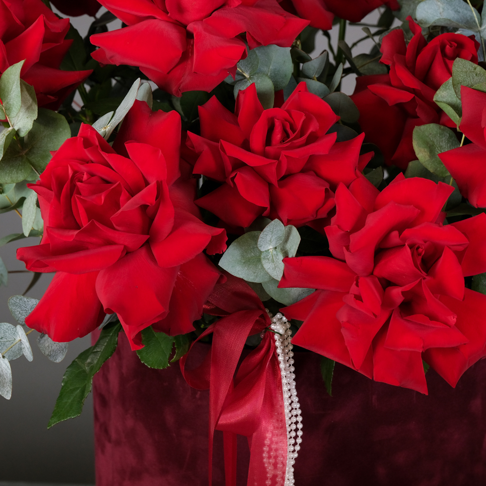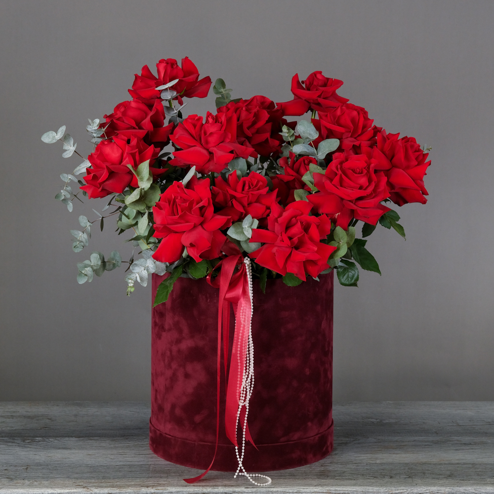 французская роза 17, эвкалипт 6, пистач 10, бусы 0,2, шляпная коробка бархат, оазис, пленка, лента