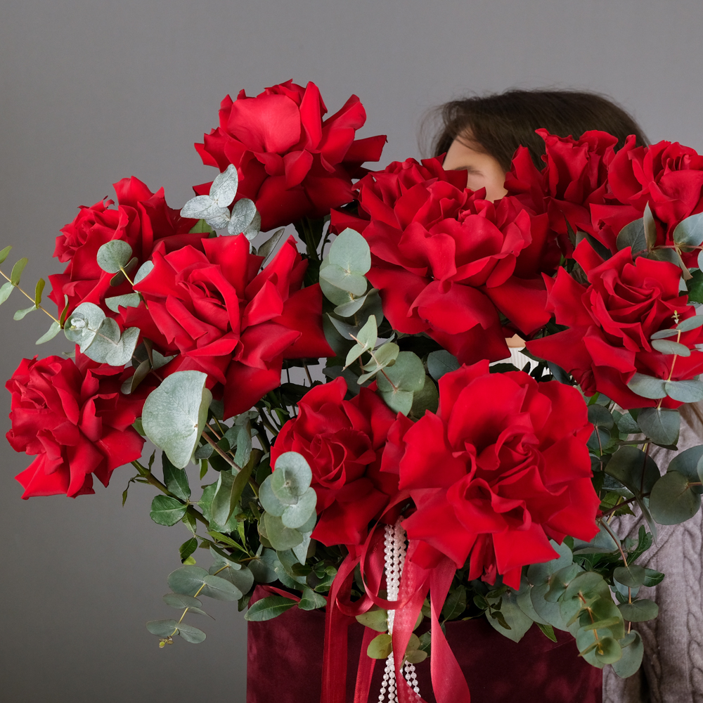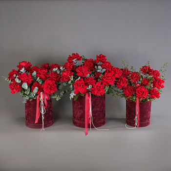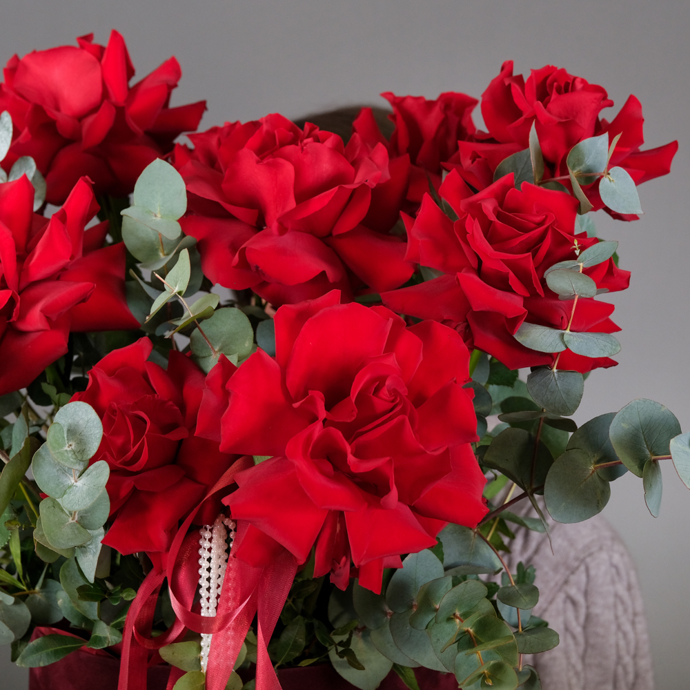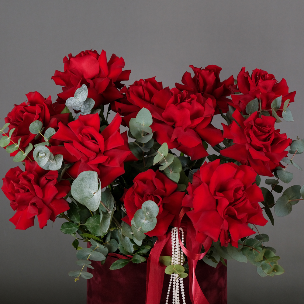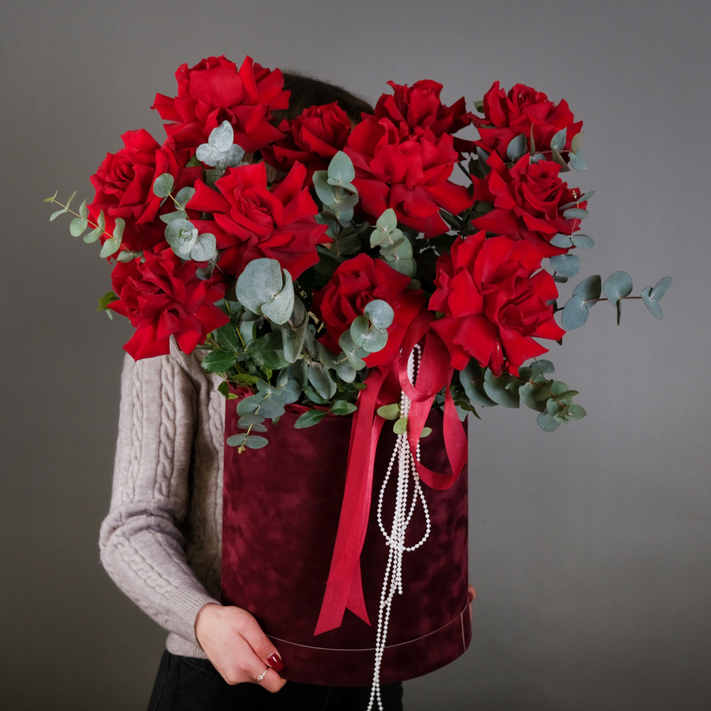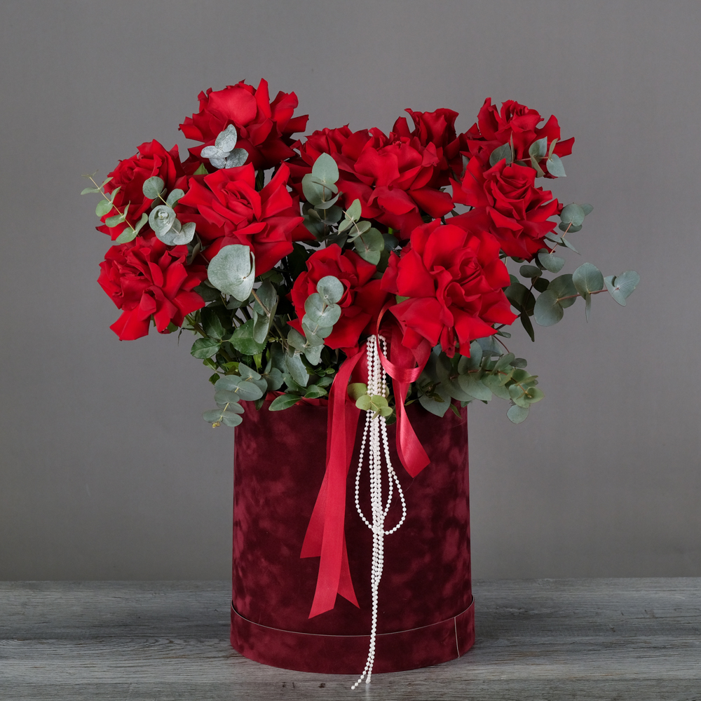 французская роза 15, эвкалипт 5, пистач 7, бусы 0,2, шляпная коробка бархат, оазис, пленка, лента