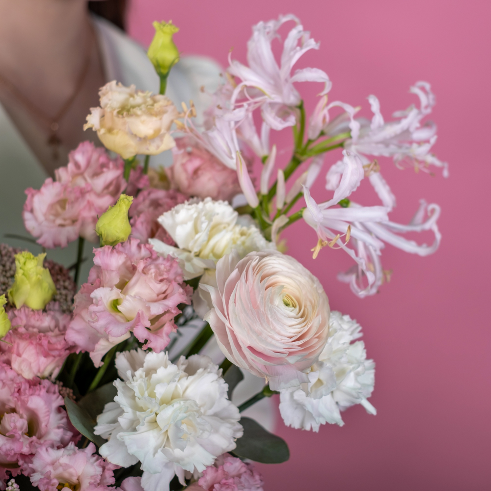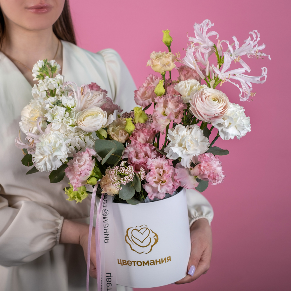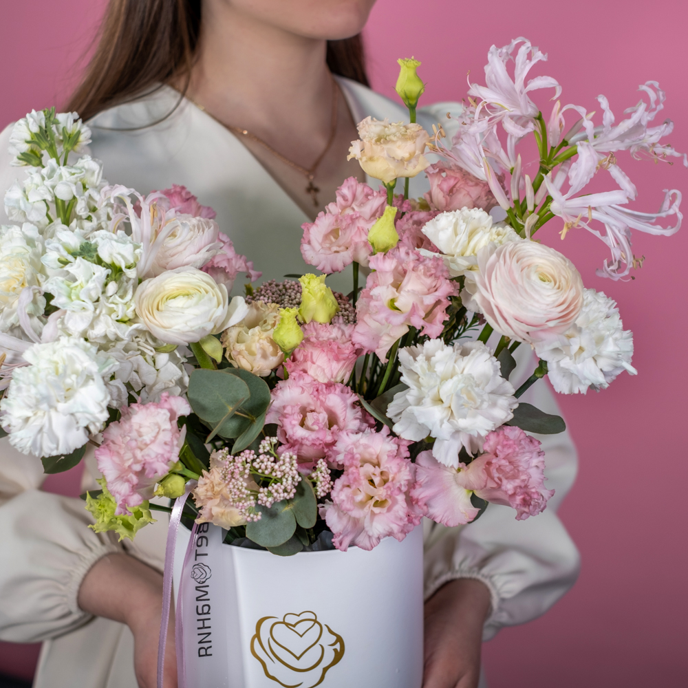маттиола 2, гвоздика 5, нерине 3, ранункулюс 3, эустома 4, озотамнус 1, эвкалипт 1, лента, коробка, оазис 3