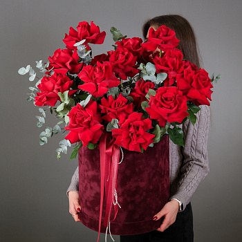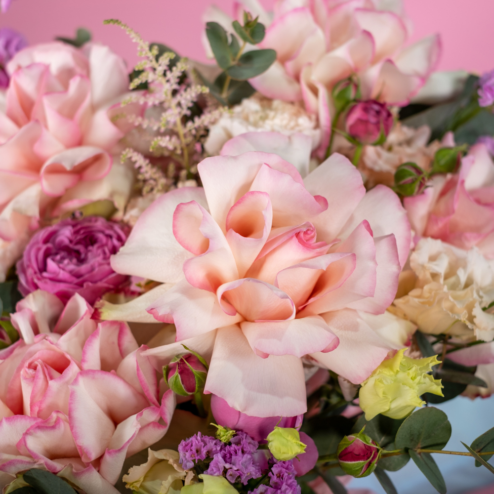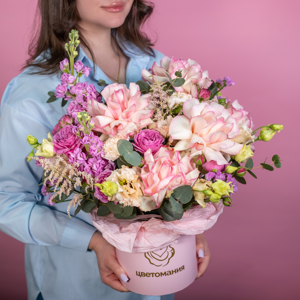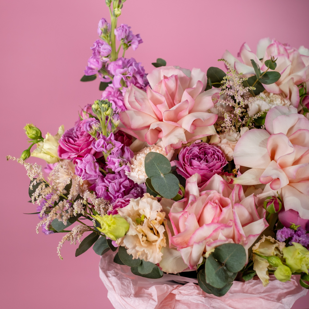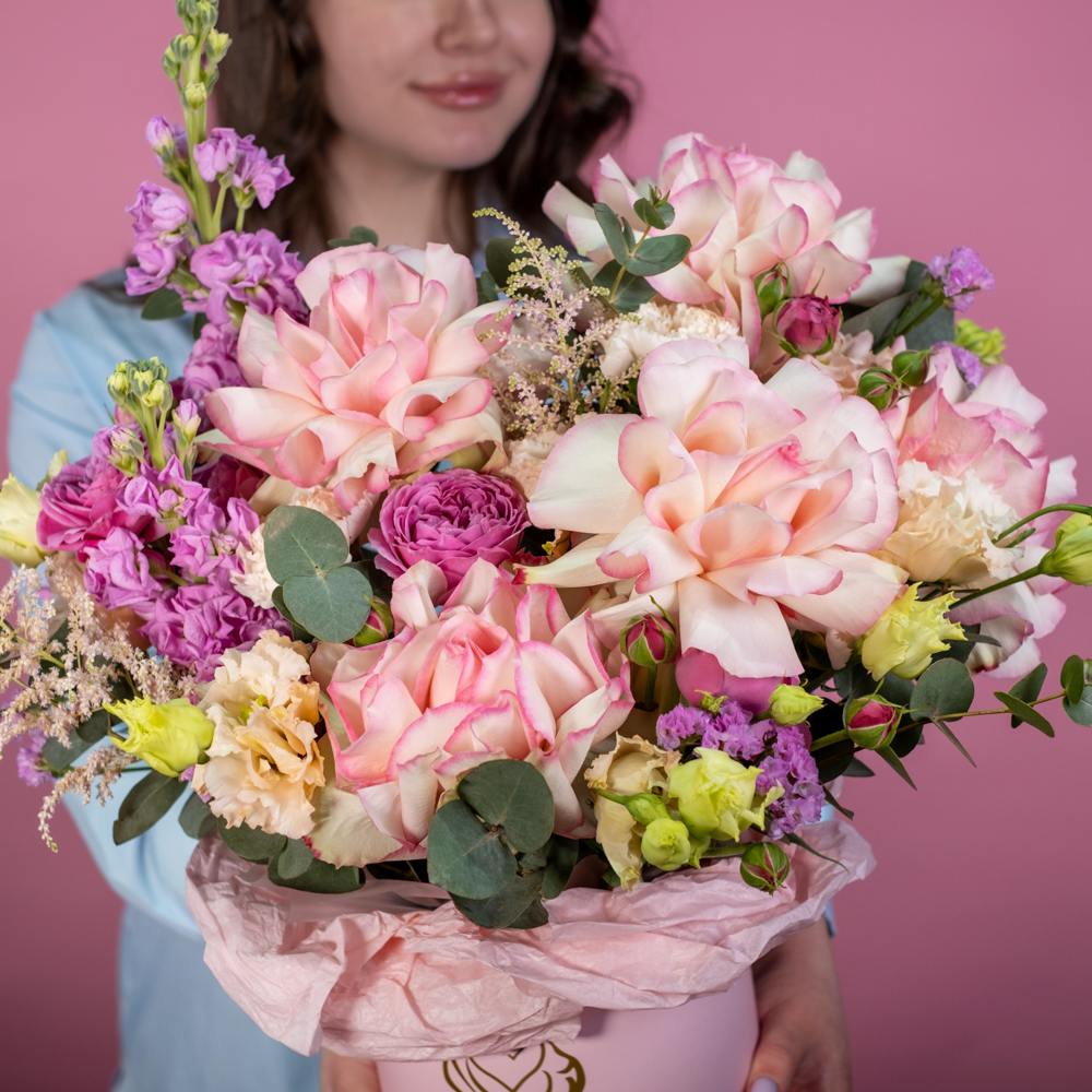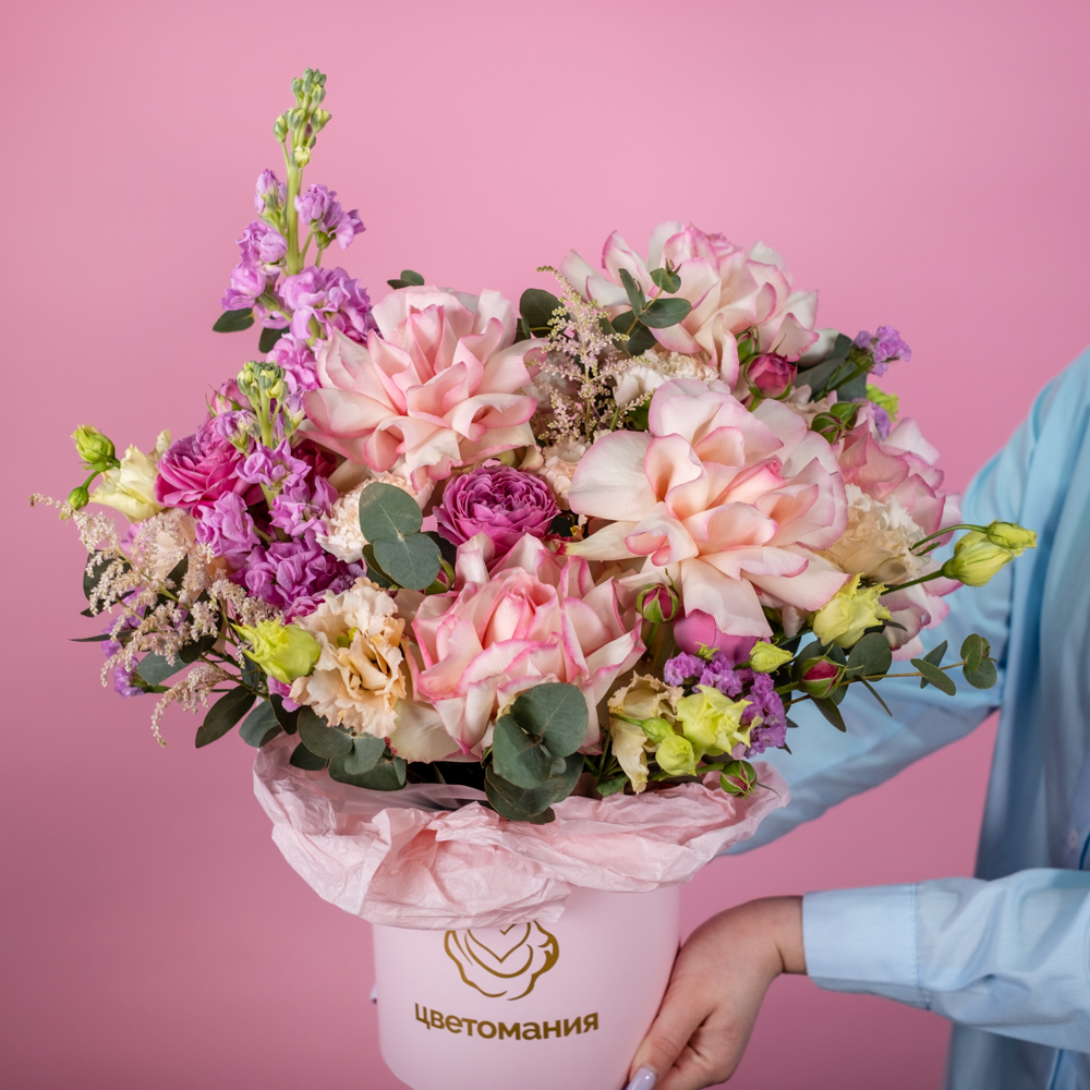 роза кустовая мисти бабблс 2, маттиола 2, эустома 2, статица 1, эвкалипт 1, французская роза 5, гвоздика 3, пистач 2, астильба 3, коробка шляпная 1, оазис 3