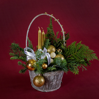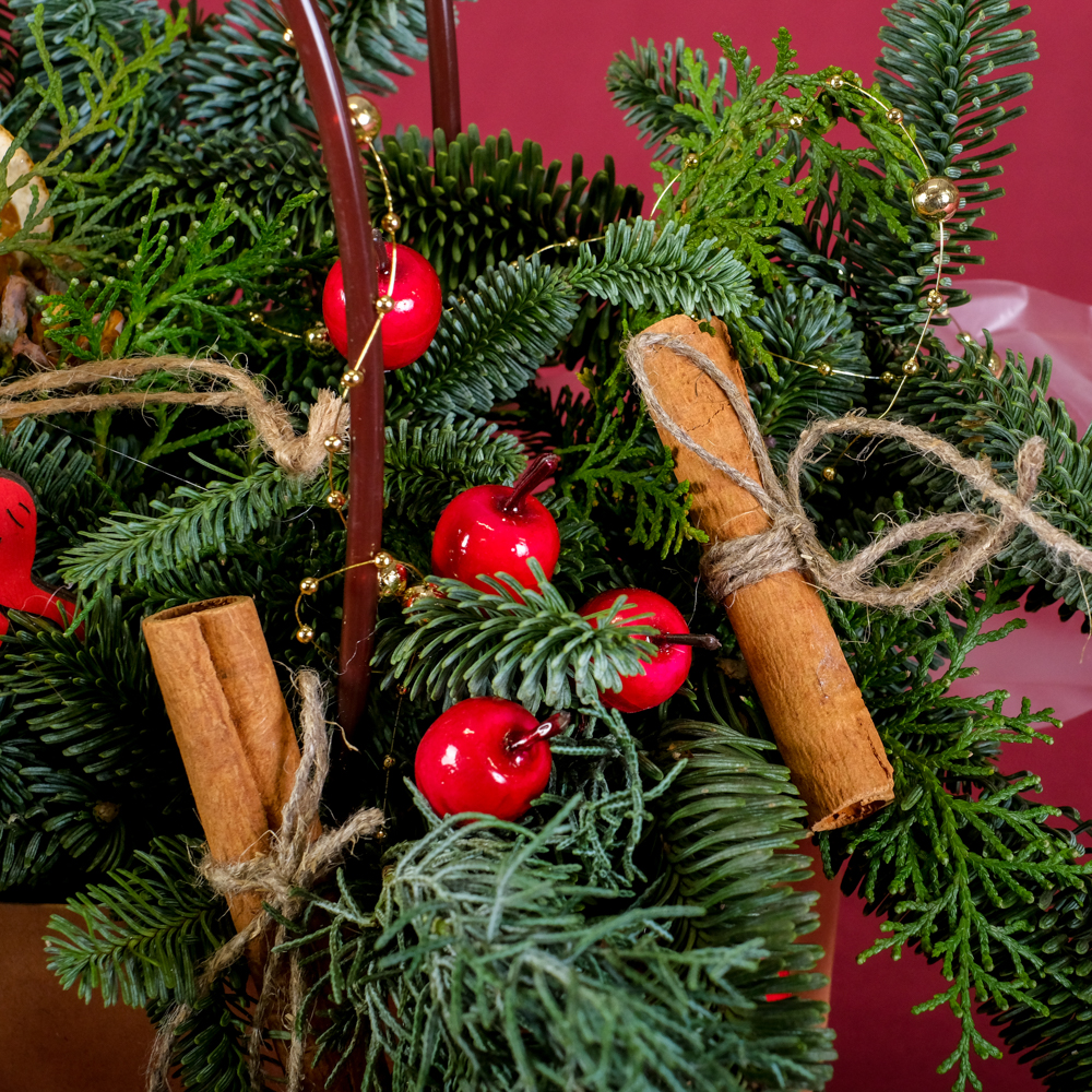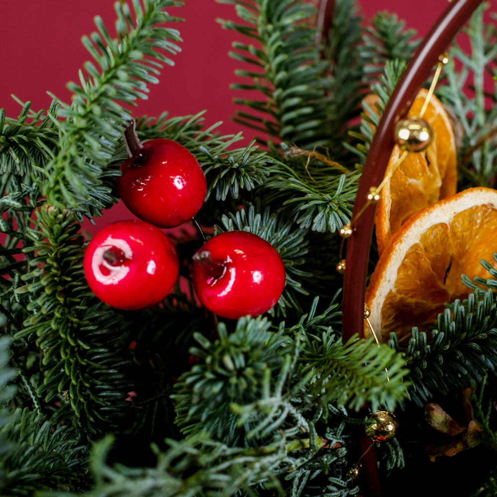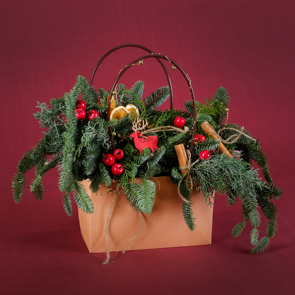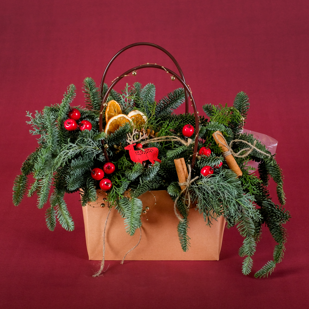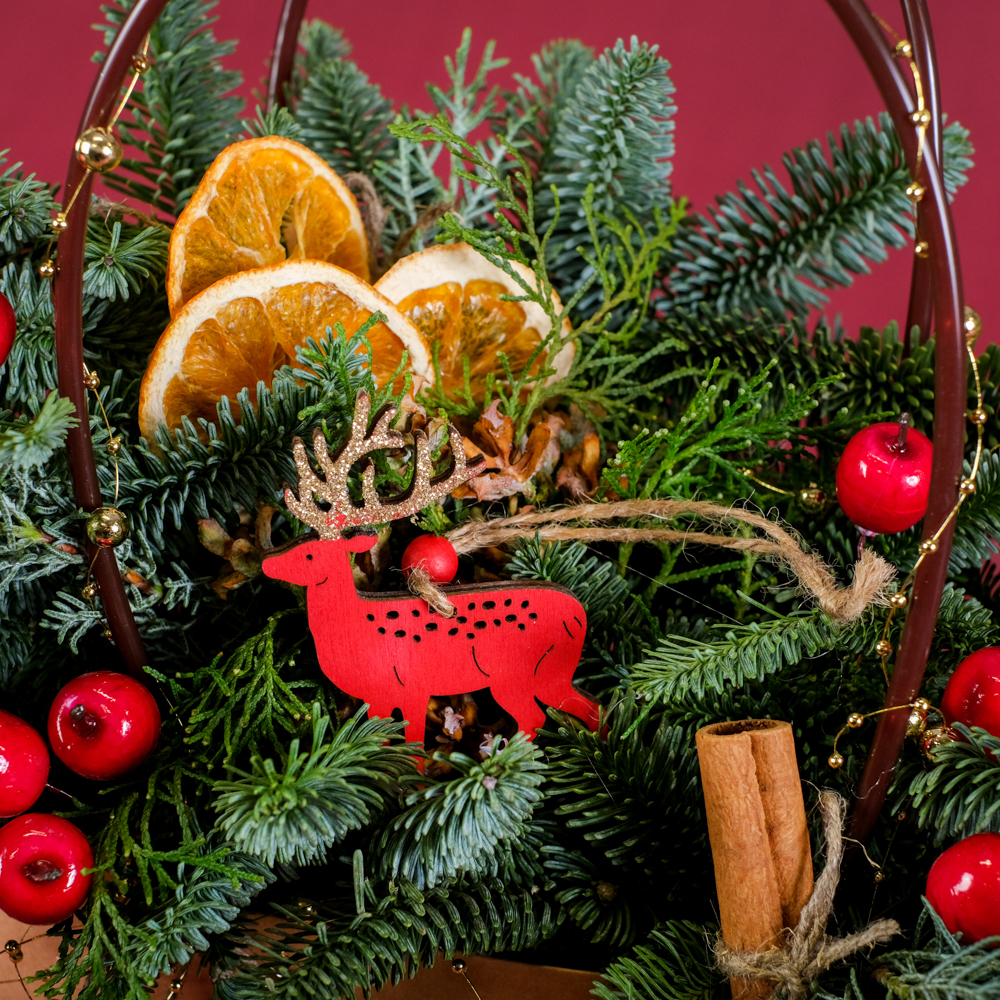 палочки корицы 3, подвеска олень 1, бусы 0,3, апельсин сушеный 3, ягоды на вставке 12, можжевельник 1, нобилис 1, сумочка, оазис 3