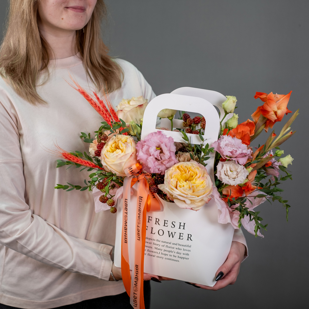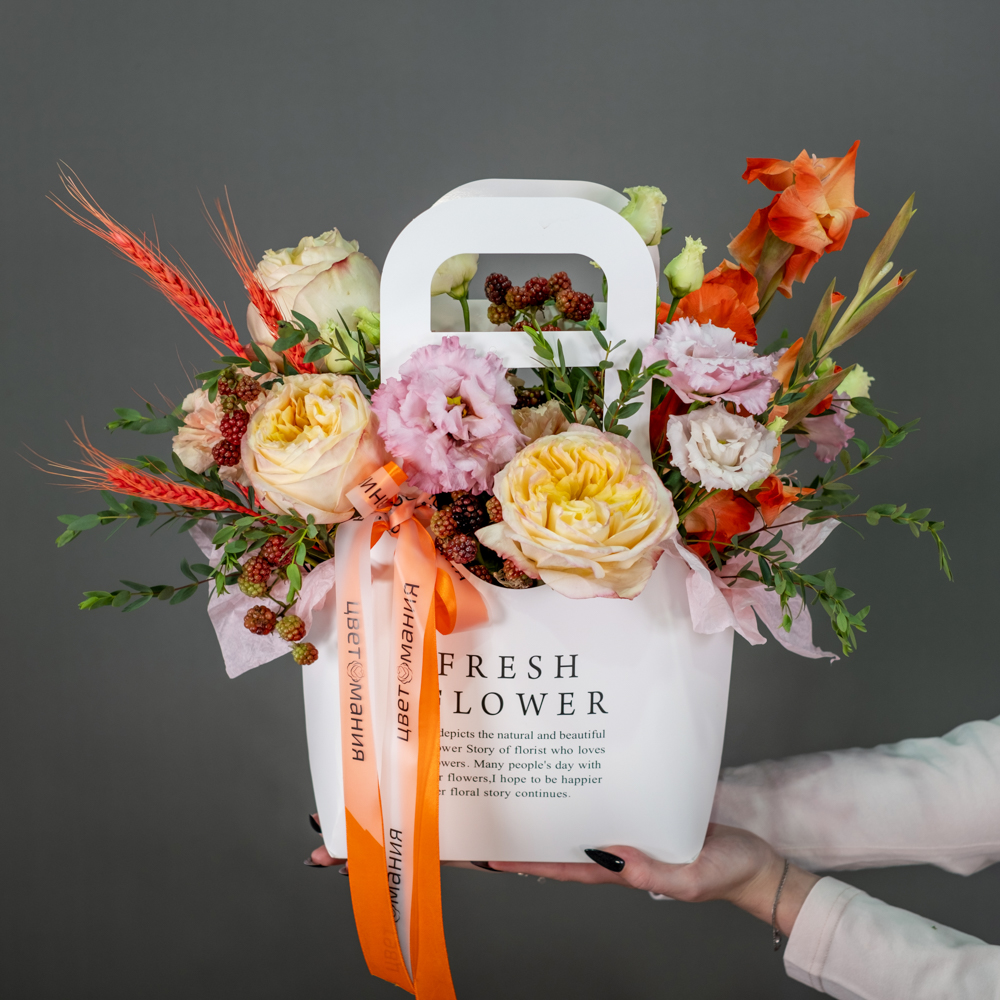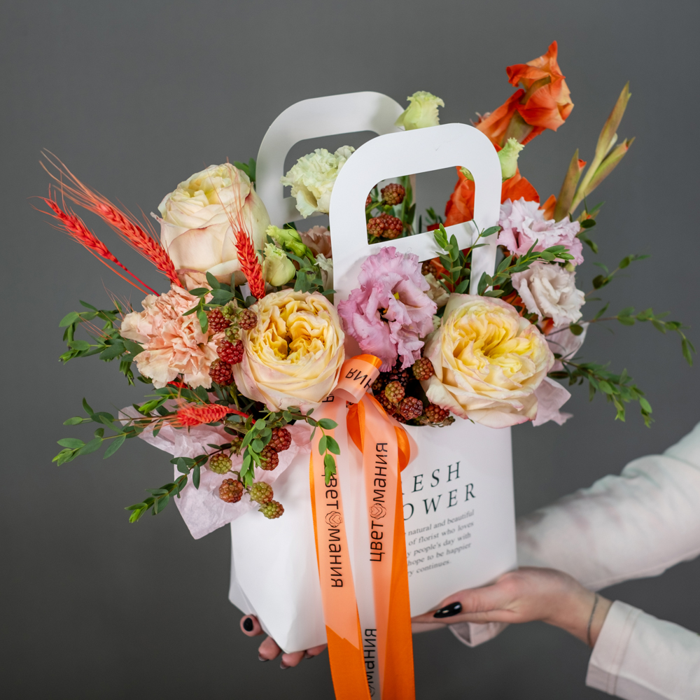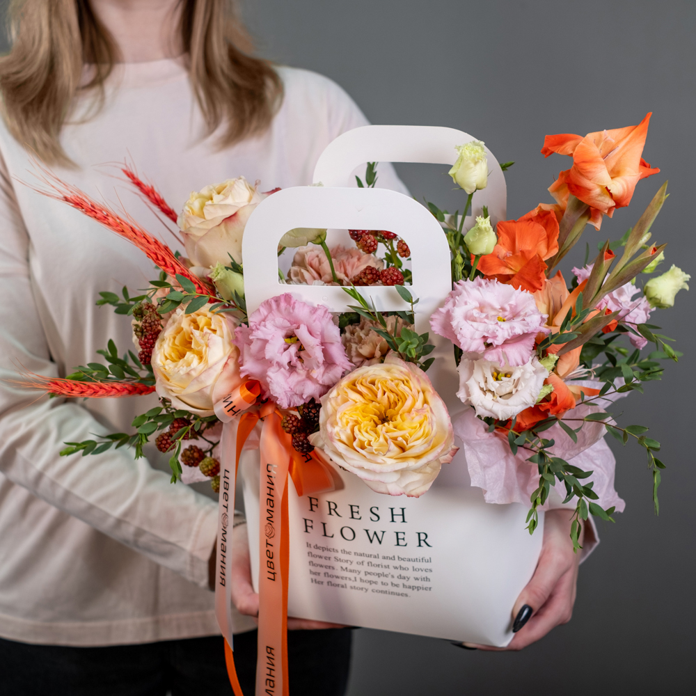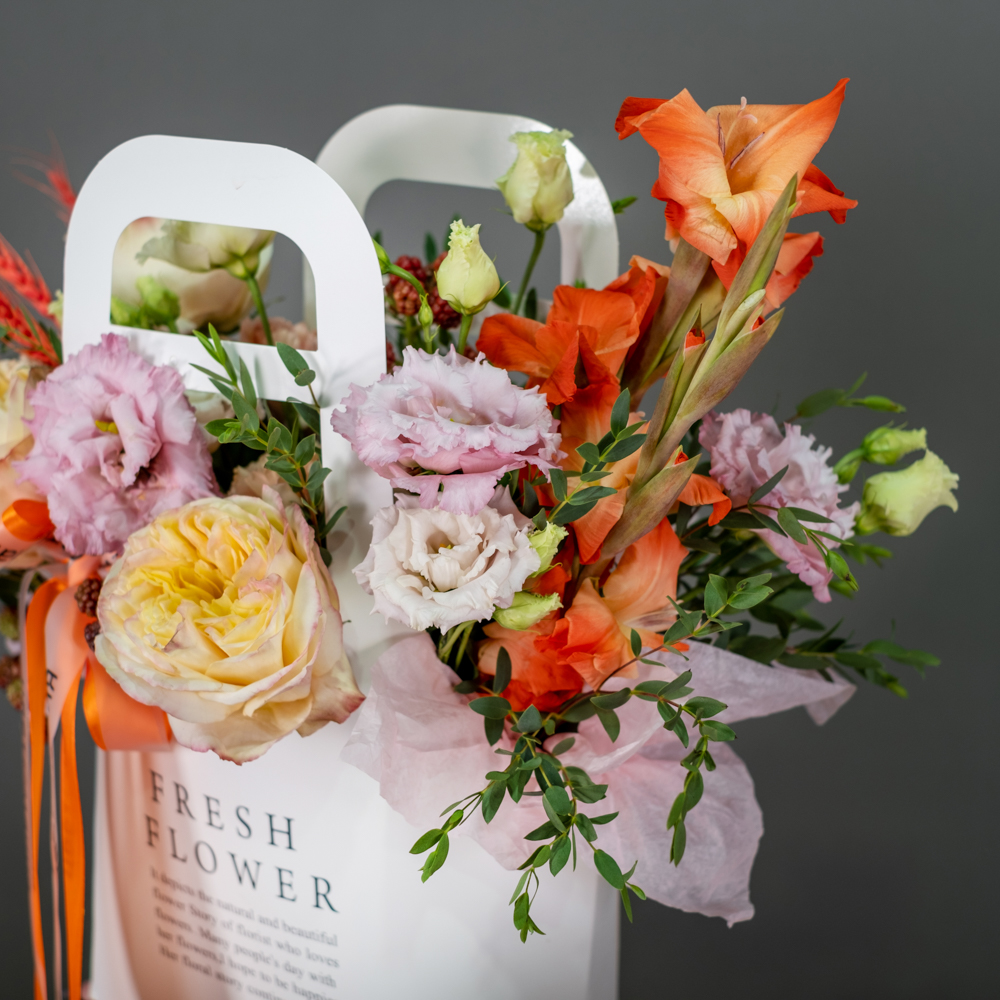 гладиолус 1, гвоздика 5, эустома 1, краспедия 5, эвкалипт 0,5, сумочка, оазис