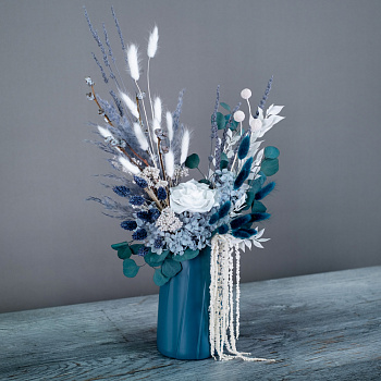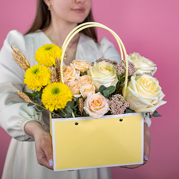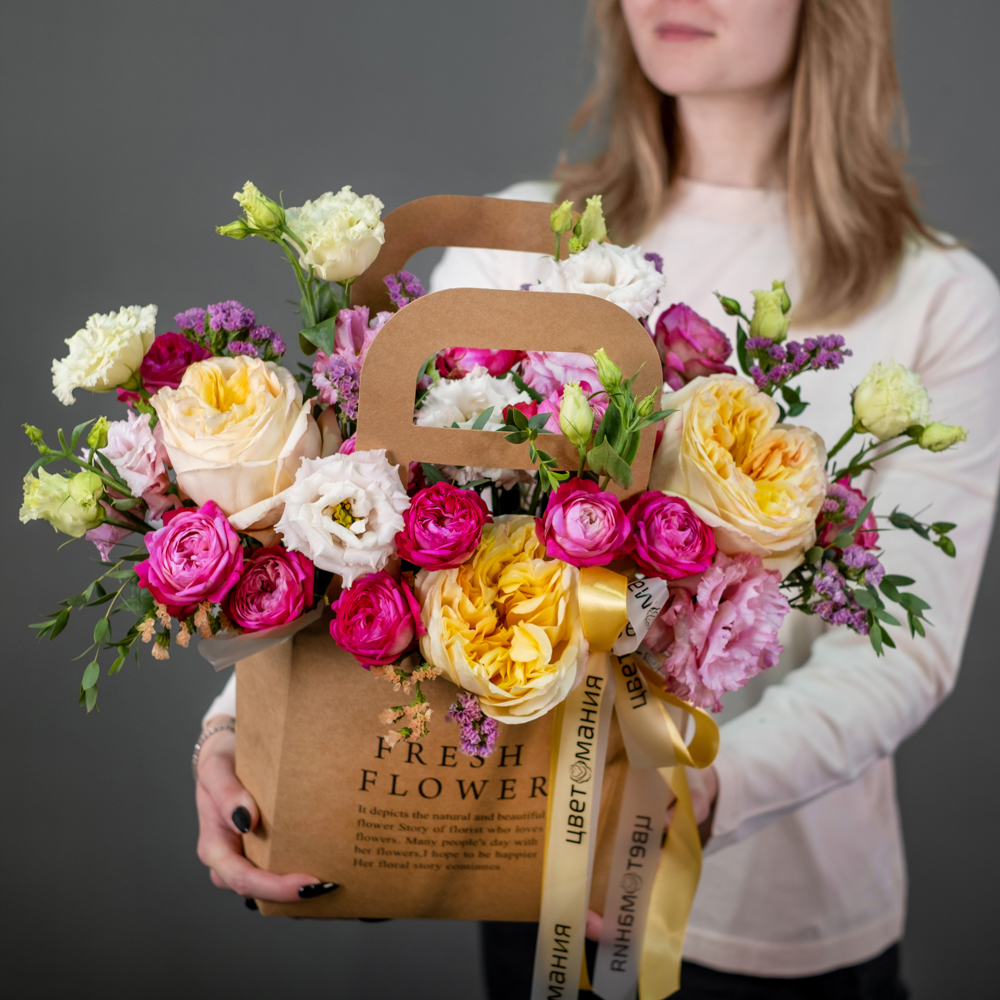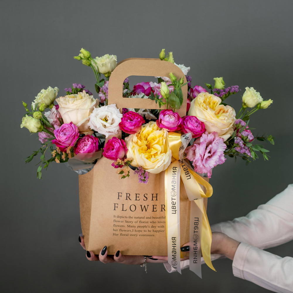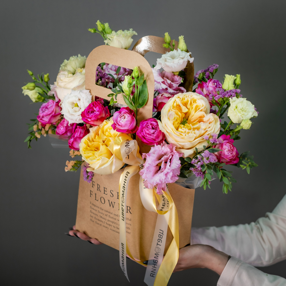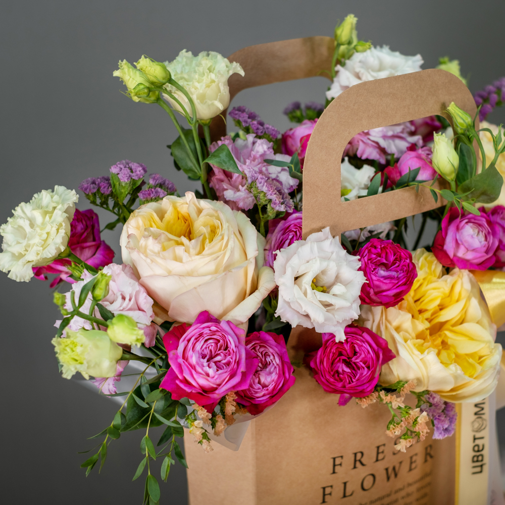 роза эквадор 50 см 3, кустовая роза 3, эустома 2, лимониум 2, эвкалипт 0,5, сумочка, оазис, лента