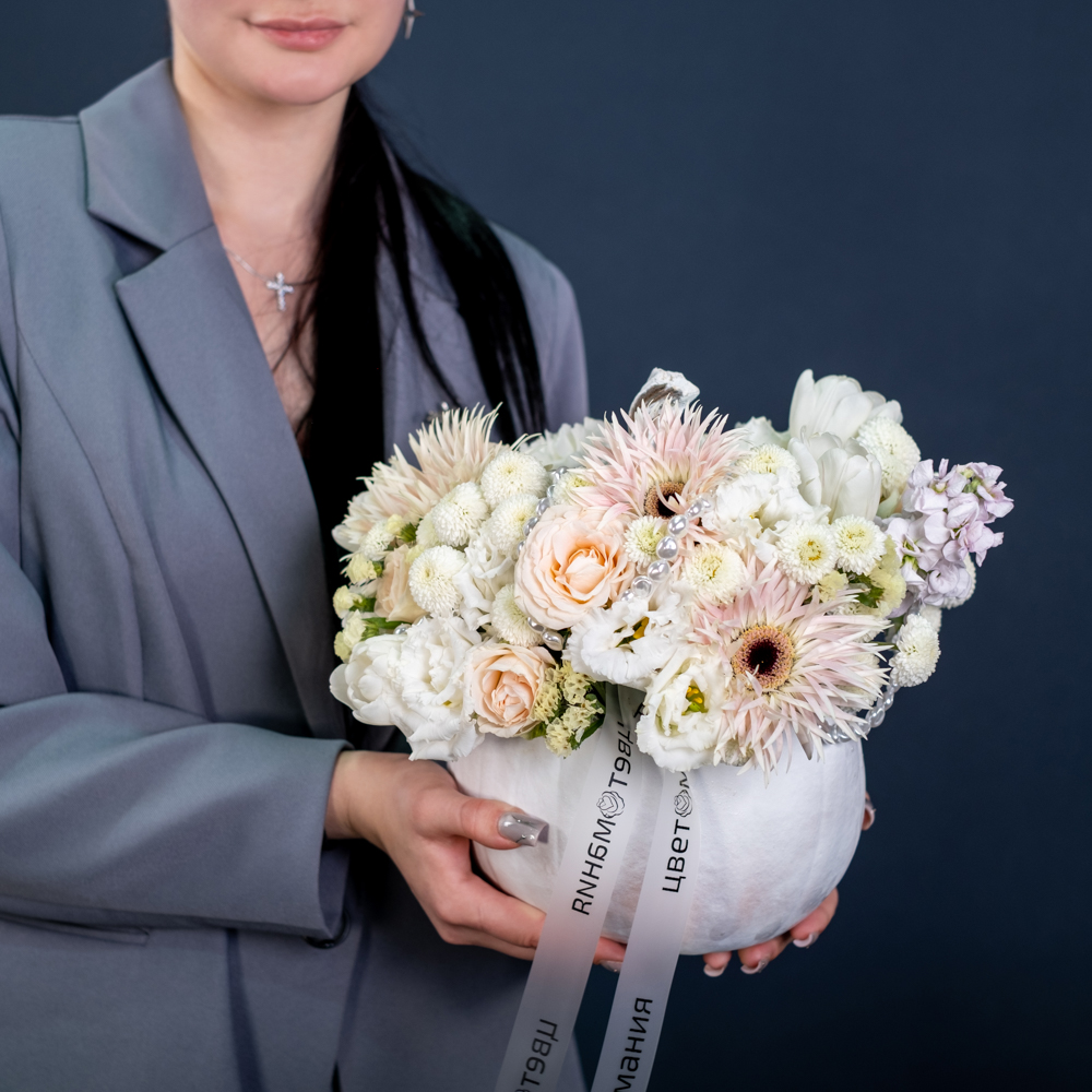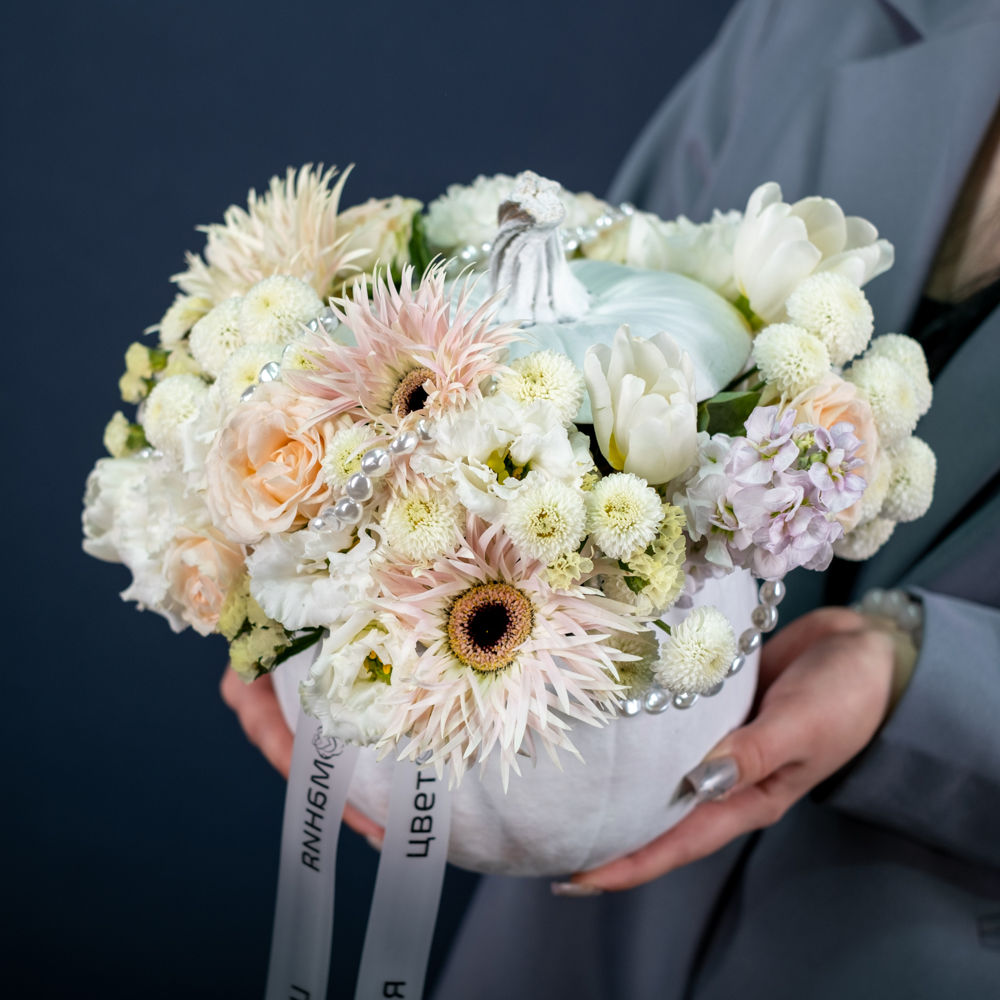 Композиция выполнена в настоящей тыкве. Удивите получателя необычным подарком!