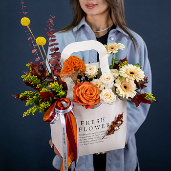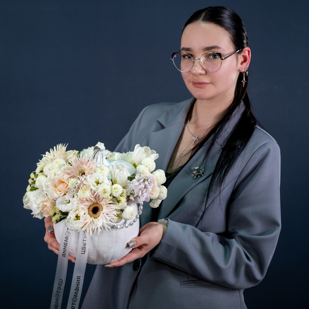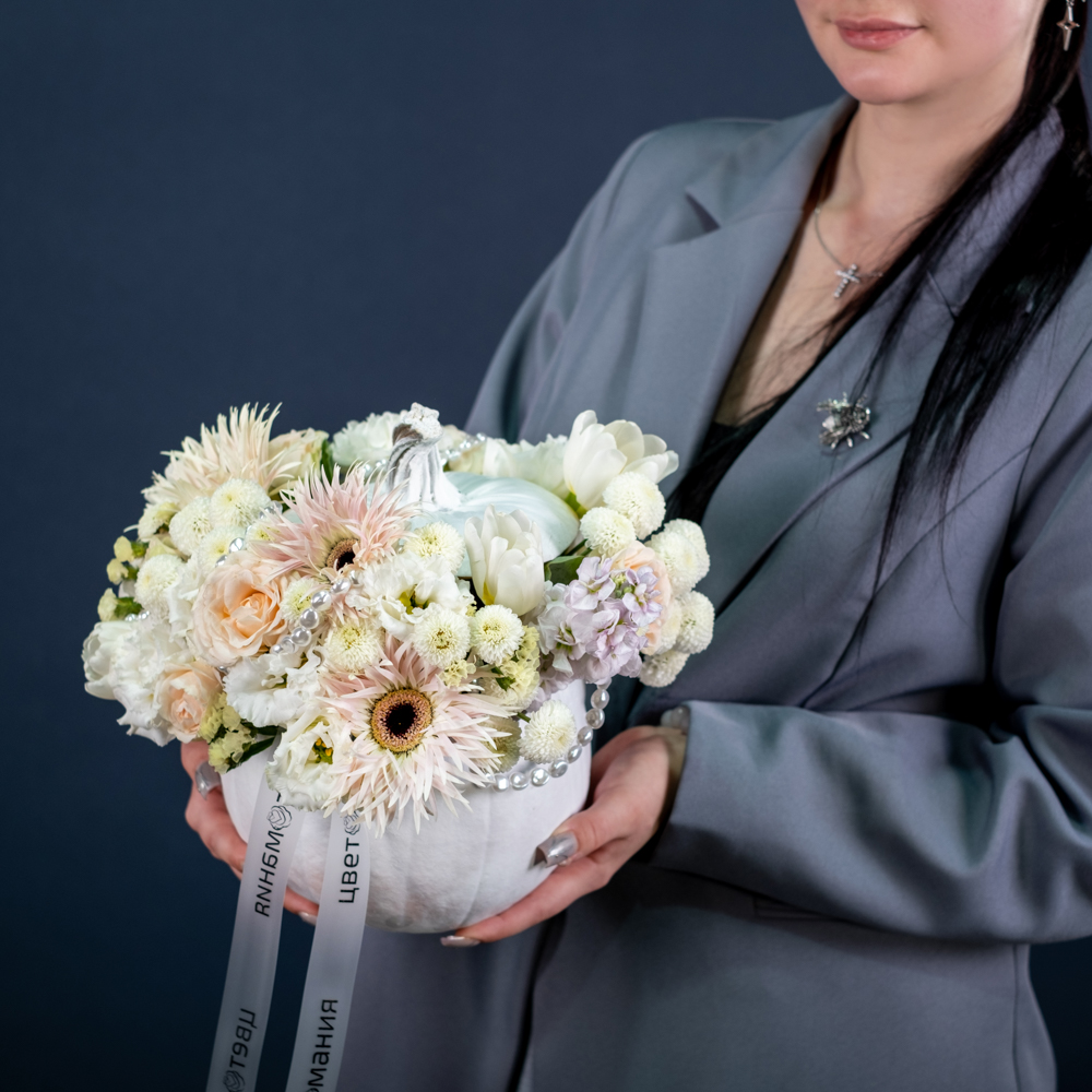 Композиция выполнена в настоящей тыкве. Удивите получателя необычным подарком!