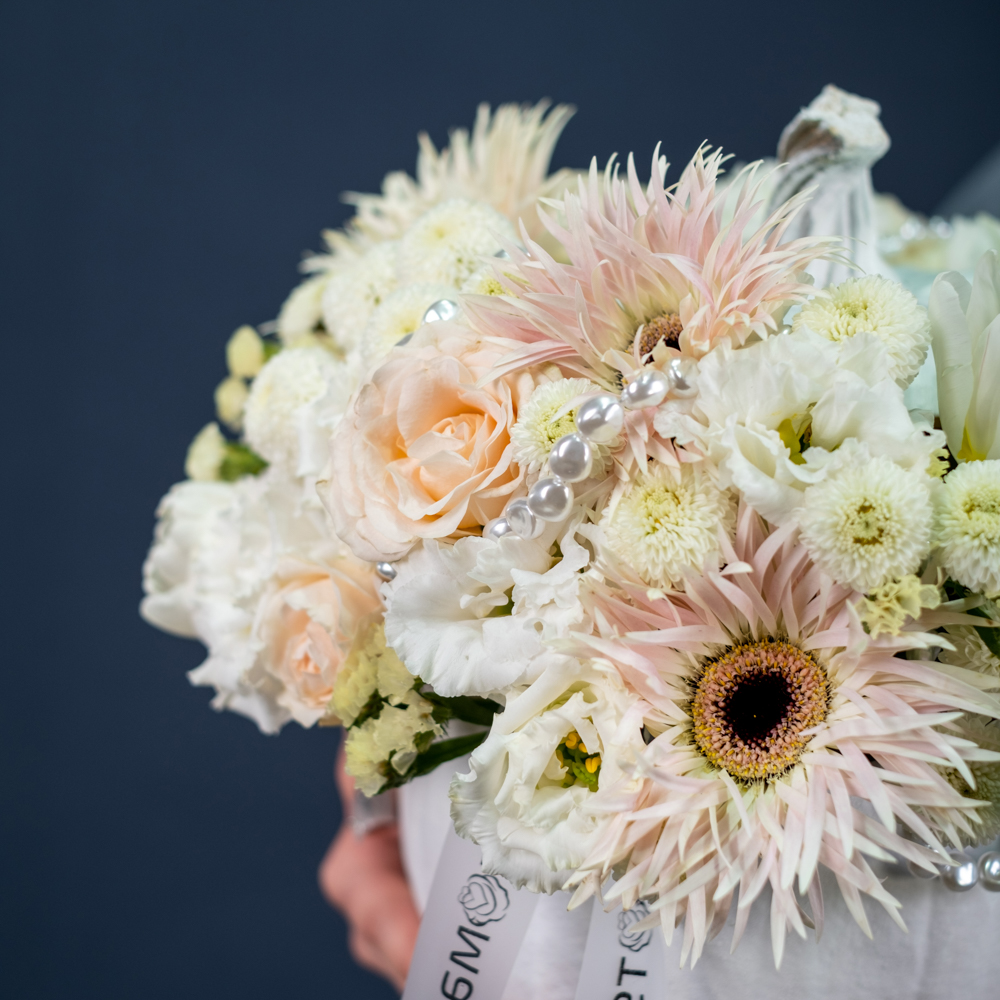 гербера 3, тюльпан 4, хризантема кустовая 2, маттиола 1, роза кустовая 1, гвоздика 3, эустома 2, бусы, оазис, краска, лента, тыква натуральная