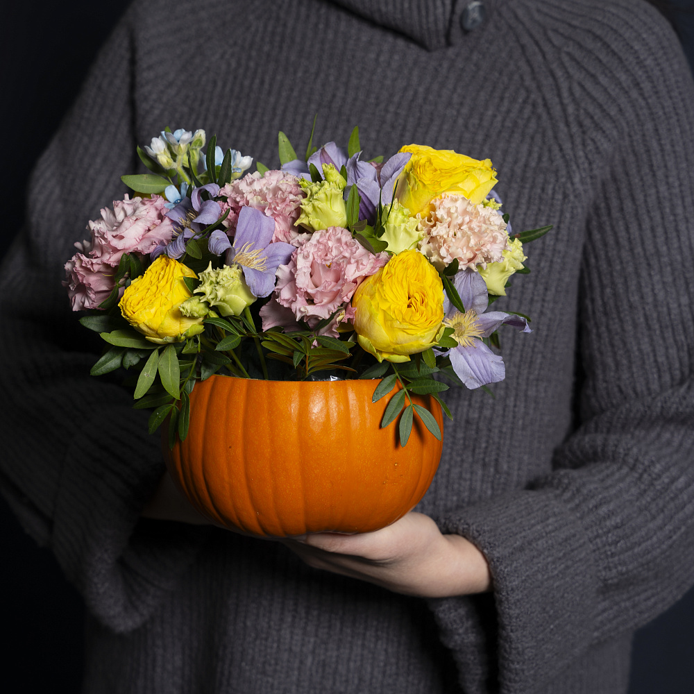 Композиция выполнена в настоящей тыкве. Удивите получателя необычным подарком!