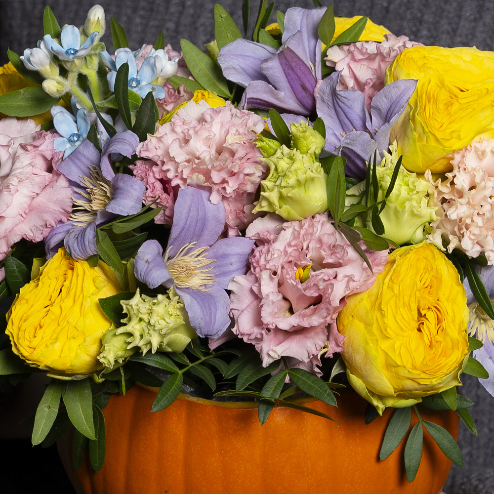эустома 2, клематис 2, кустовая роза 1, оксипиталум 1, пистач 2, тыква, оазис, пленка