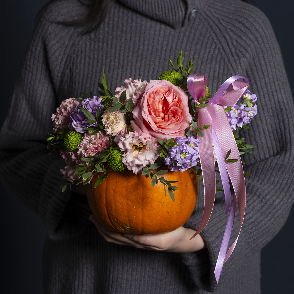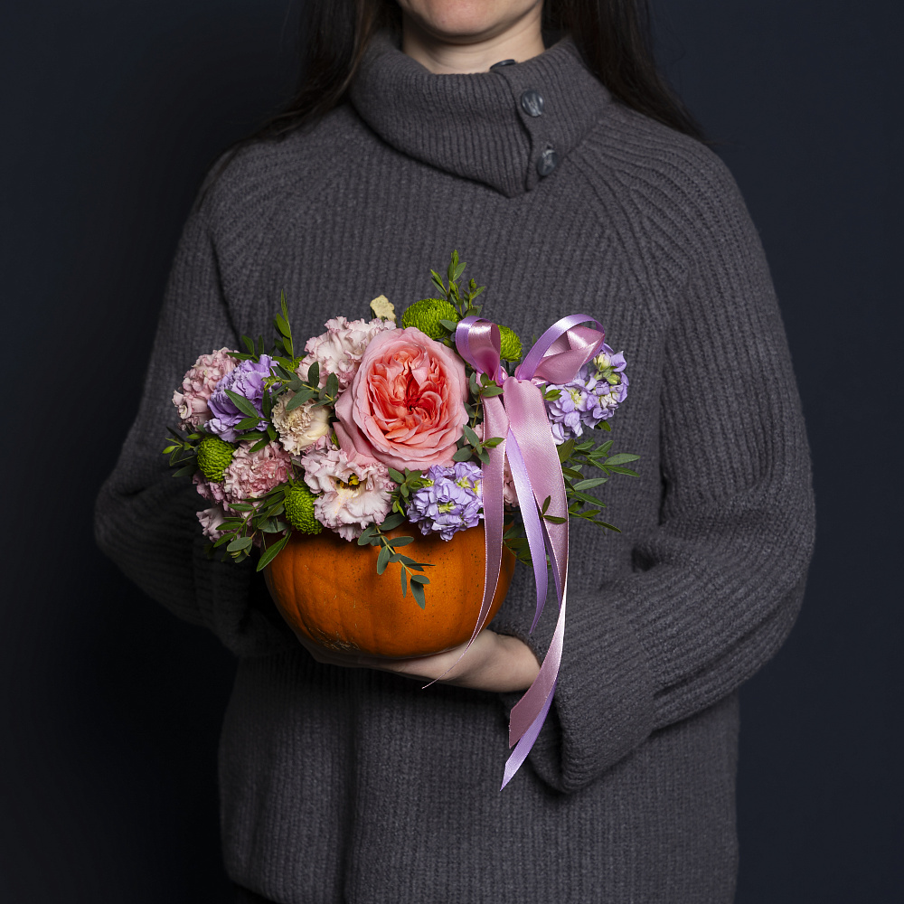 Композиция выполнена в настоящей тыкве. Удивите получателя необычным подарком!