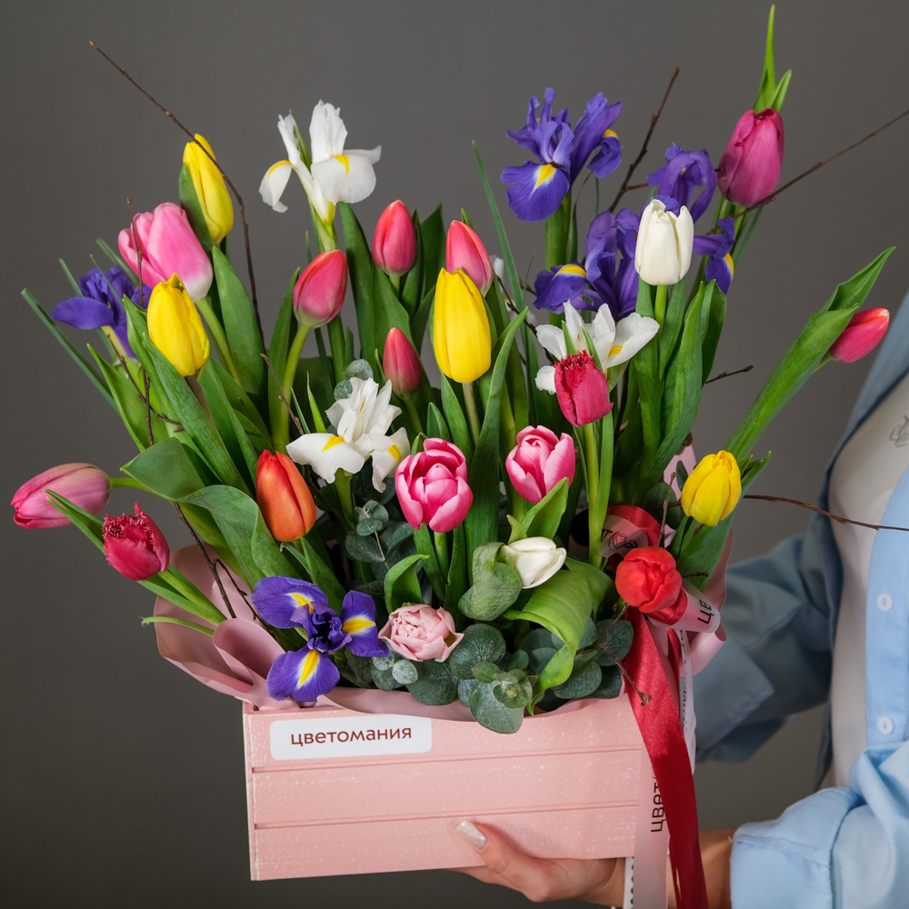 тюльпан 20, ирис 9, эвкалипт 1, ветки березы, ящик деревянный, оазис, пленка, лента