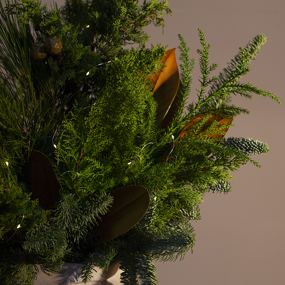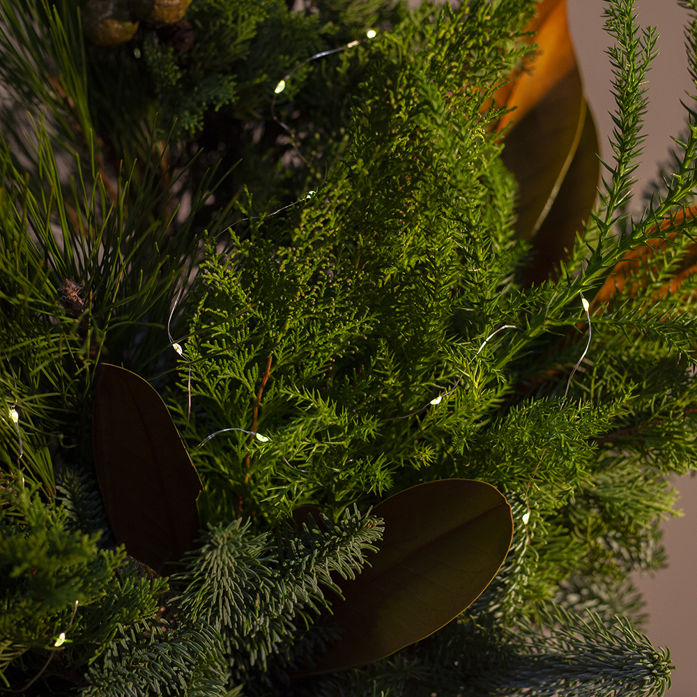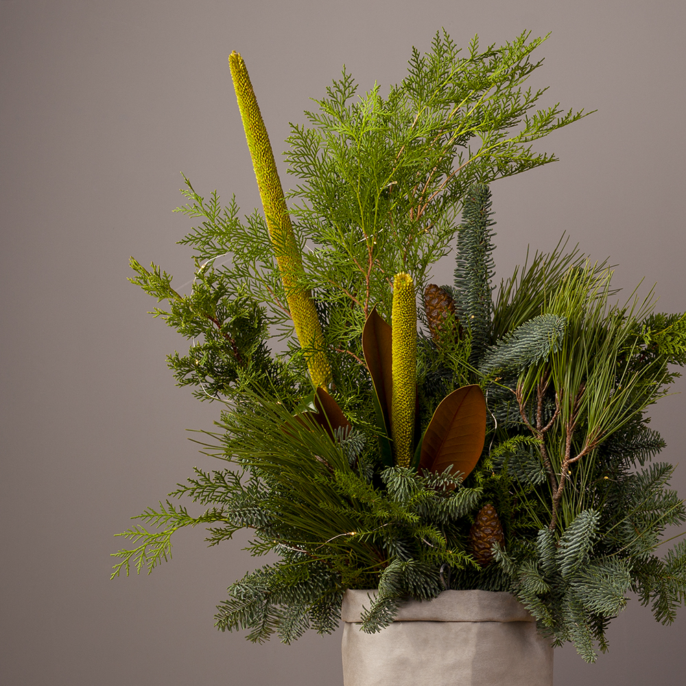 камыш крашенный 2, кипарис 1, магнолия 1, мерешка 1, нобилис 2, сосна 1, туя 2, оазис 6, коробка под композицию