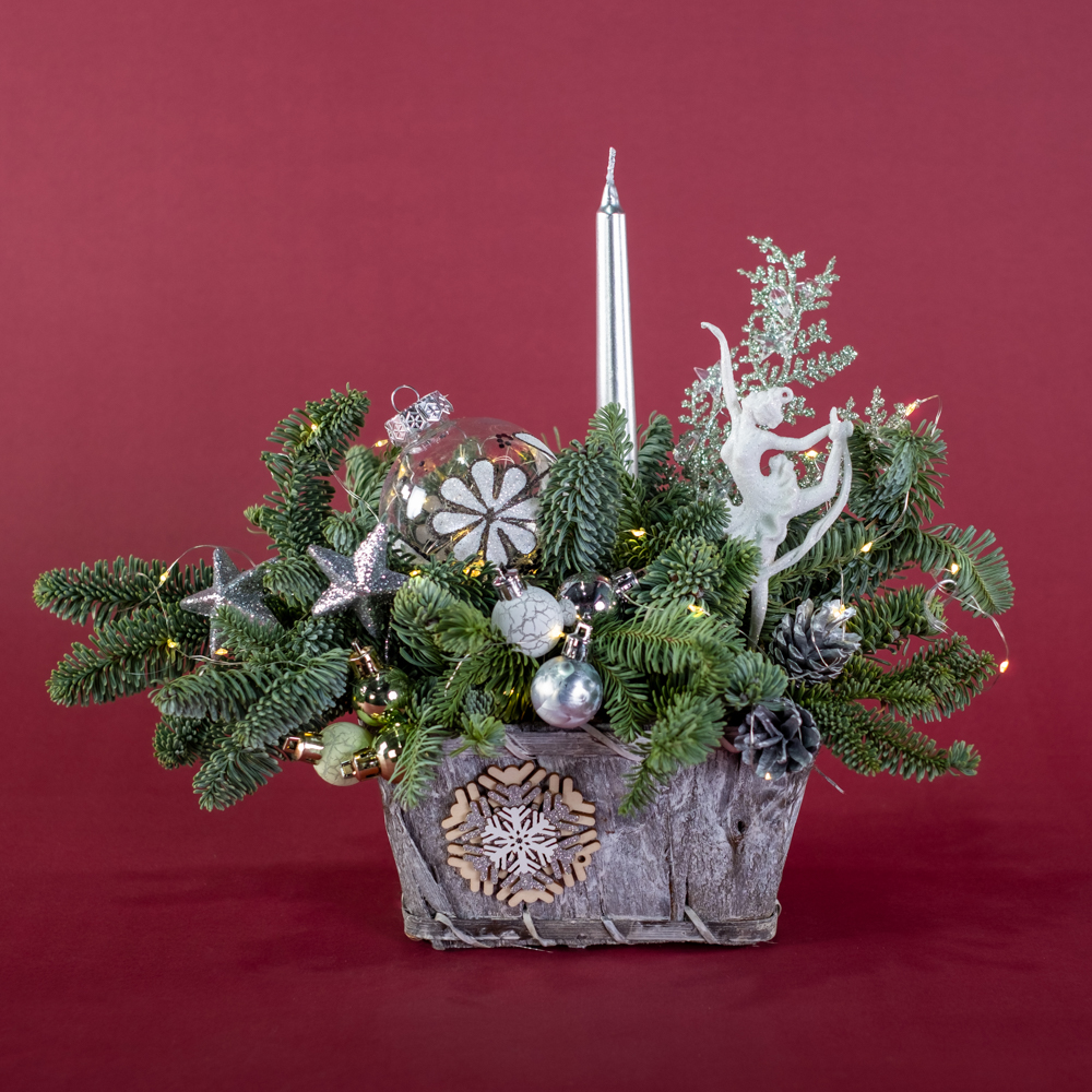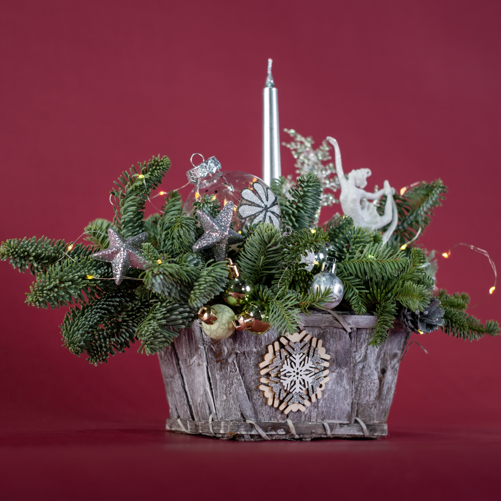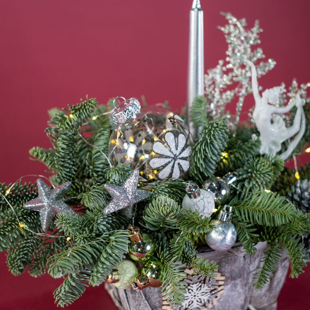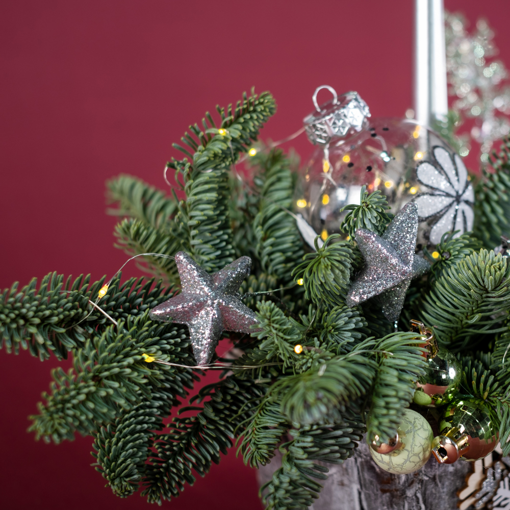 Состав композиции: нобилис, ёлочные украшения, оазис, свеча