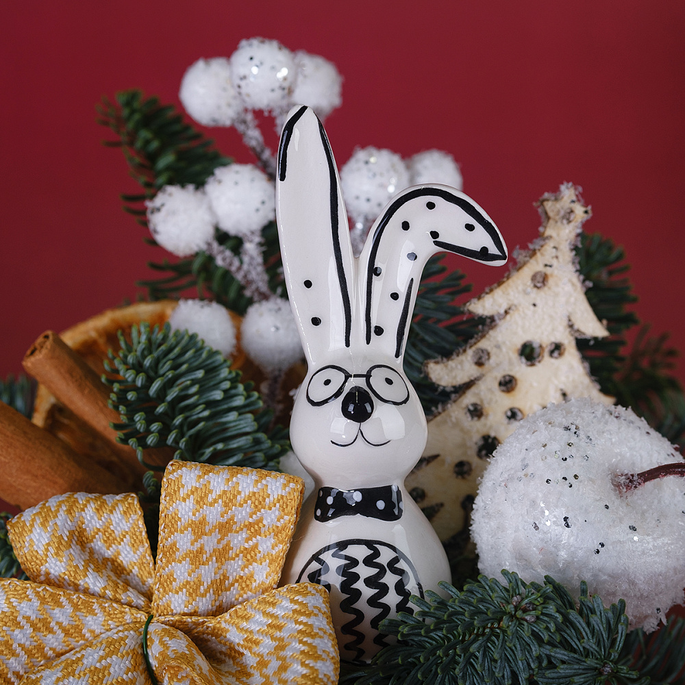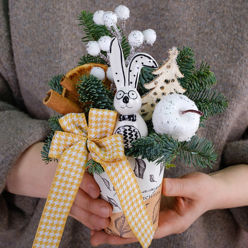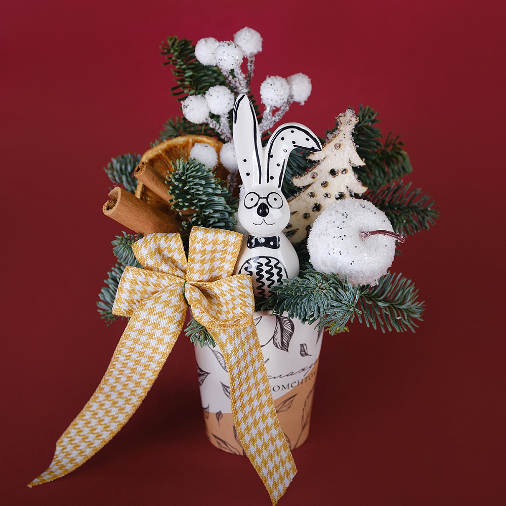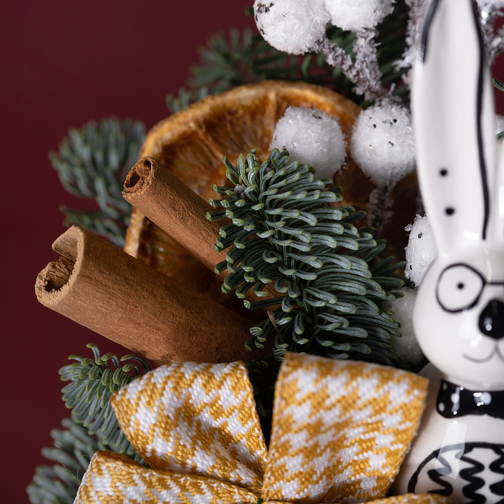 Апельсин сушеный - 1, Ветка белая с ягодами - 1, нобилис - 0,3, палочки корицы - 2, зайчишка пузико-арбузико, оазис - 1, стаканчик маленький.