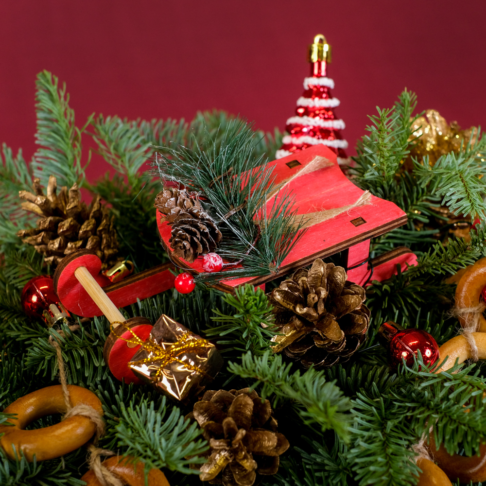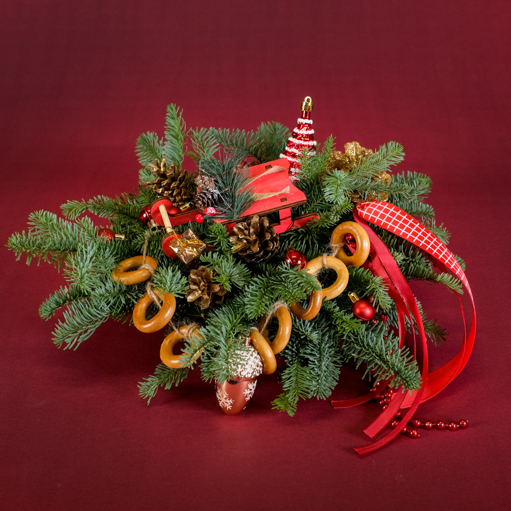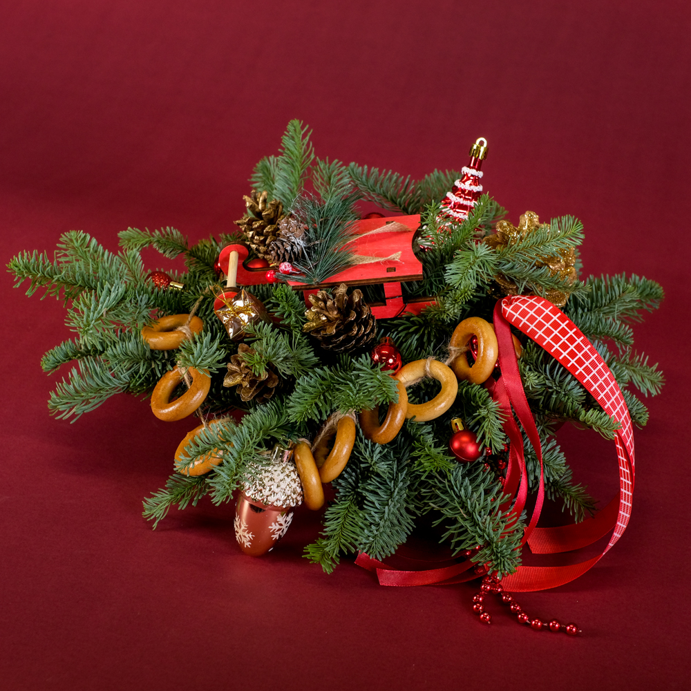 подвеска 1, шар 6, набор украшений 0,2, украшение ёлочка 1, украшение желудь 1, шишка в глиттере 1, бусы 0,1, шишка золото 3, сушки, нобилис 0,8, горшок, оазис 1, лента