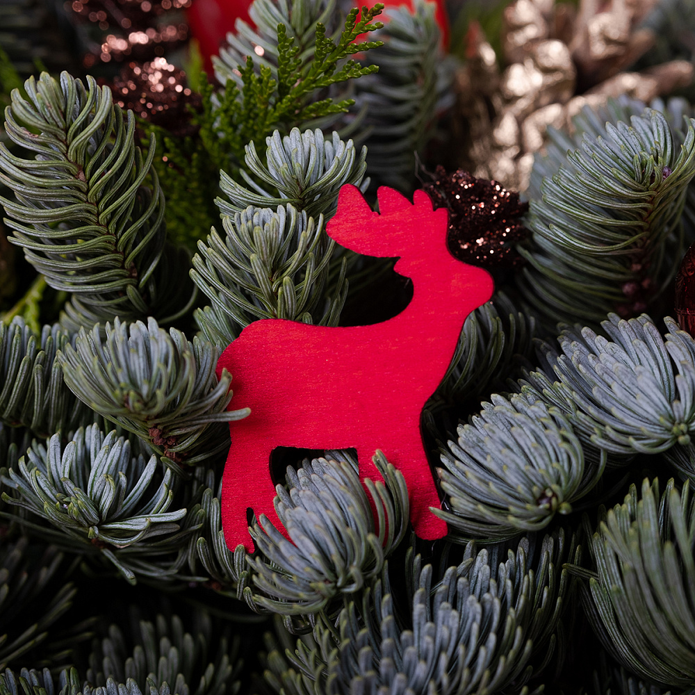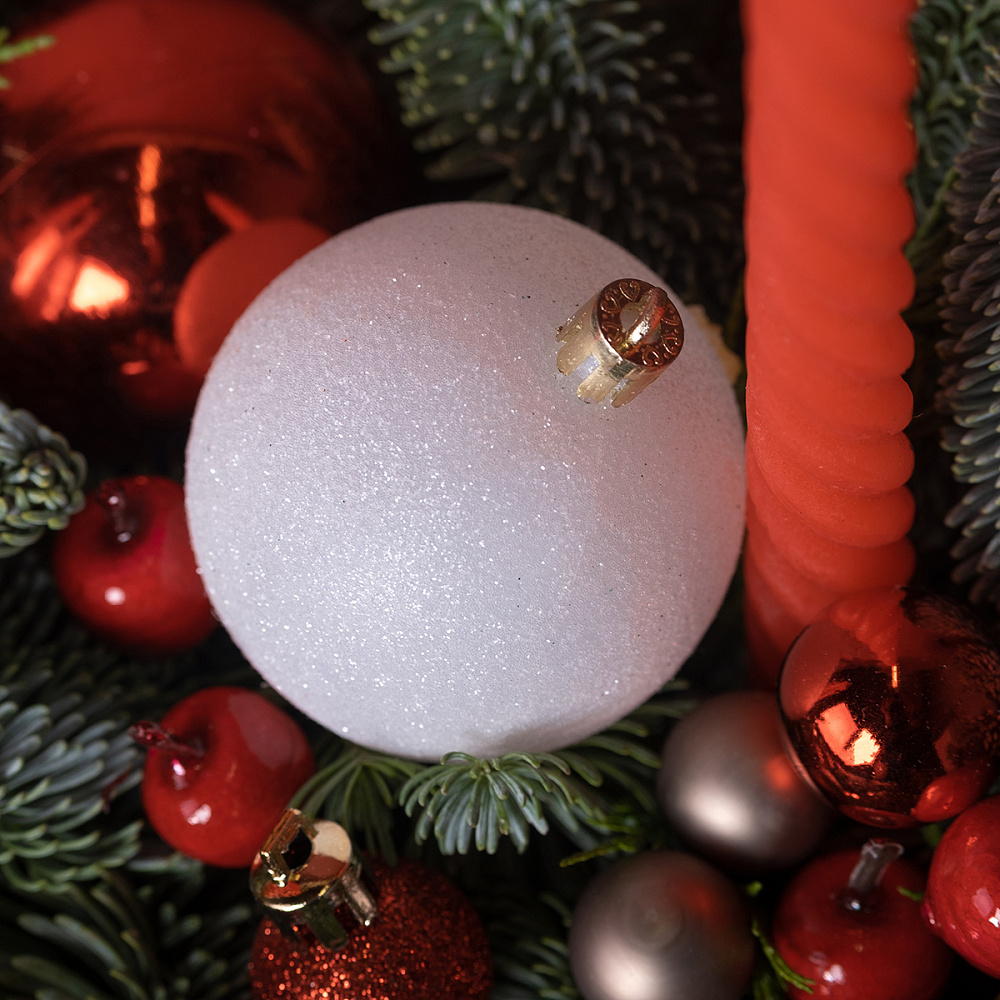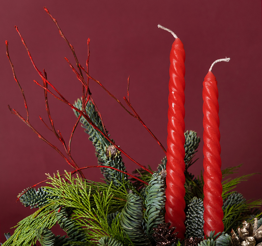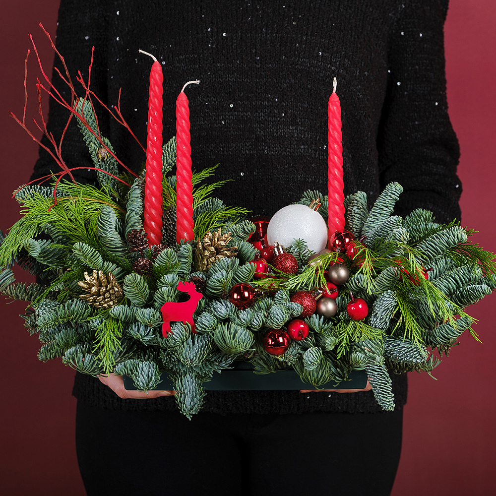 Состав композиции: нобилис, ёлочные украшения, игрушки, свечи