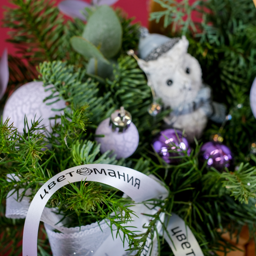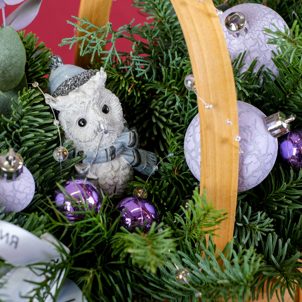шар 15, сова 1, шар 3, бусы 0,2 эвкалипт 1, можжевельник 1, нобилис 1, краска 0,2 корзина, лента, оазис