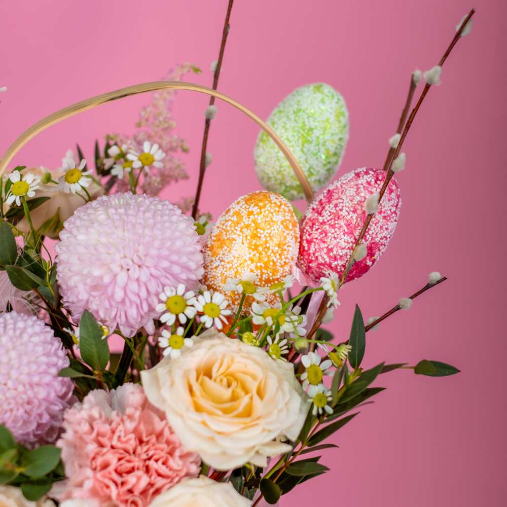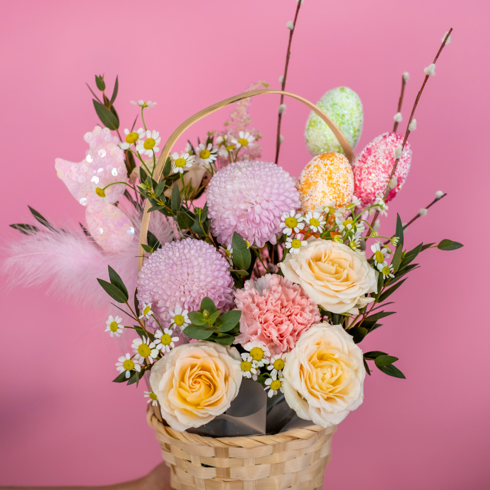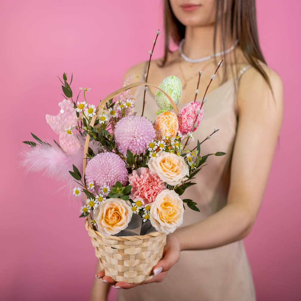 роза кустовая 1, гвоздика 1, хризантема стандарт 2, матрикария 2, верба 2, парвифолия 0,5, астильба 1, курочка с перьями 1, яйцо в обсыпке 3, корзина бамбук, оазис