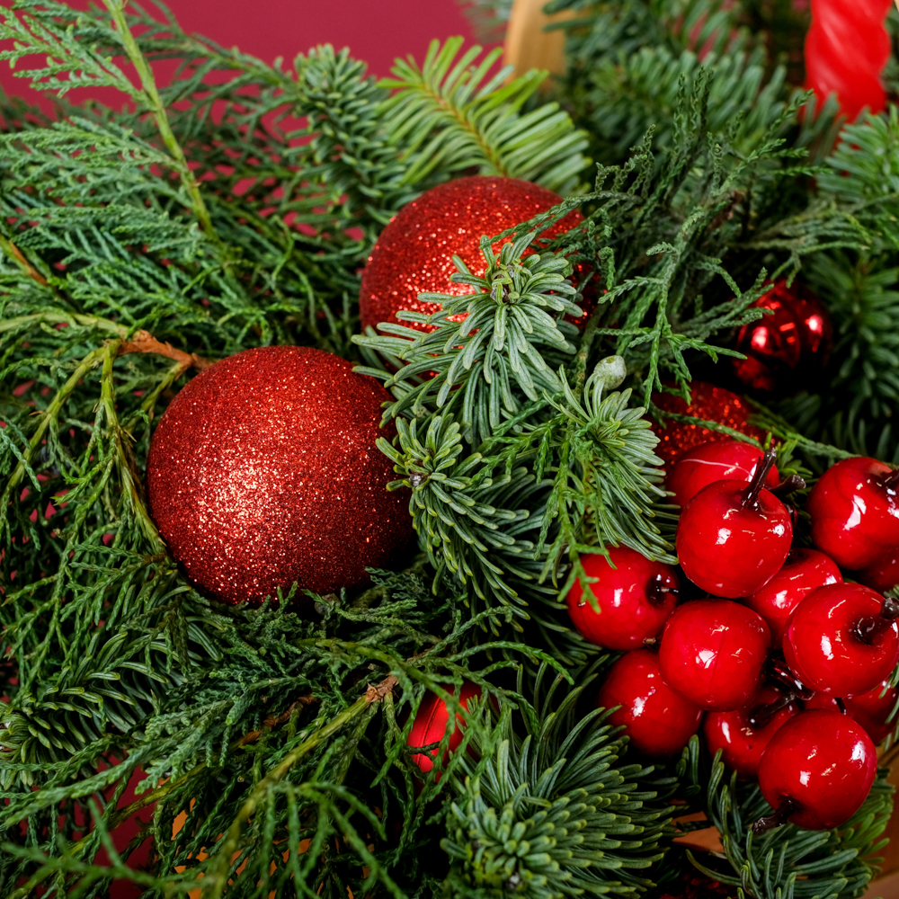 туя 1, свеча 2, ягоды на вставке 12, шар 7, шар 10, нобилис 0,5, деревянные палочки 15, корзина, лента, оазис
