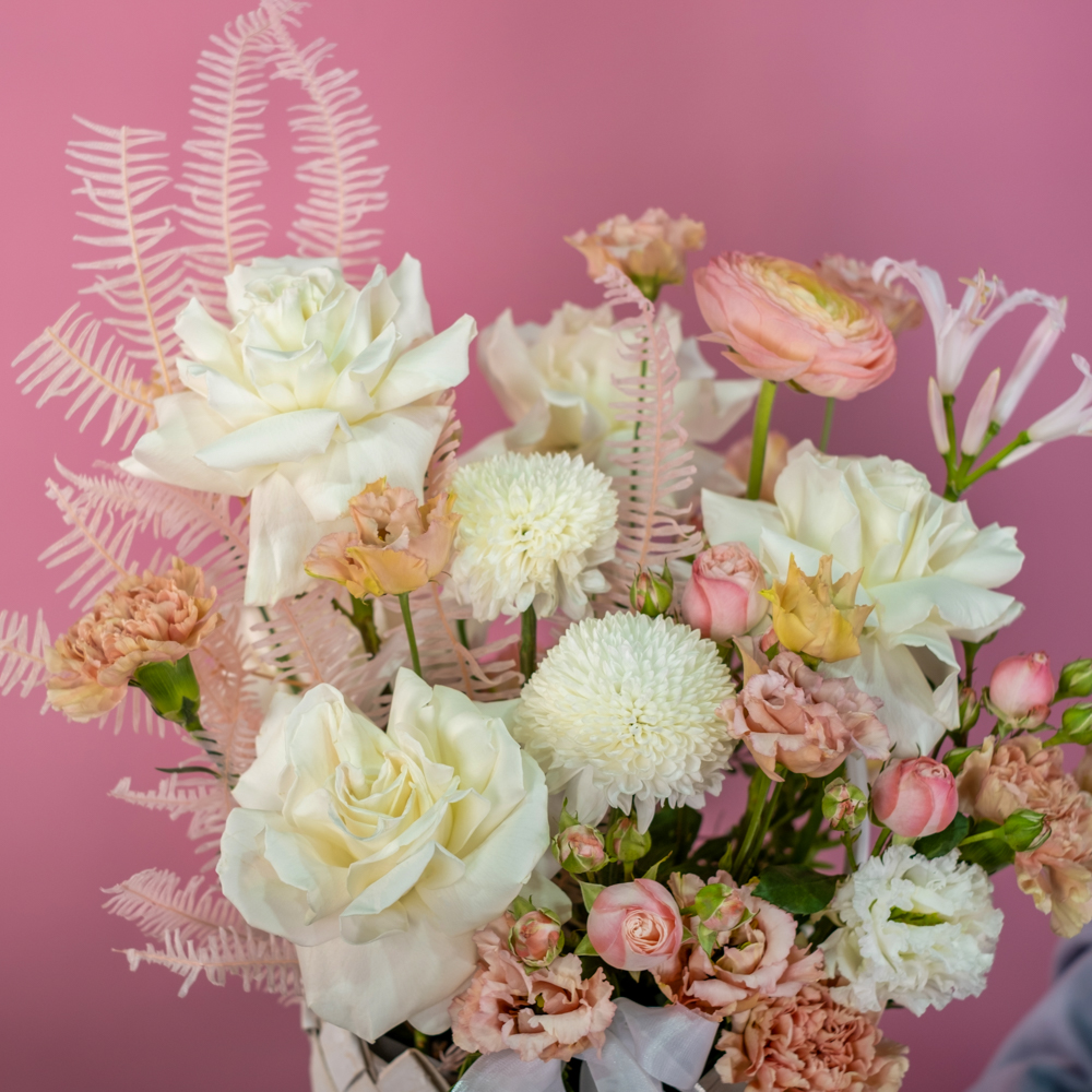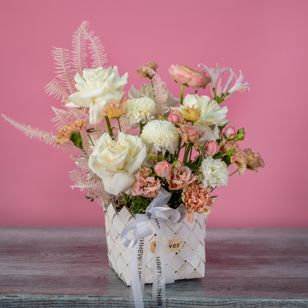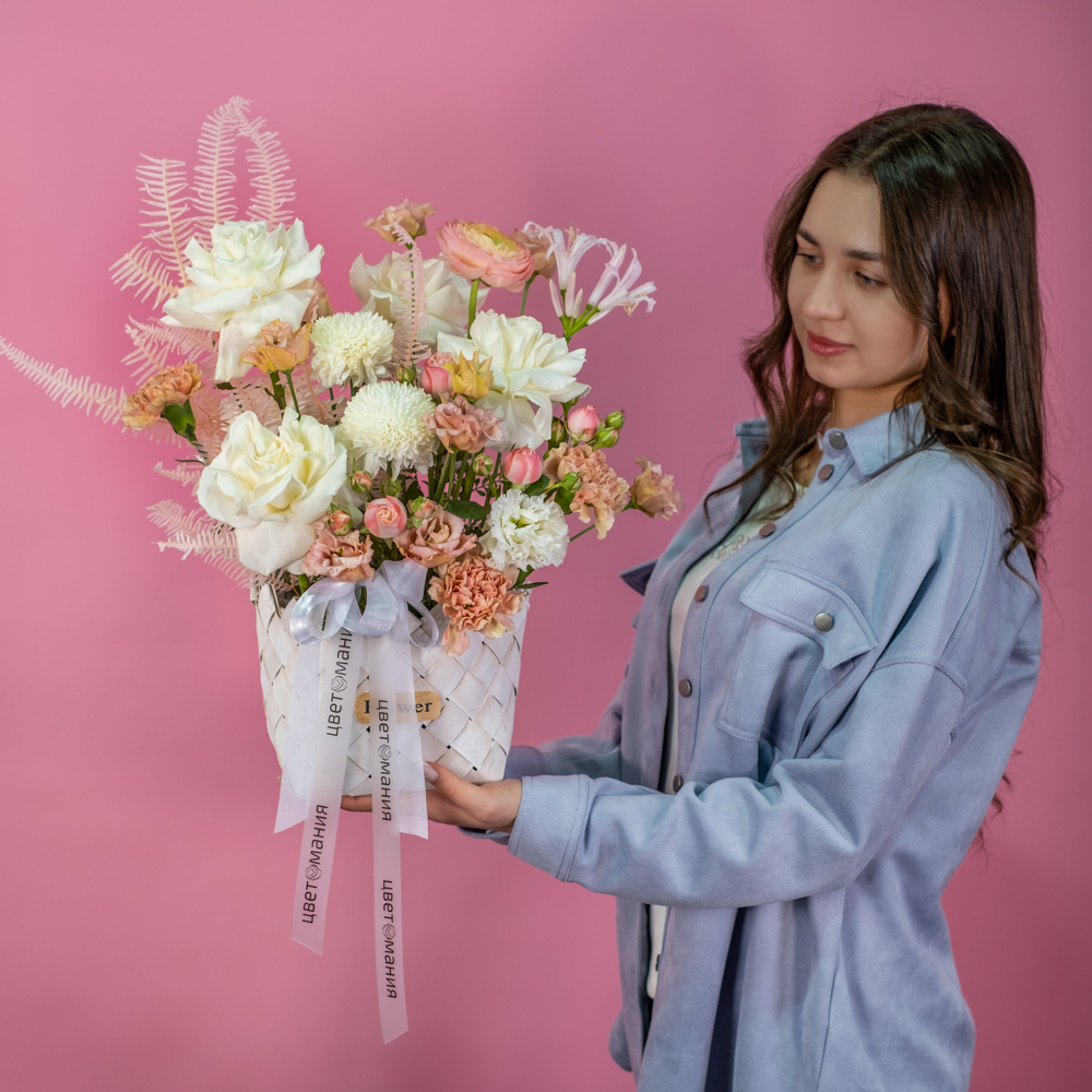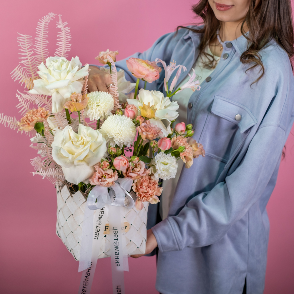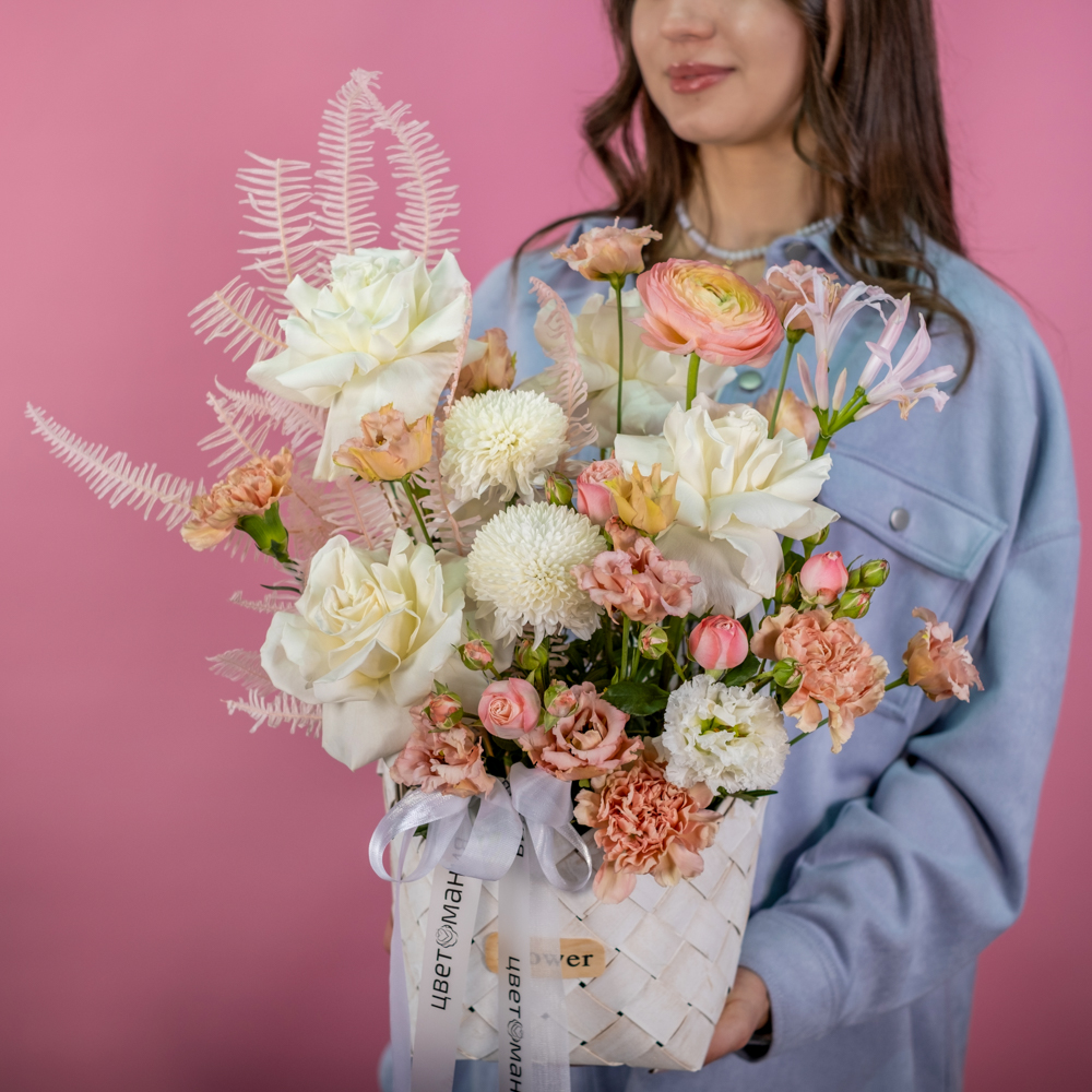французская роза 4, хризантема 2, мадам бомбастик 2, гвоздика 3, ранункулюс 1, эустома 2, папоротник амбрелла 1, пистач 2, нерине 1, корзина 1, оазис 2, лента