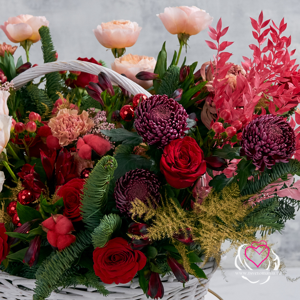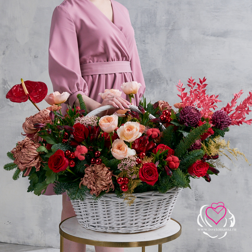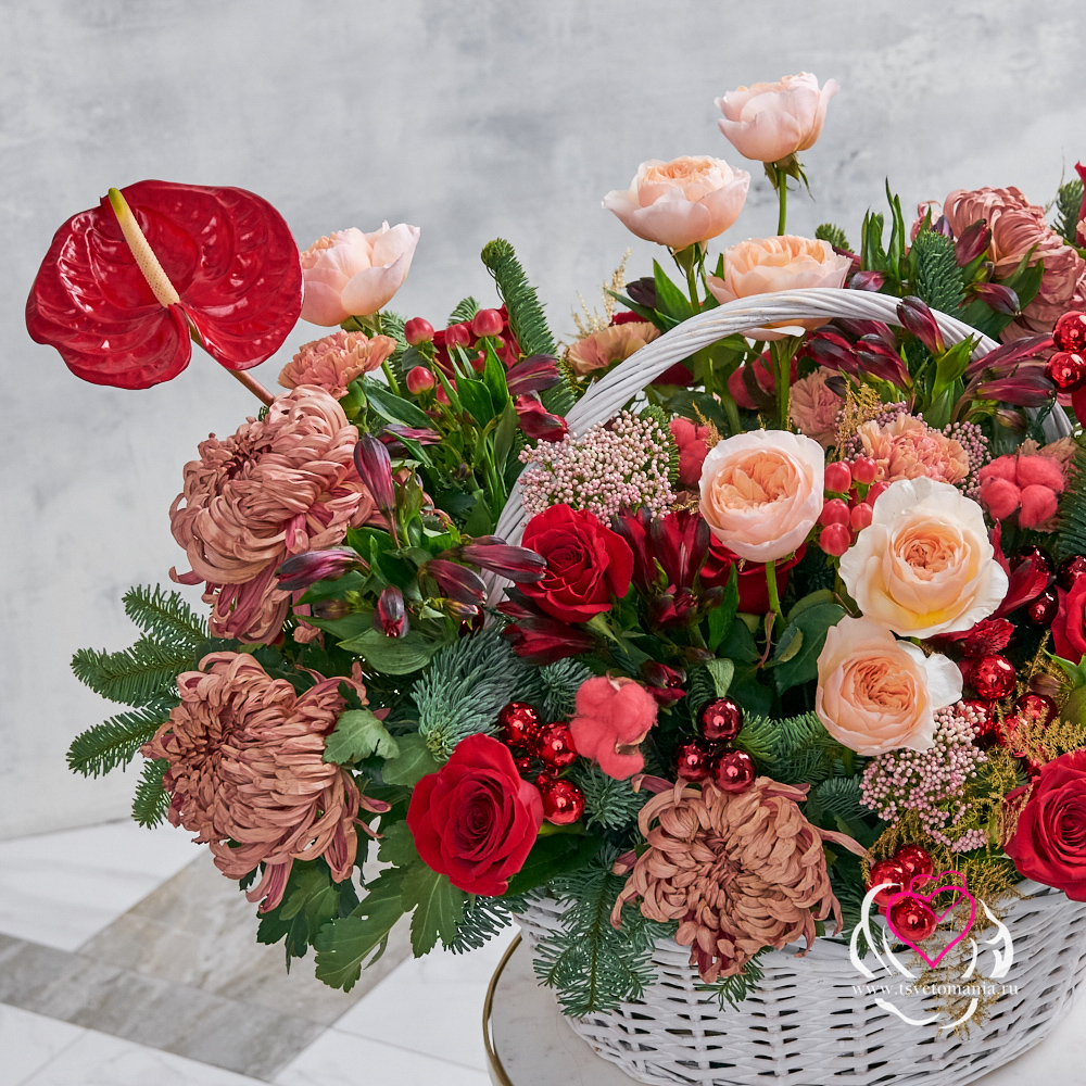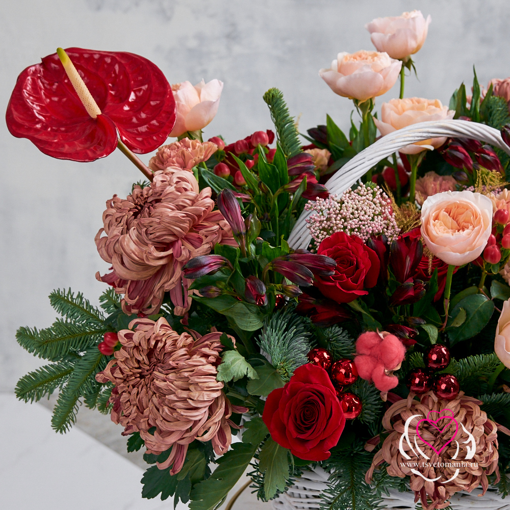 корзина 1, оазис 9, шар 34, аспарагус 5, нобилис 4, роза остин джульет 6, озотамнус 3, рускус 2, хлопок 5, альстромерия 9, гвоздика голландия 9, хризантема виена купер 5, хризантема бигуди 3, роза эквадор 50 см 15, гиперикум 3, антуриум 1