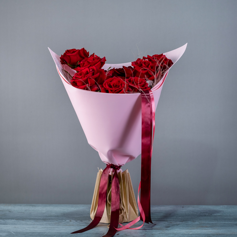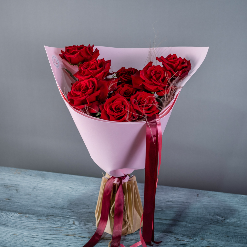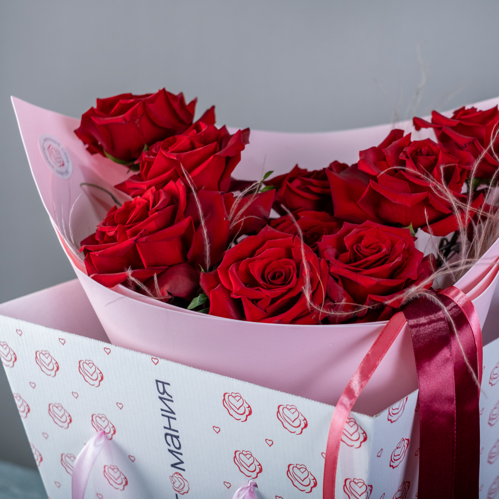Состав букета: роза Эквадор 9, пистач 3, ковыль, упаковка, лента, транспортировочная коробка, аквабокс