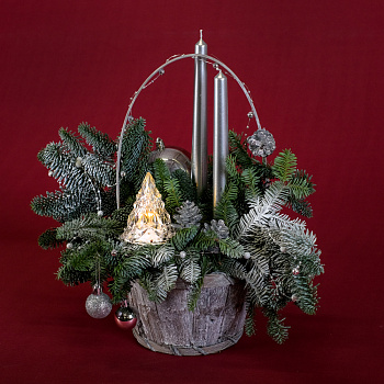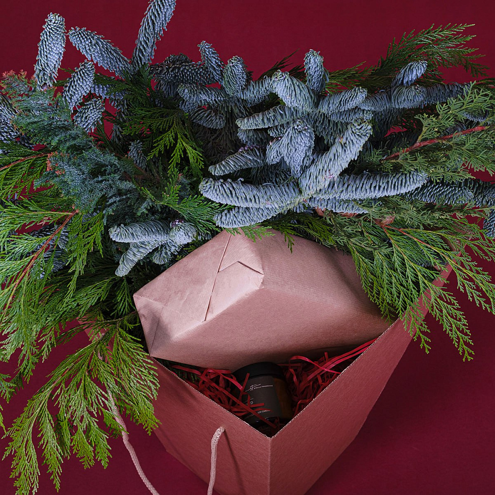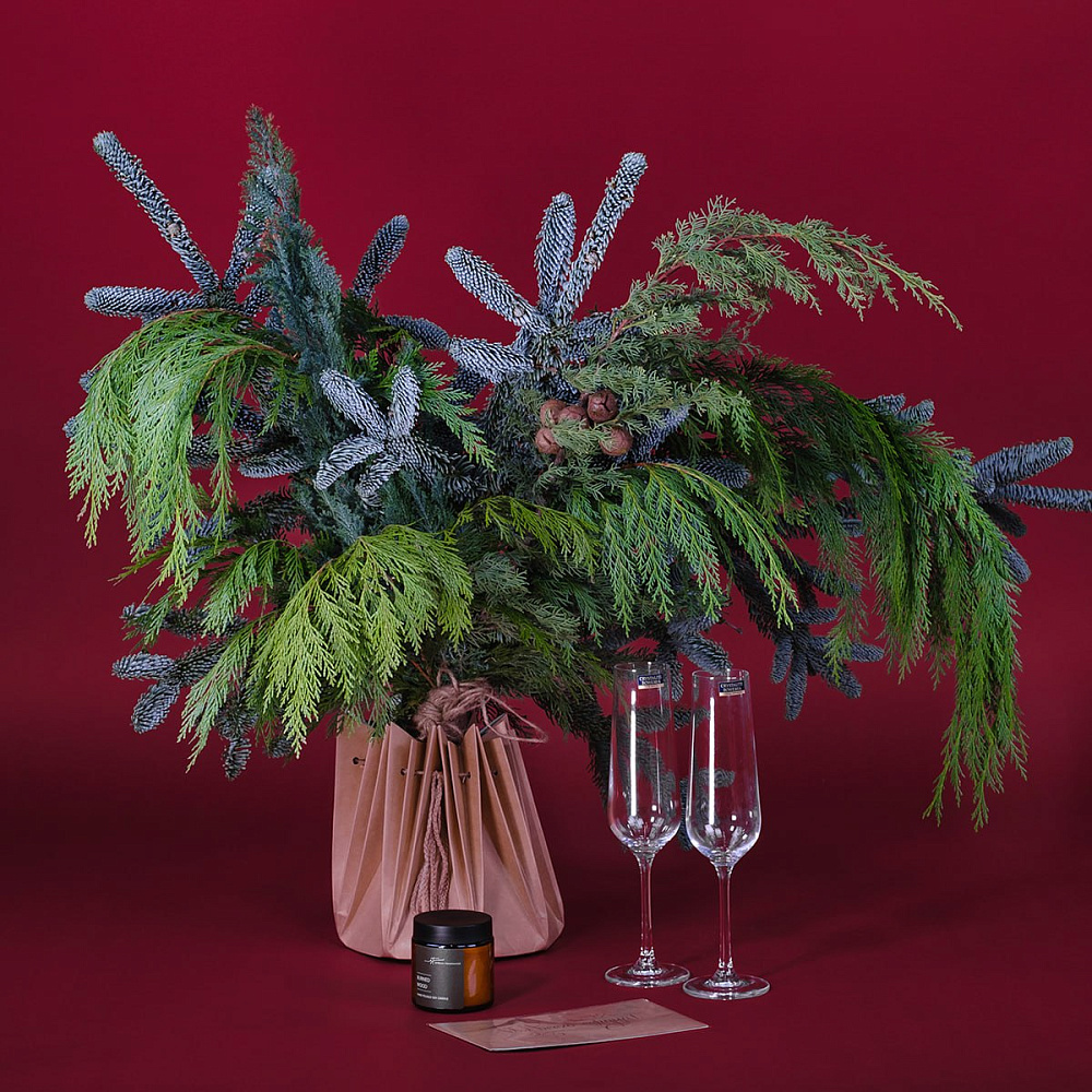 Букет «хвойный лес», свеча ароматическая, бокалы 2шт, аква бокс, коробка, стружка бумажная