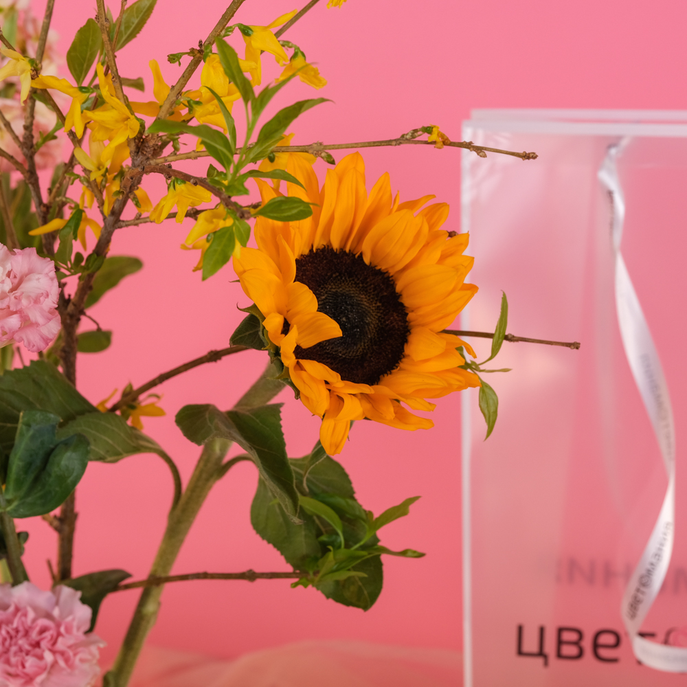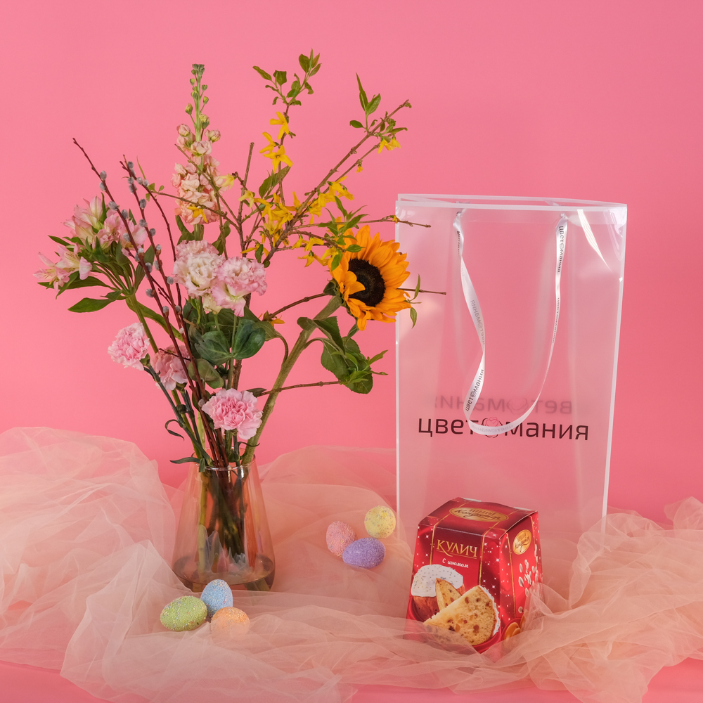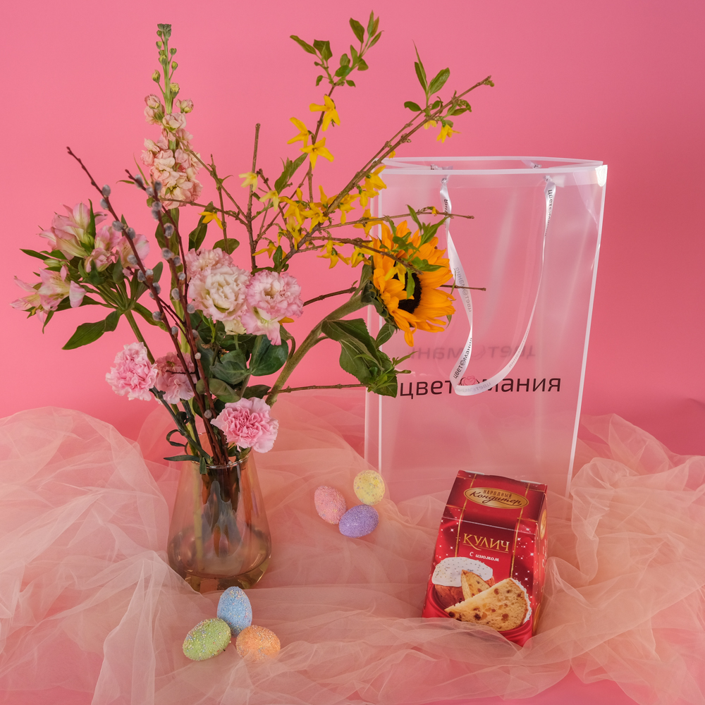 подсолнух 1, верба 2, форзиция 1, гвоздика 3, альстромерия 1, маттиола 1, эустома 1, ваза , кулич, декор яйцо 7, пакет