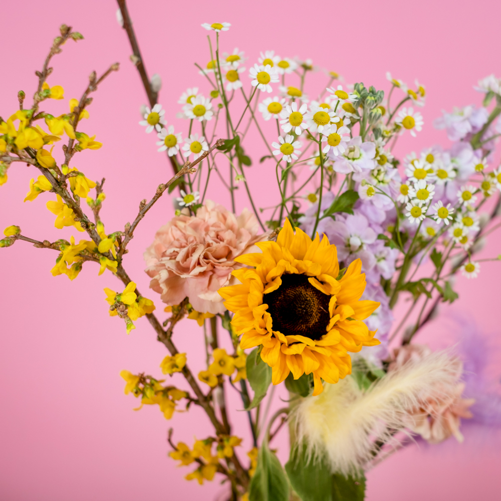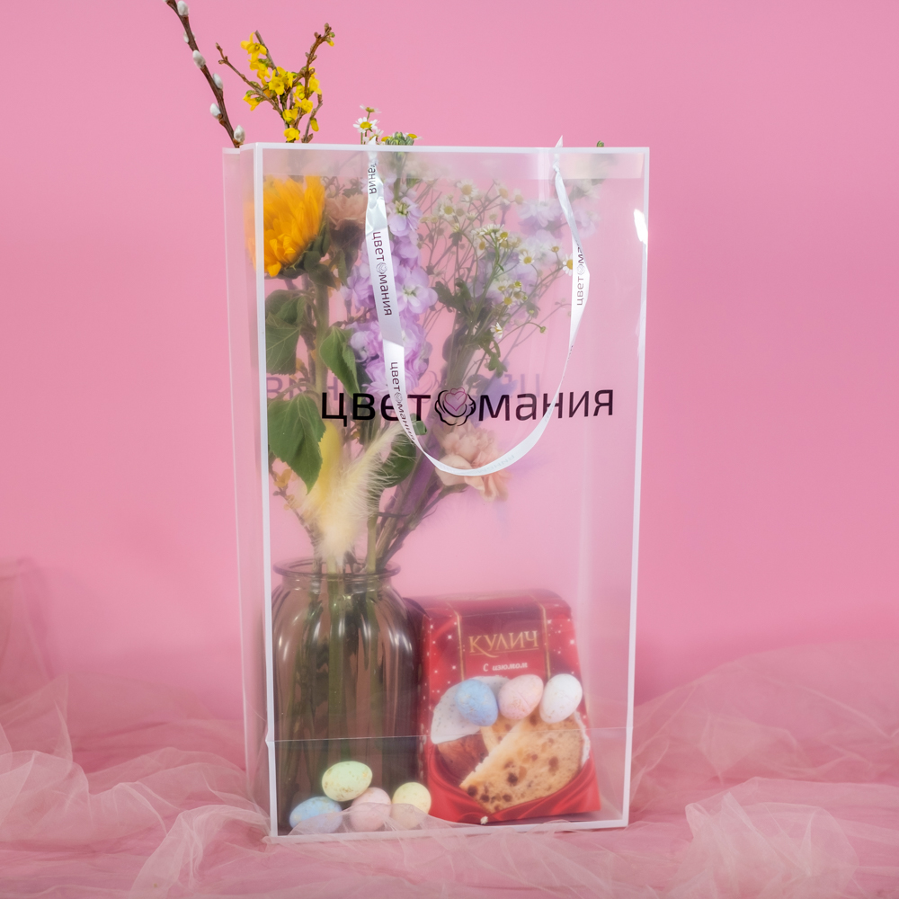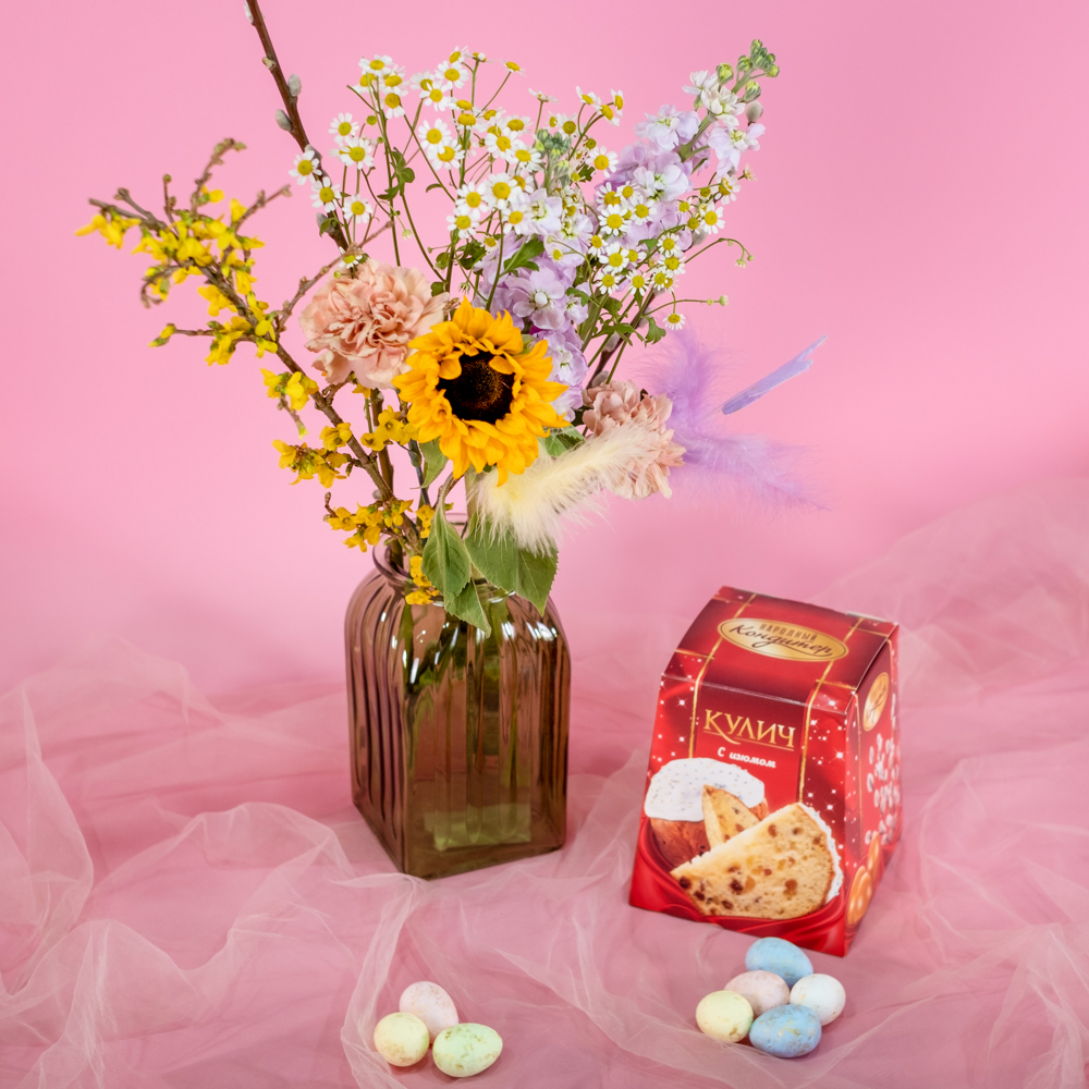 подсолнух 1, верба 2, форзиция 1, гвоздика 3, матрикария 2, маттиола 2, вставка курочка 2, ваза , кулич, декор яйцо 7, пакет