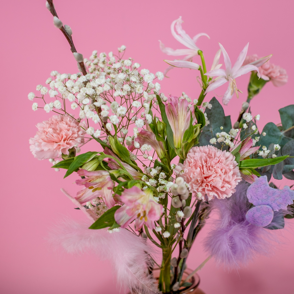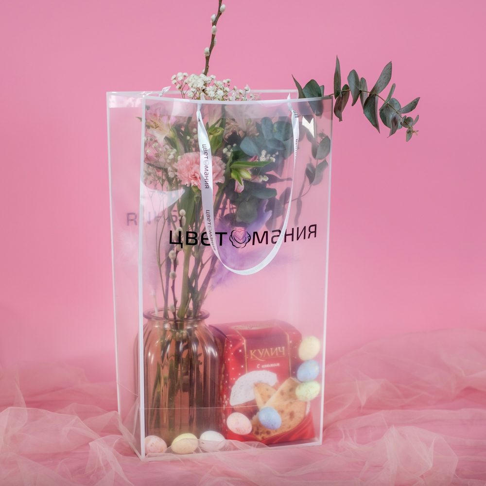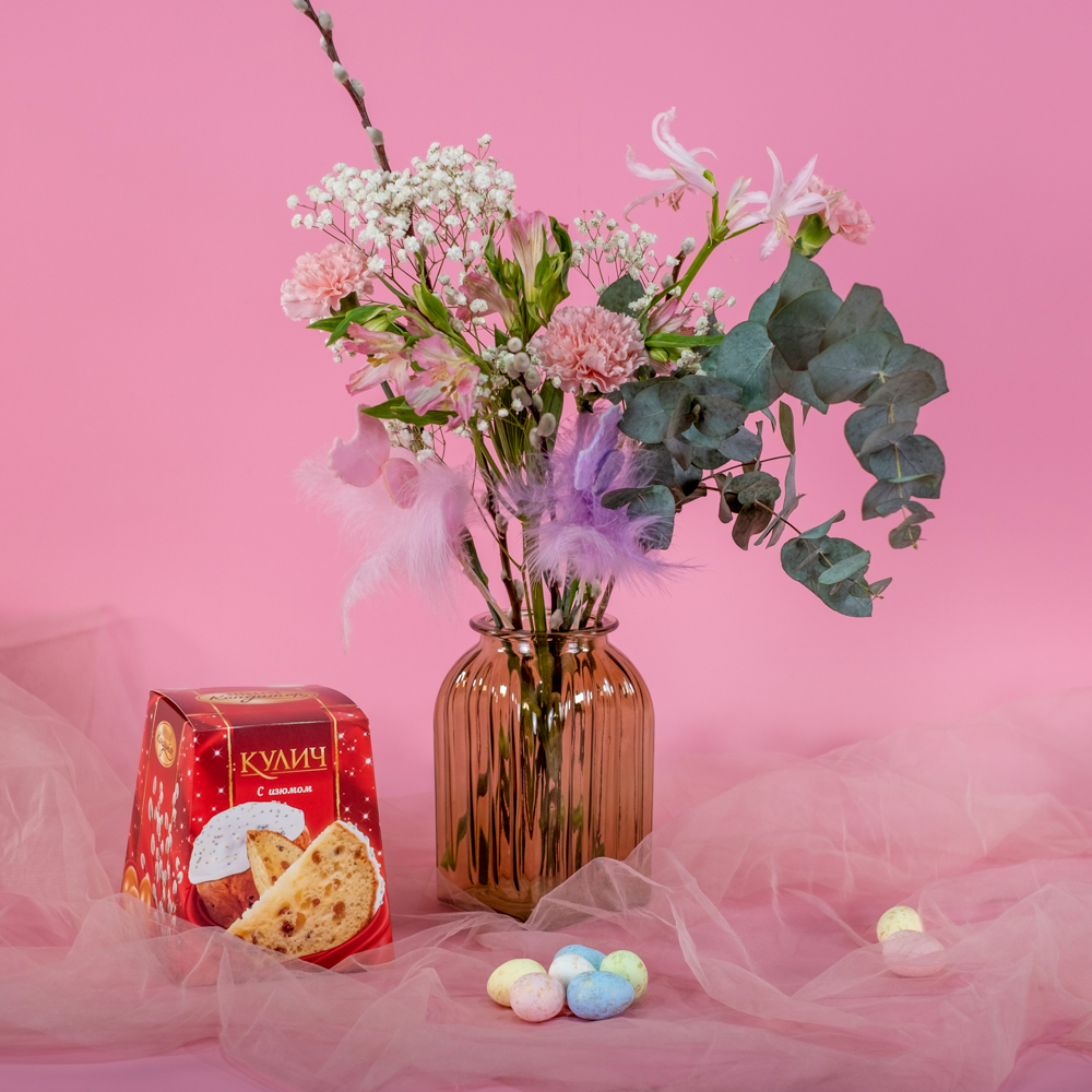 эвкалипт 1, нерине 1, гвоздика станд 3, гипсофила 1, альстромерия 1, ваза, кулич, яйца, пакет, вставка курочка