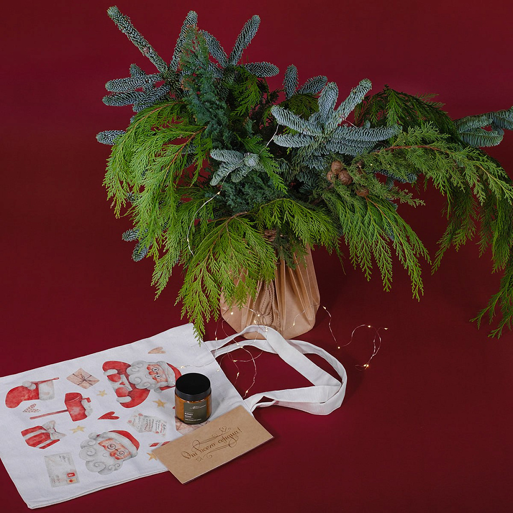 Букет из хвои Шоппер Свеча ароматическая Гирлянда роса Аква бокс коробка Стружка бумажная