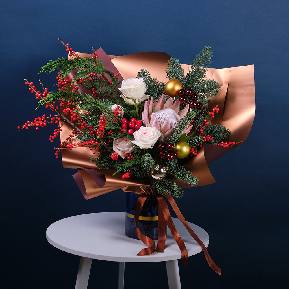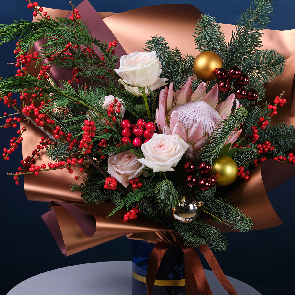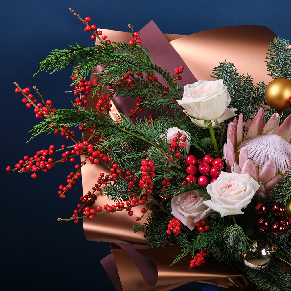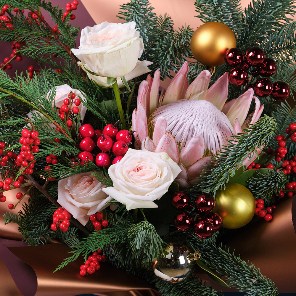 Илекс -3, протея цинаройдес -1, нобилис -1, Туя -1, украшение шар -11, шар (пластик 6шт) -3, ягоды на вставке -12, роза экуанрос freedom 50 - 5
