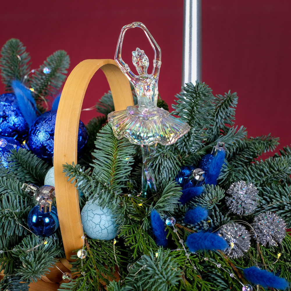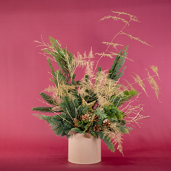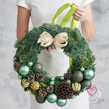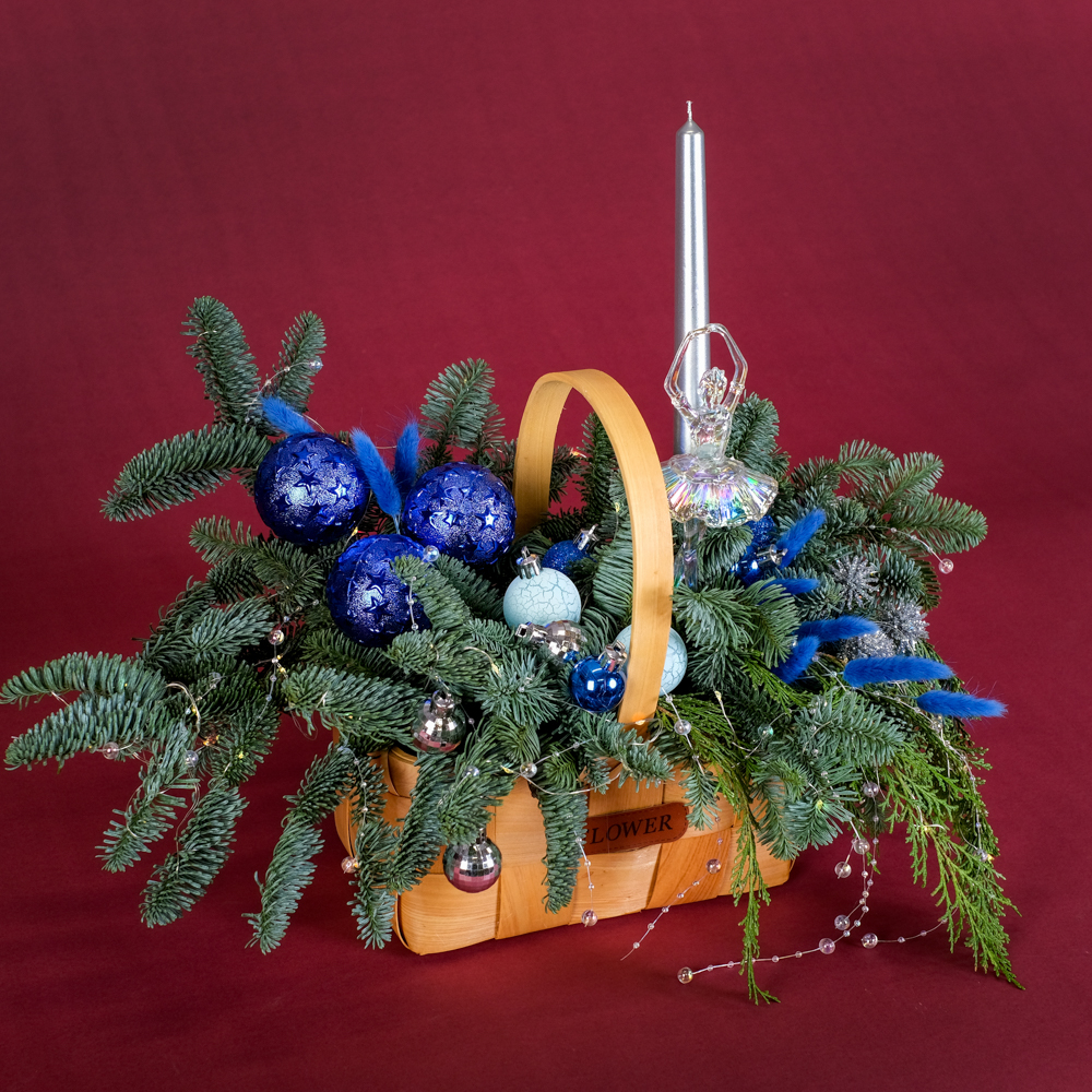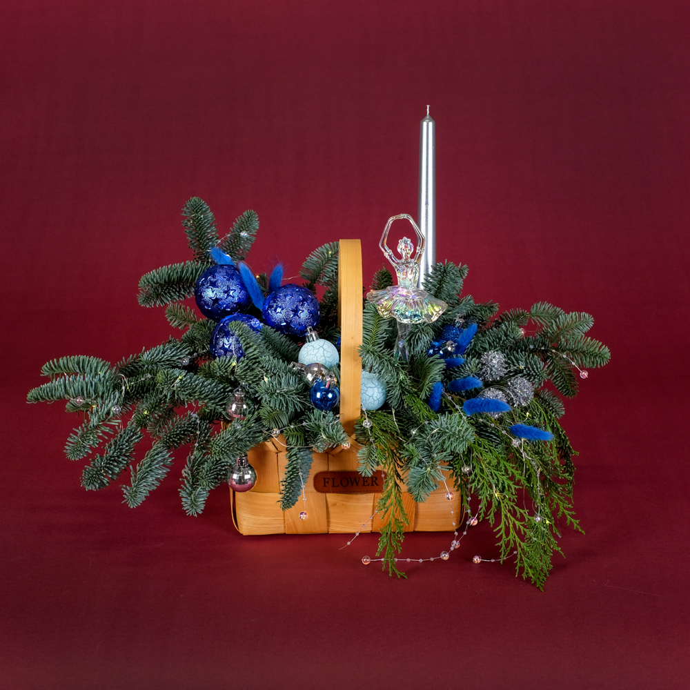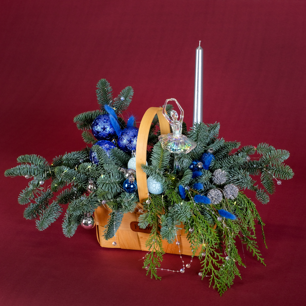 свеча античная Lumi серебро-0,4, оазис-3, елочное украшение шар-10, елочное украшение подвеска-1, шишки на проволоке с глиттером-3, бусы жемчужные 3мм+8мм*60-0,2, туя шелковая-1, корзина сквойя 23*5-1, лагурус 60шт. королевский-10, гирлянда Роса 5м-1, нобилис-1
