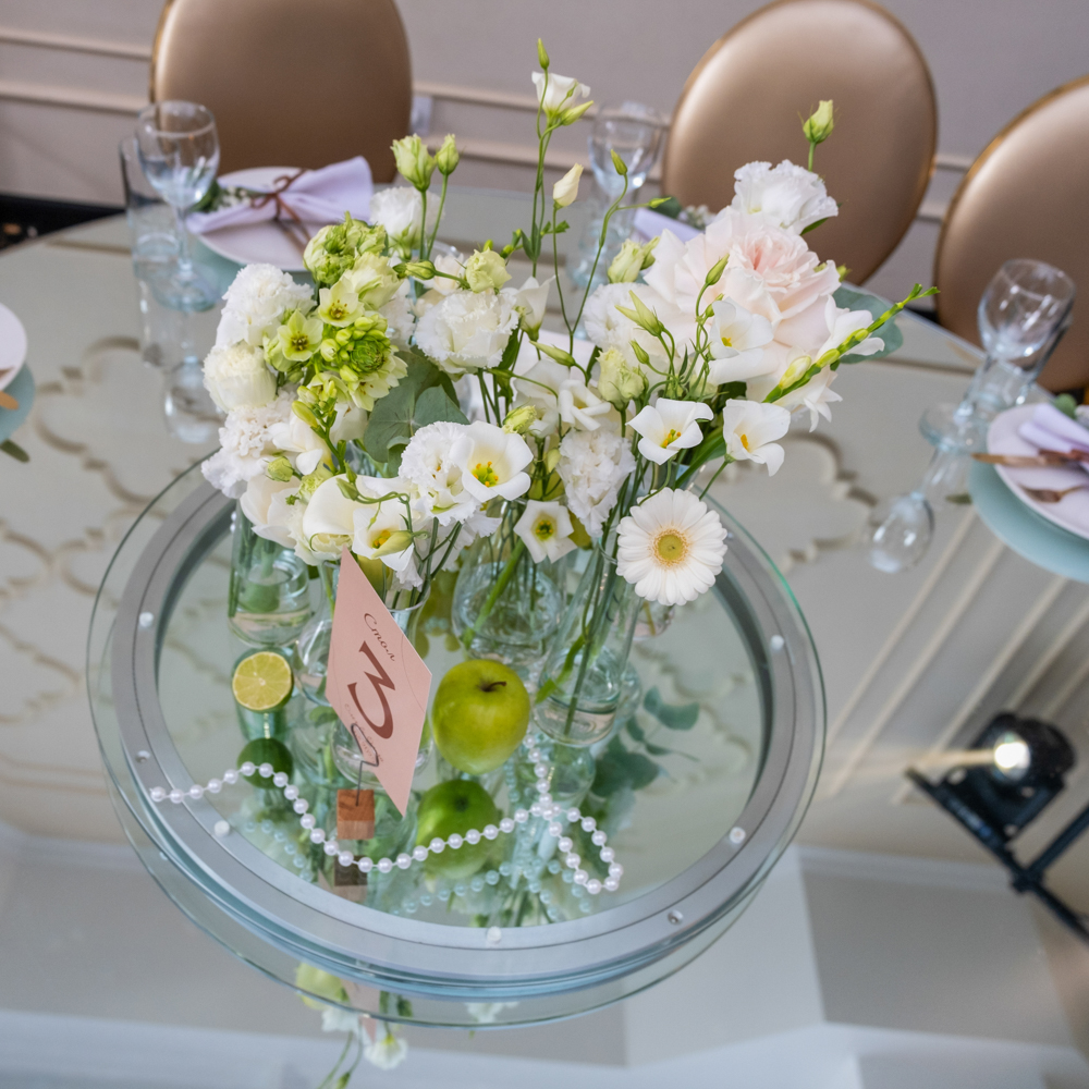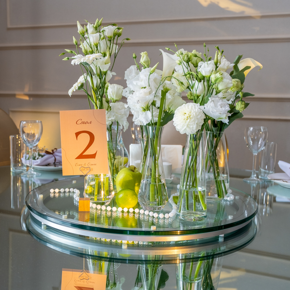 Наш сервис предлагает качественное цветочное сопровождение вашего торжества. Свежие цветы от прямых поставщиков и креатив топ-флористов сделают ваш праздник по-настоящему красивым и запоминающимся. Воплотим любые идеи в реальность! Указана минимальная стоимость оформления стола, рассчитывается в зависимости от количества и вида цветов и декора. Аренда ваз входит в стоимость. В нашем интернет-магазине большой ассортимент декора, есть возможность выбрать на свой вкус и взять в аренду на мероприятие за отдельную плату. Заказ можно оформить не позднее, чем за 2 недели до даты мероприятия.