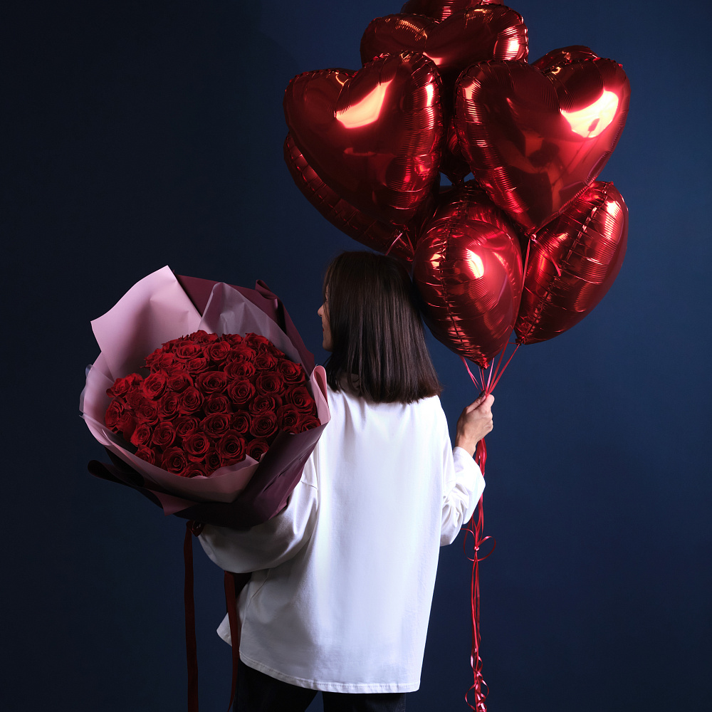 Подарите любимому человеку незабываемые эмоции! Этот роскошный набор состоит из 9 шаров в форме сердца красного цвета и 51 красной розы Эквадор 70 см. Шары и розы - символы любви, страсти и романтики. Они создадут атмосферу праздника и уюта, порадуют глаз и душу. Этот набор идеально подходит для дня рождения, юбилея, свадьбы, дня святого Валентина или просто для выражения своих чувств.Упаковка может незначительно отличаться.
