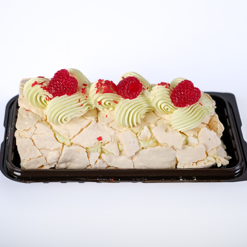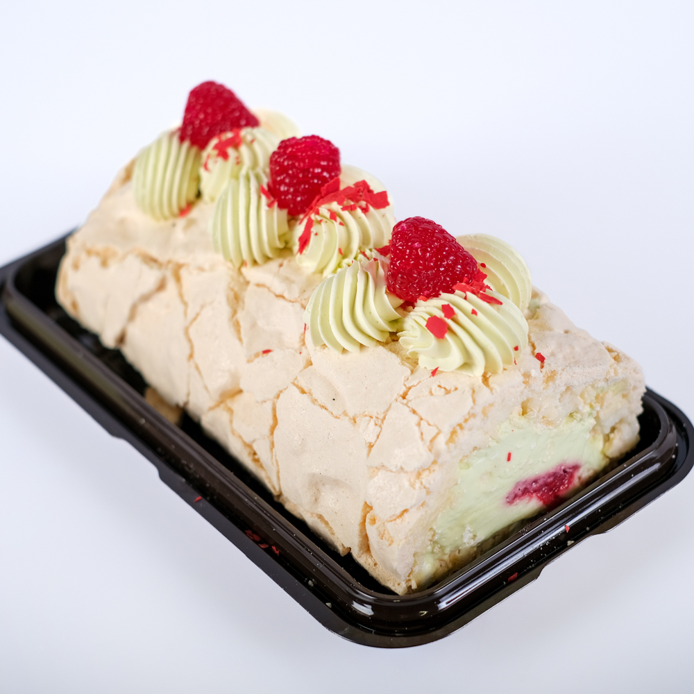 Рулет из воздушного, лёгкого хрустящего безе с прослойкой из нежного фисташкового крема и протертой с сахаром малины.