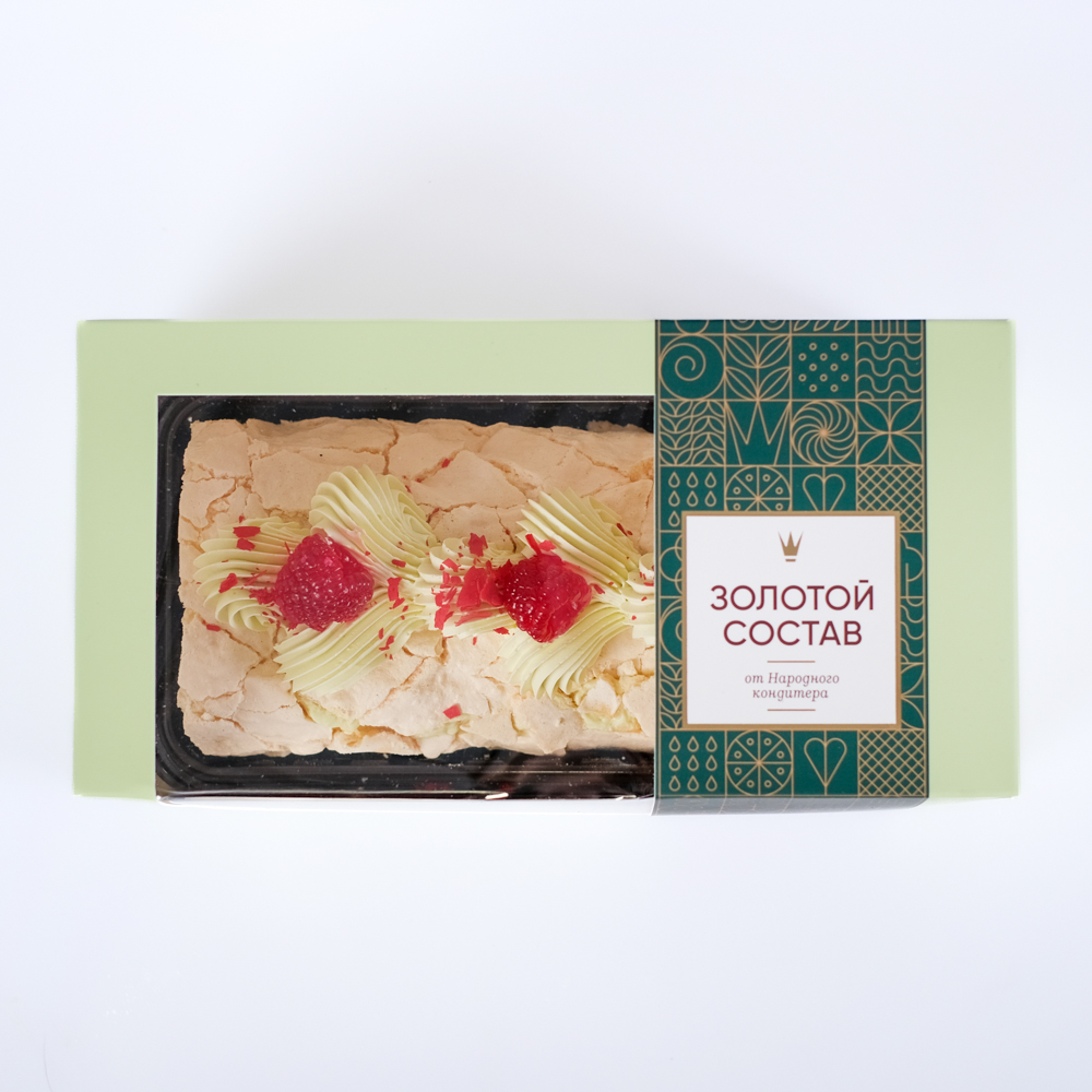 Безе: сахар- песок, белок яичный, крахмал кукурузный, регулятор кислотности лимонная кислота, соль. Крем: сливки молочные 33% (сливки нормализованные), сыр сливочно-творожный (творог (нормализованное пастеризованное молоко, бактериальная закваска, молокосвертывающий фермент микробного происхождения), малина с/м, сгущенное молоко цельное ( молоко, сахар), фисташковая начинка (ядра орехов фисташки обжаренные, ядра орехов миндаля обжаренные, сахар-песок, загуститель пектин, ароматизатор натуральный ваниль. Украшение: масло сливочное несоленое 82,5% (пастеризованные сливки), сгущенное молоко цельное (молоко, сахар), ароматизатор натуральный ваниль.