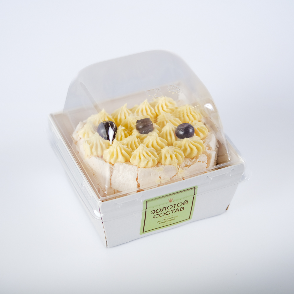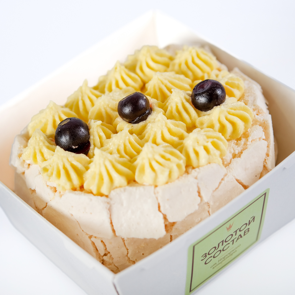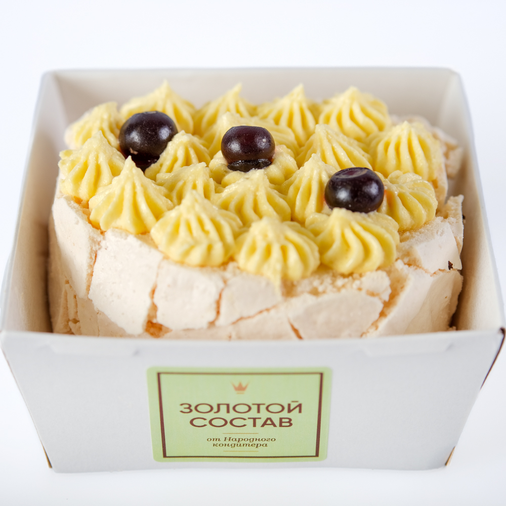Безе: сахар- песок, белок яичный, крахмал кукурузный, регулятор кислотности лимонная кислота, соль. Крем: сливки молочные 33% (сливки нормализованные), сыр сливочно-творожный (творог (нормализованное пастеризованное молоко, бактериальная закваска, молокосвертывающий фермент микробного происхождения), сгущенное молоко цельное (молоко, сахар), джем манго- маракуйя (пюре манго (манго, сахар-песок), пюре маракуйи (маракуйя, сахар-песок), загуститель пектин, ароматизатор натуральный ваниль. Украшение: масло сливочное несоленое 82,5% (пастеризованные сливки), сгущенное молоко цельное (молоко, сахар), ароматизатор натуральный ваниль.