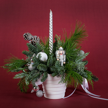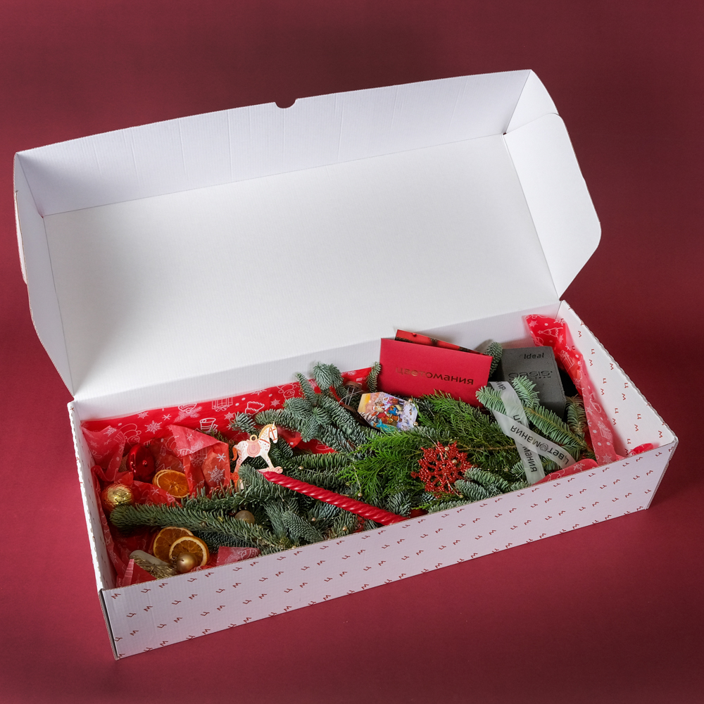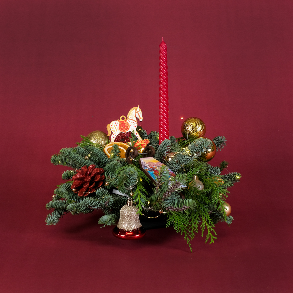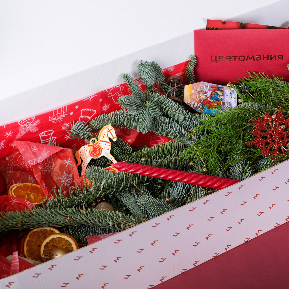 нобилис 1, туя 0,5, свеча витая 1, шар d2 3, шар d5 3, гирлянда роса 5 м 1, подвеска саночки 1, шишка в глиттере 1, бусы жемчужные 0,1, подвеска конь 1, колокольчик 1, апельсин сушеный 4, снежинка 1, оазис 1, коробка, тишью