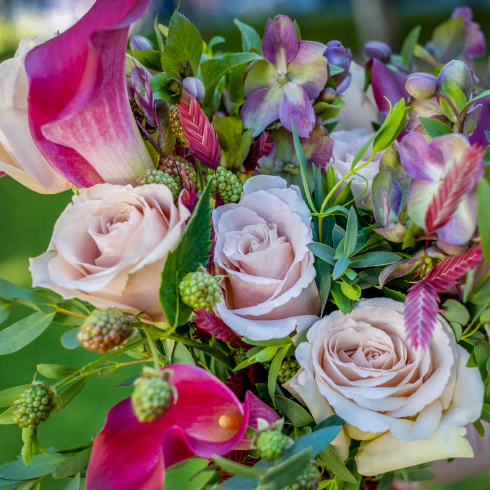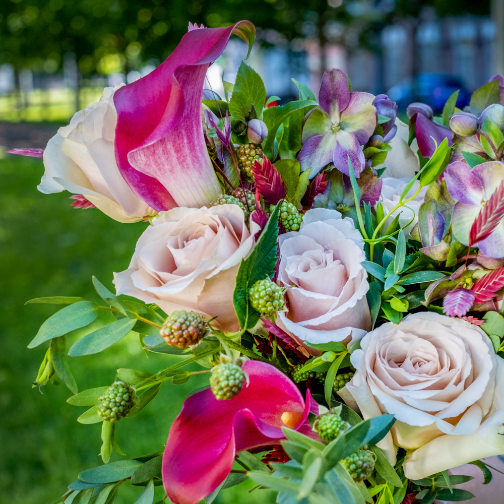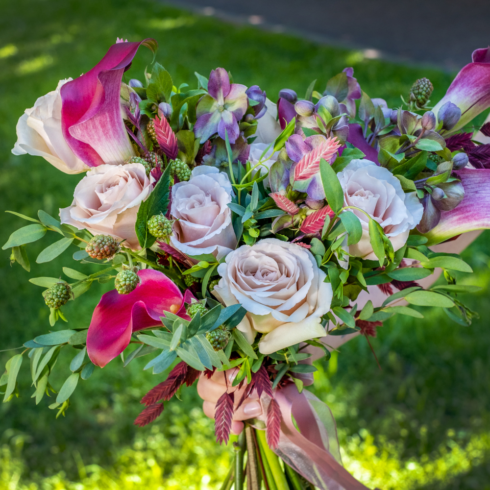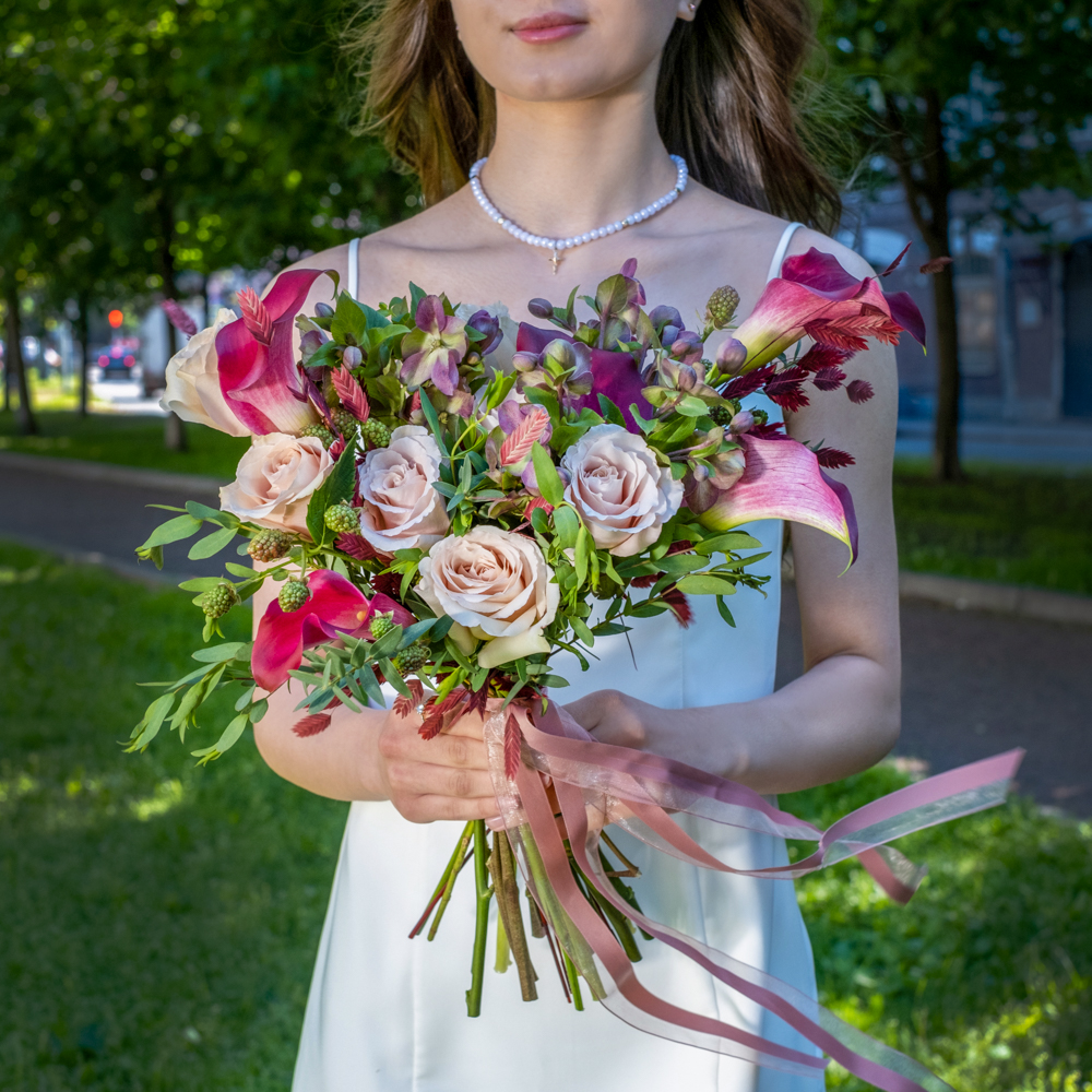 Состав букета: каллы 5, хелеборус 3, рубус 3, роза Эквадор 7, сухоцветы хасмантиум 2, эвкалипт 2, лента атласная