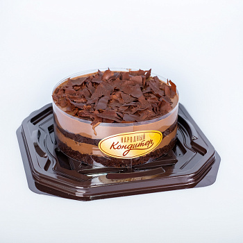 Паровой шоколадный бисквит, мусс на основе молочного шоколада с добавлением молочных сливок. Сверху торт украшен стружкой из бельгийского шоколада.